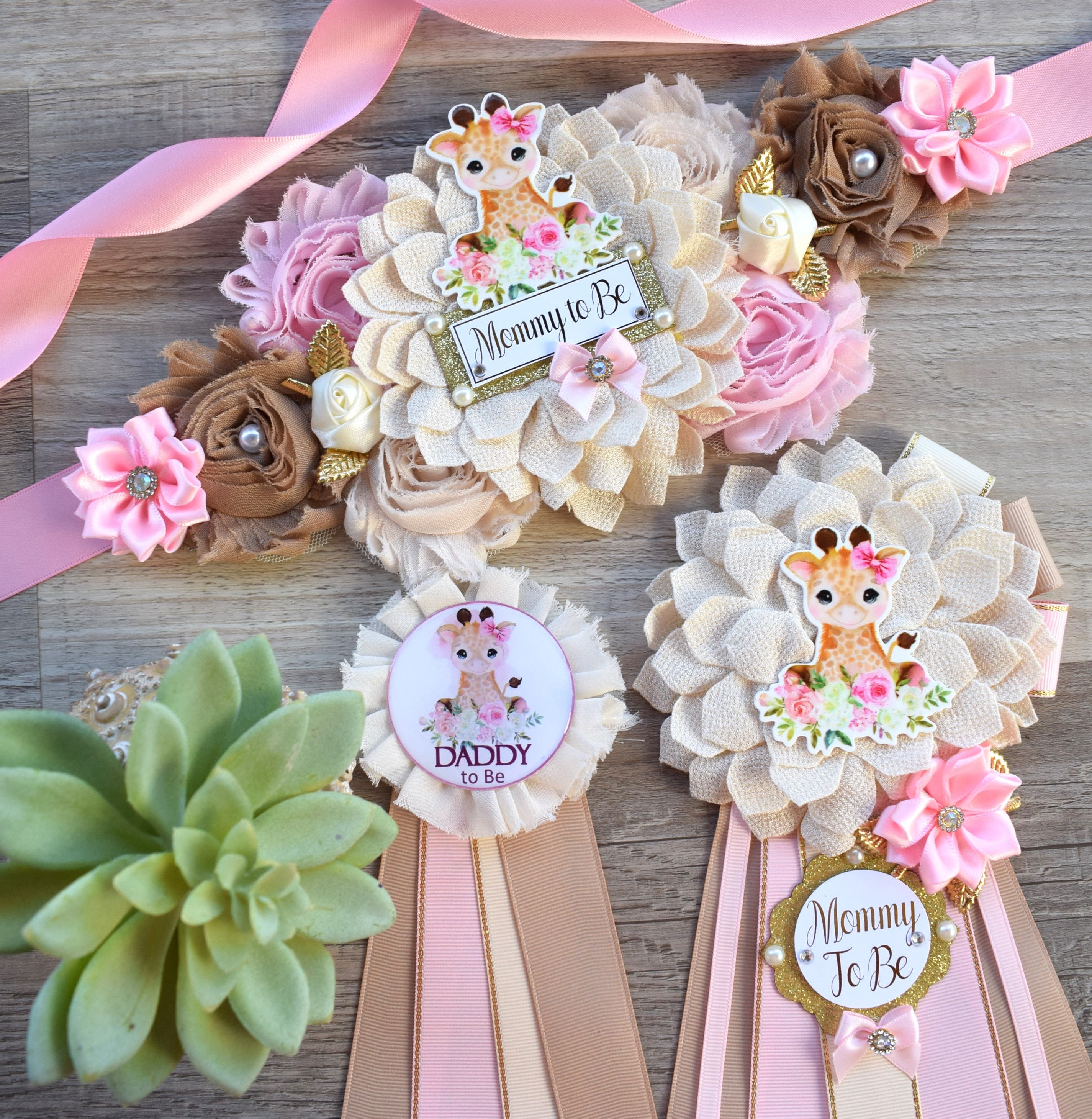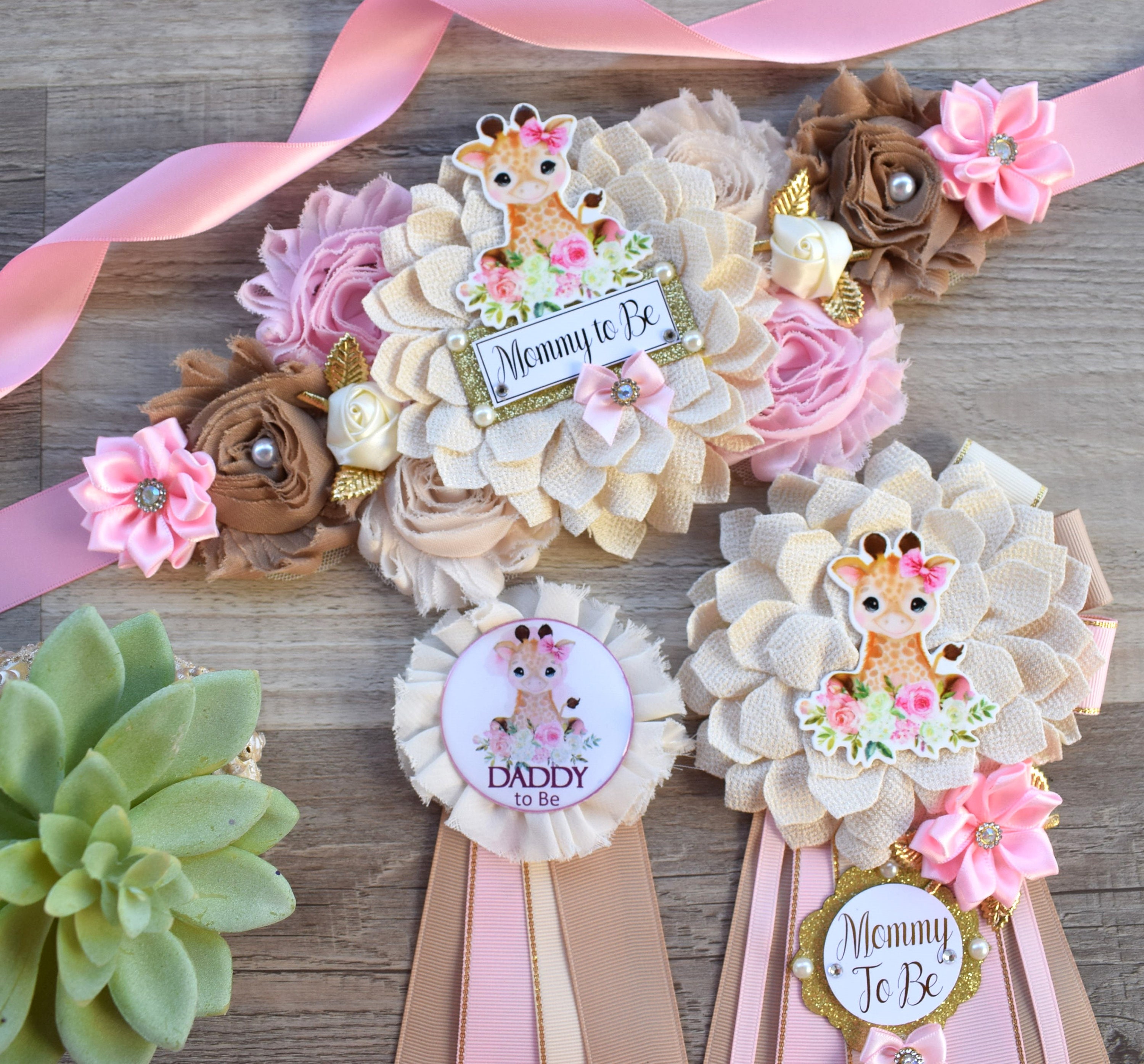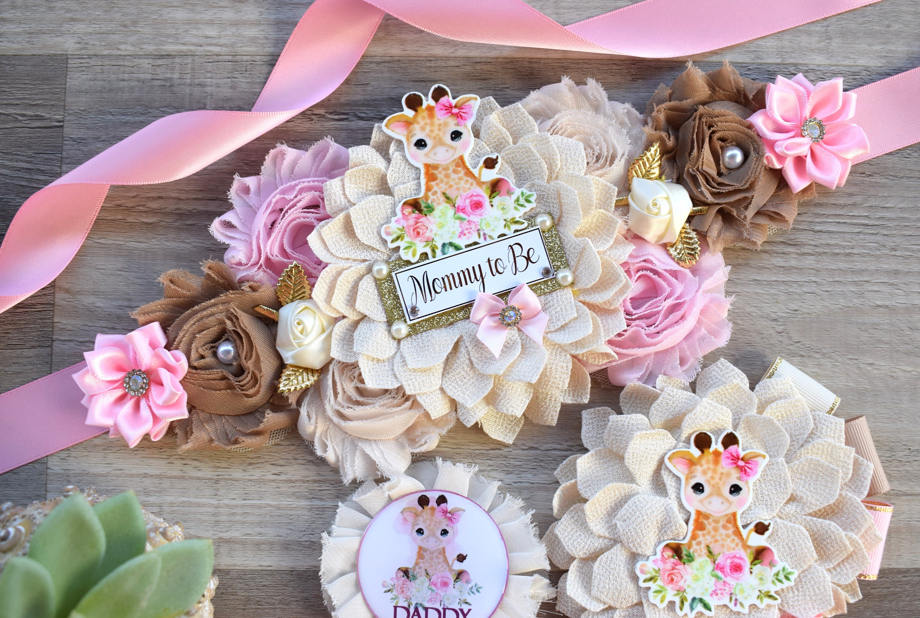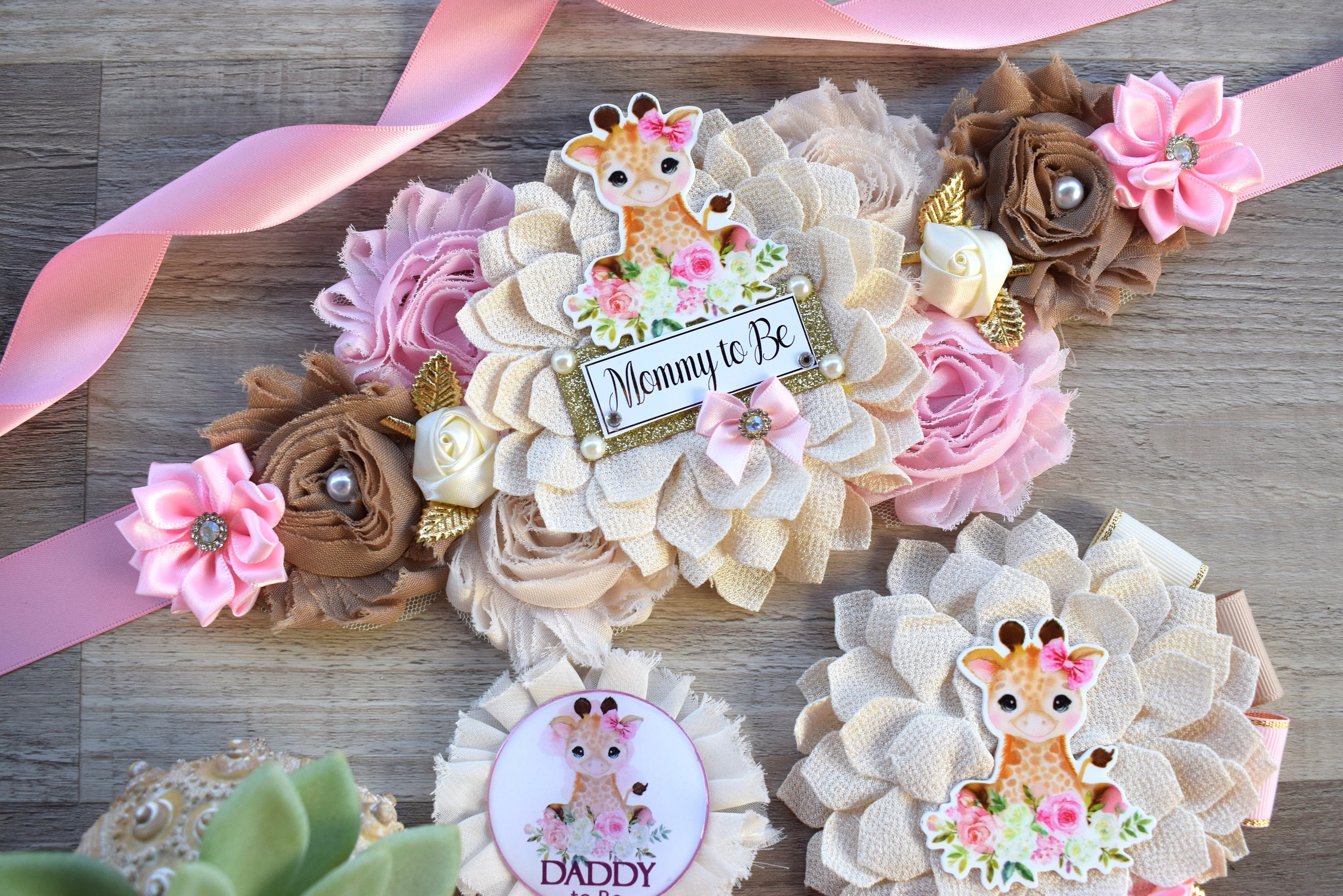 Giraffe Baby Shower, Giraffe Maternity Sash, Girl Giraffe Mommy and Daddy To Be Pin, Pink Flower Sash, Safari Giraffe Corsage Pin, Giraffe