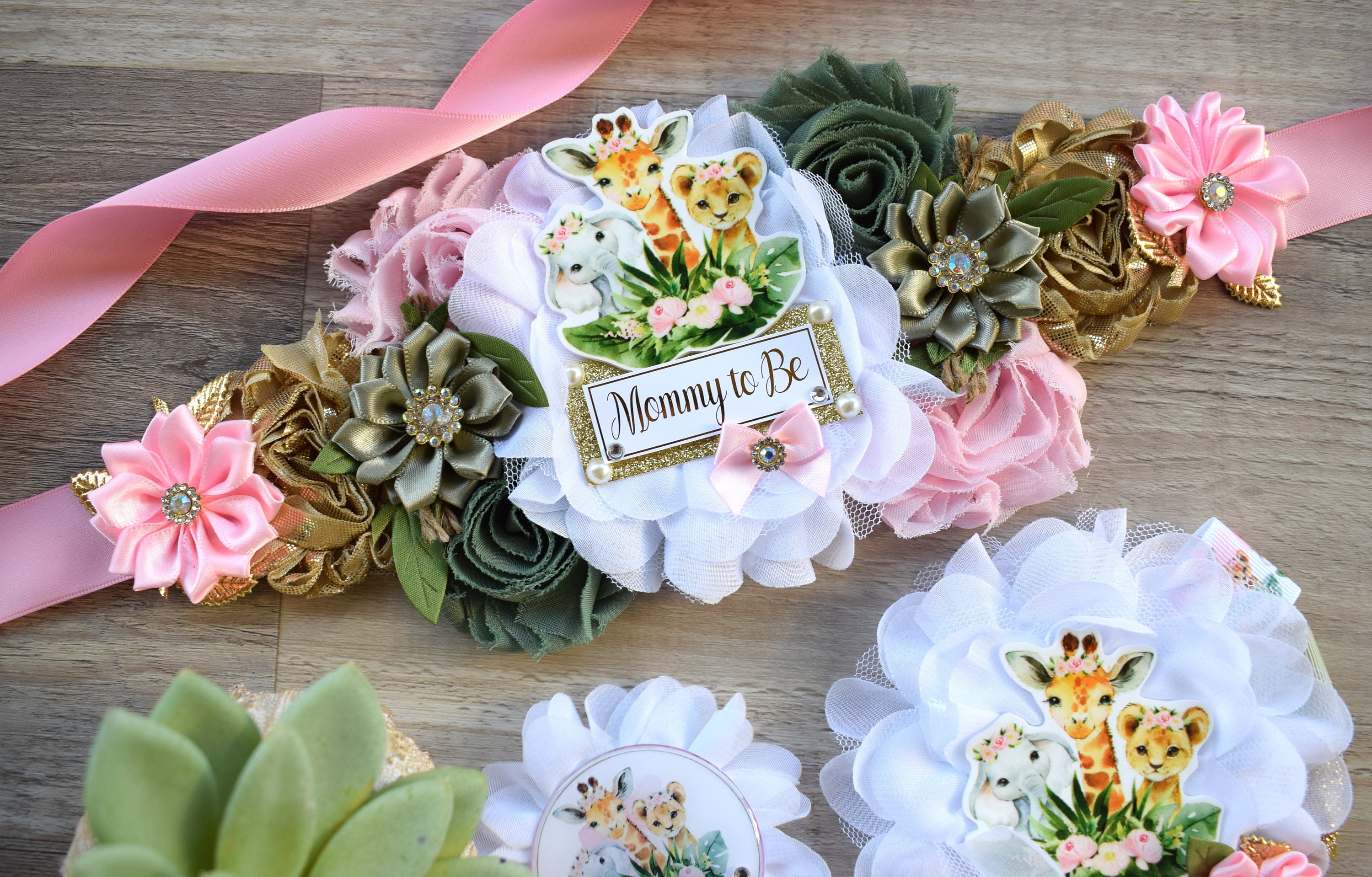 ☆ Maternity Sash: This has eleven flowers in safari theme colors embellished with rhinestones and pearls. Additionally, this sash is decorated with safari animals. The ribbon sash is 80'' (2 meters) long.