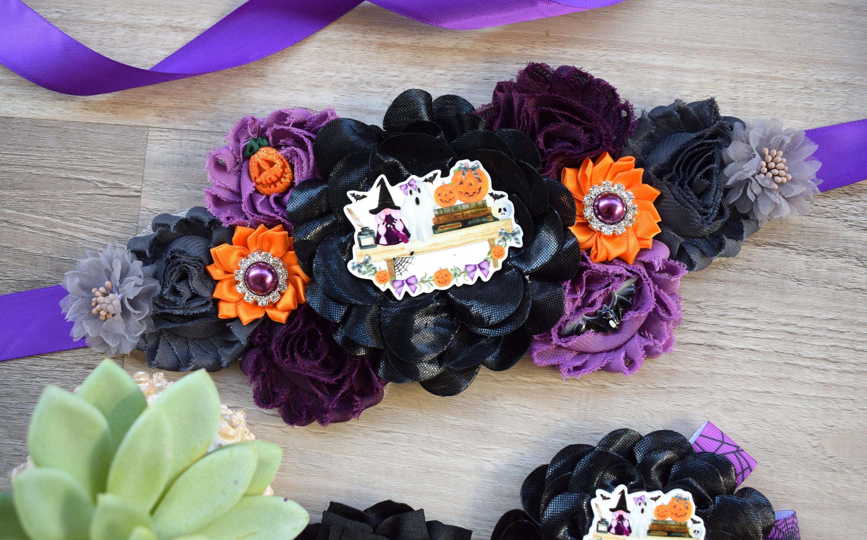 * Maternity Sash: It has eleven beautiful flowers in Purple, Grey, Orange & Black colors embellished with rhinestones and pearls. The ribbon sash is 80'' (2 meters) long.