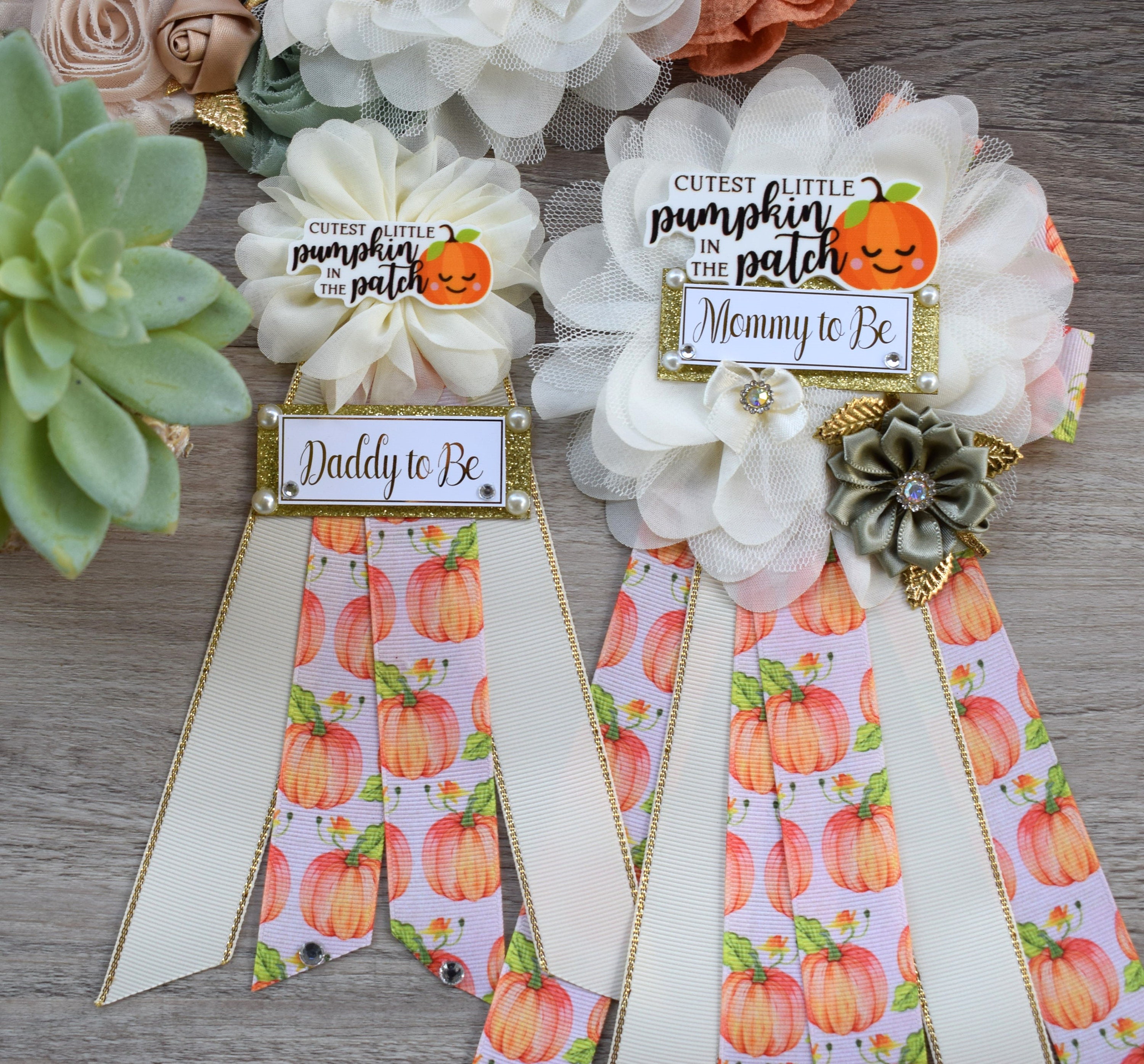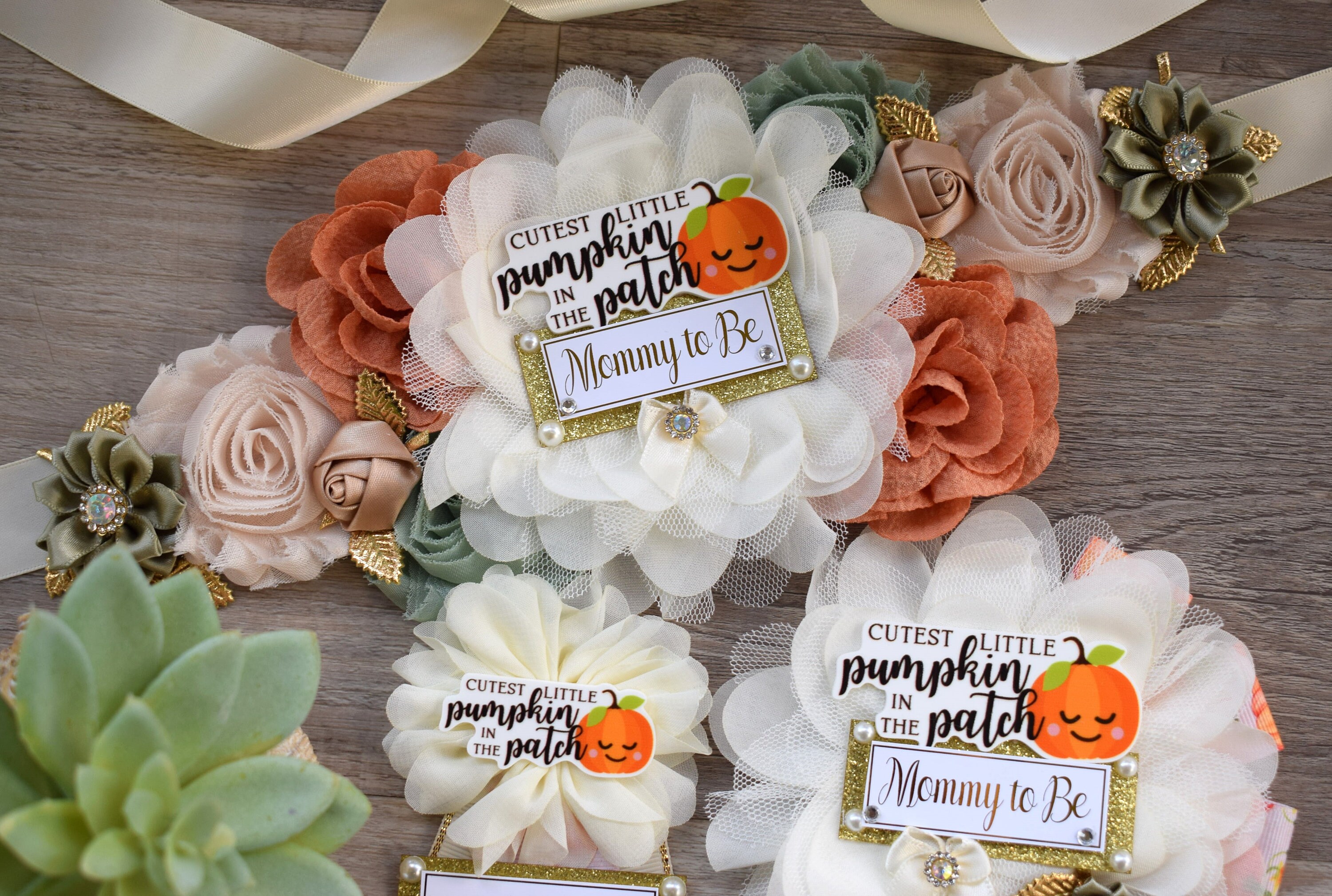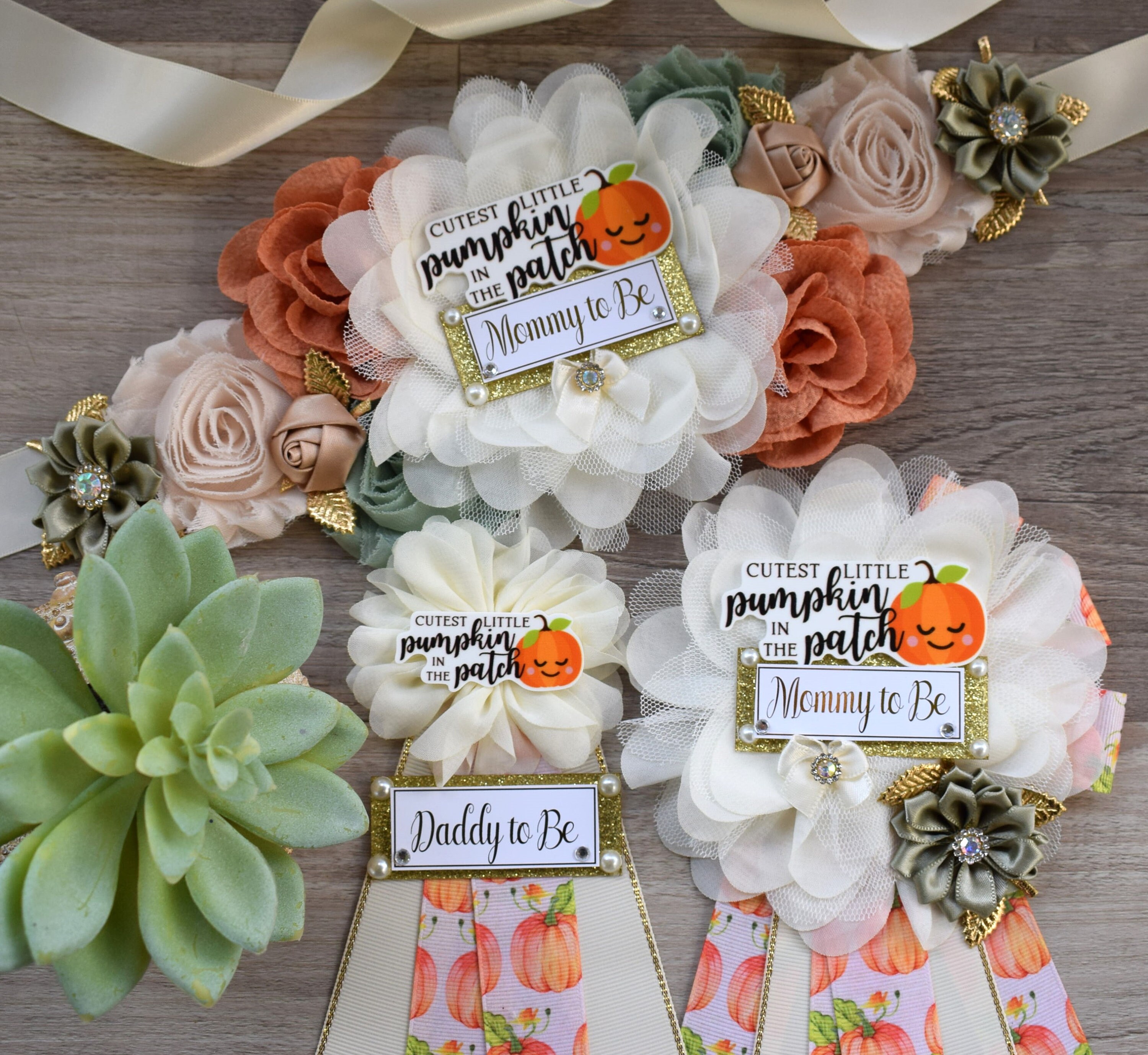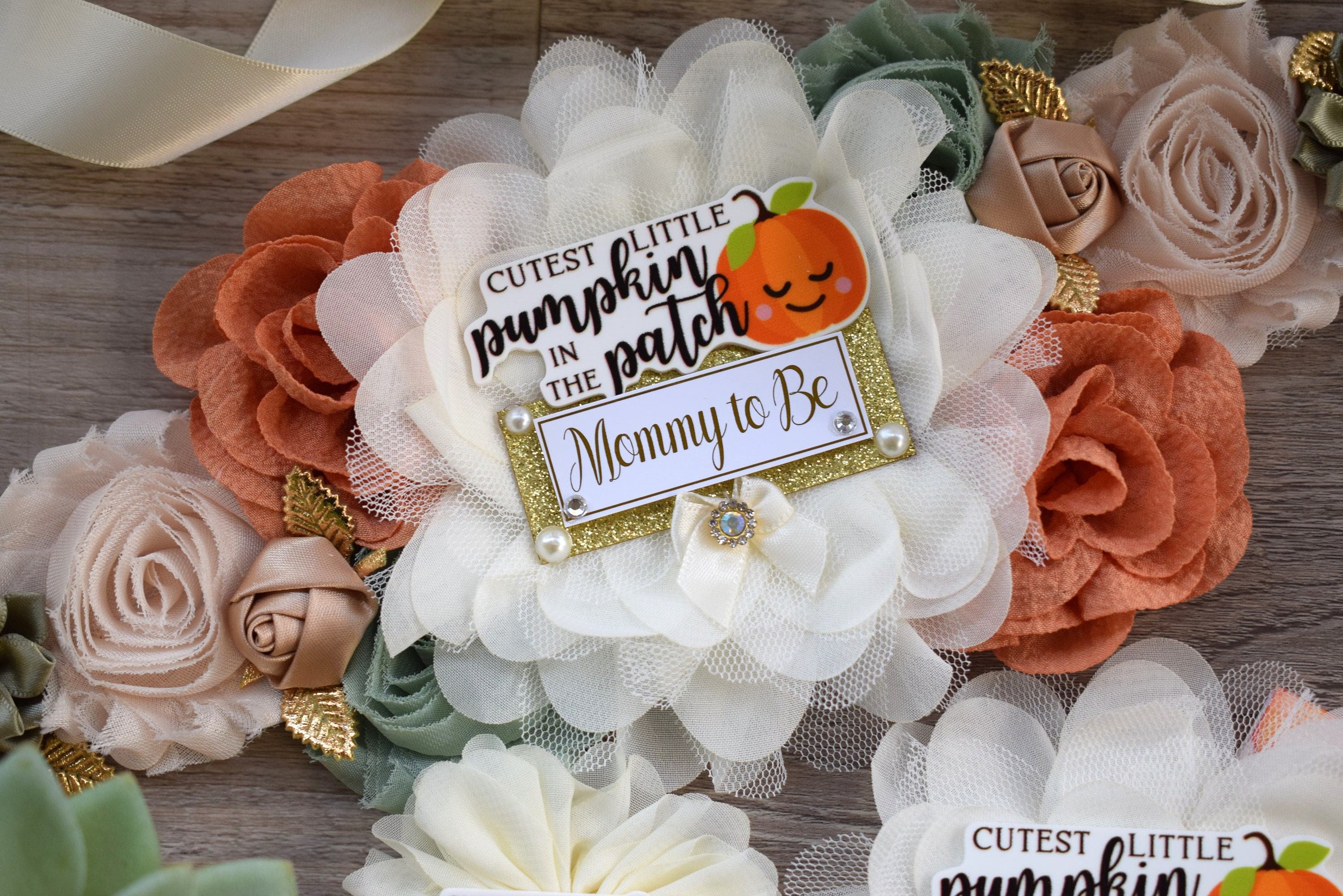 Cutest Little Pumpkin In The Patch Baby Shower, Ivory Orange Sage Maternity Sash, Pumpkin Mommy To Be Ribbon, Pumpkin Daddy To Be Pin