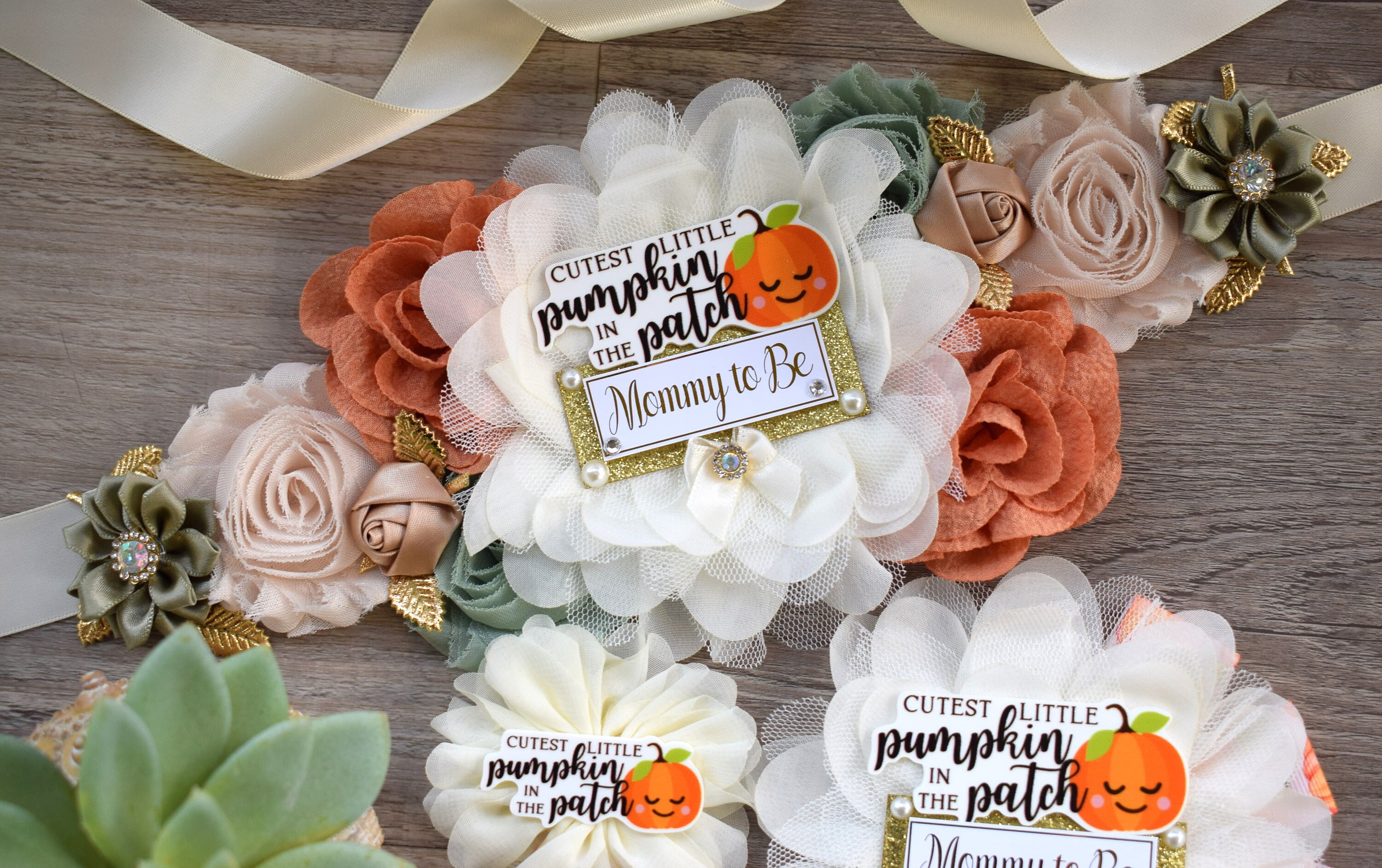 This Gorgeous Pumpkin Sash & Pins Set was made especially for a Baby Shower or a Photo Prop.