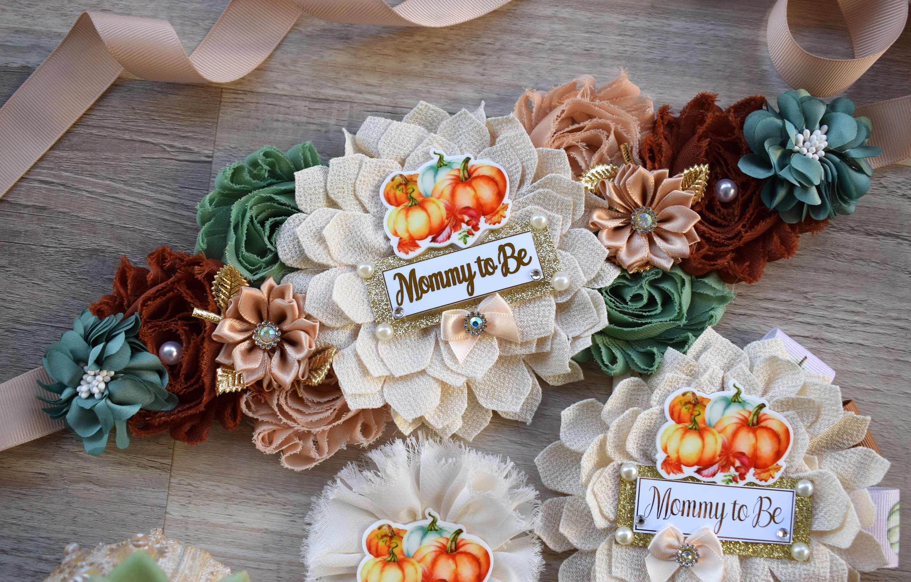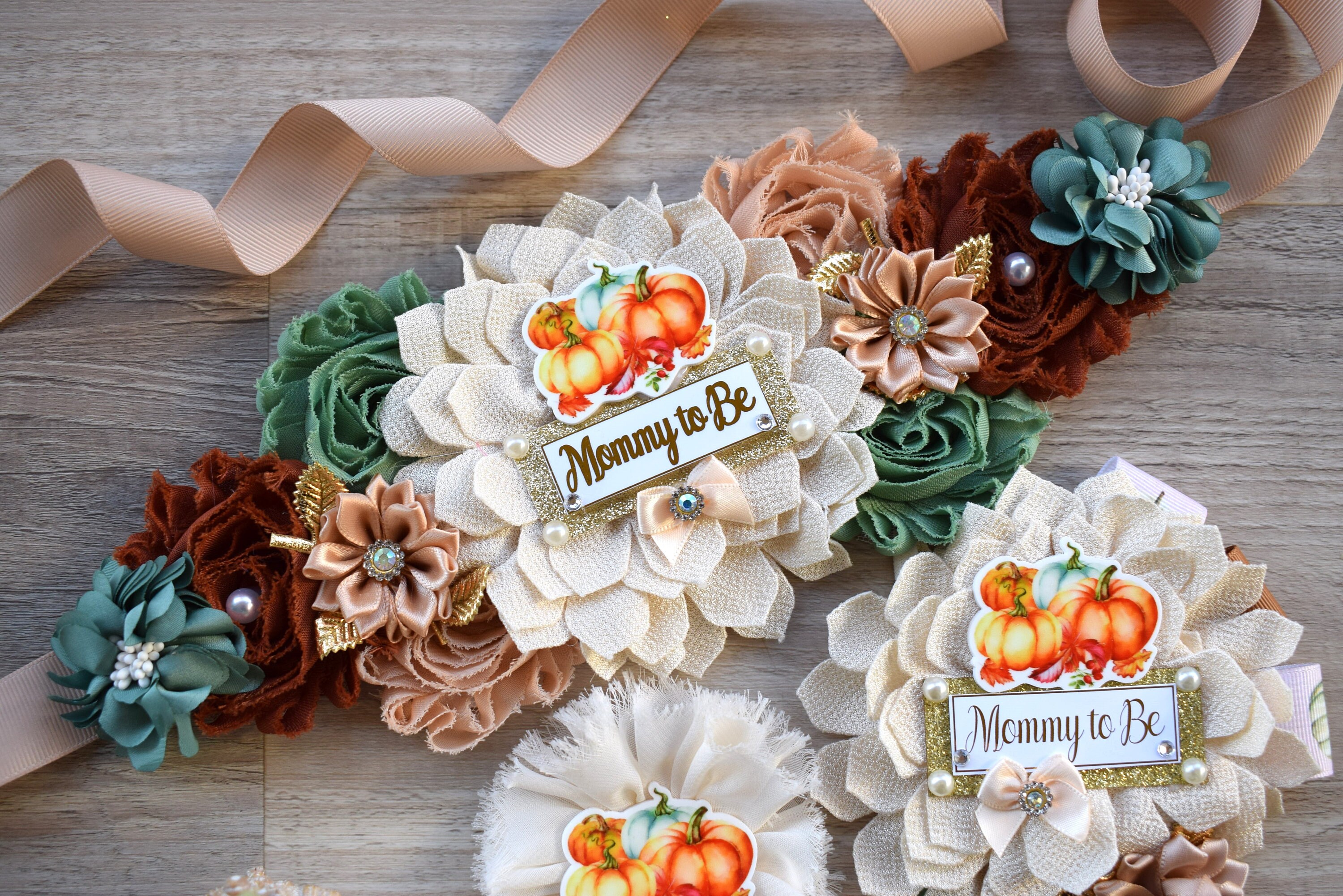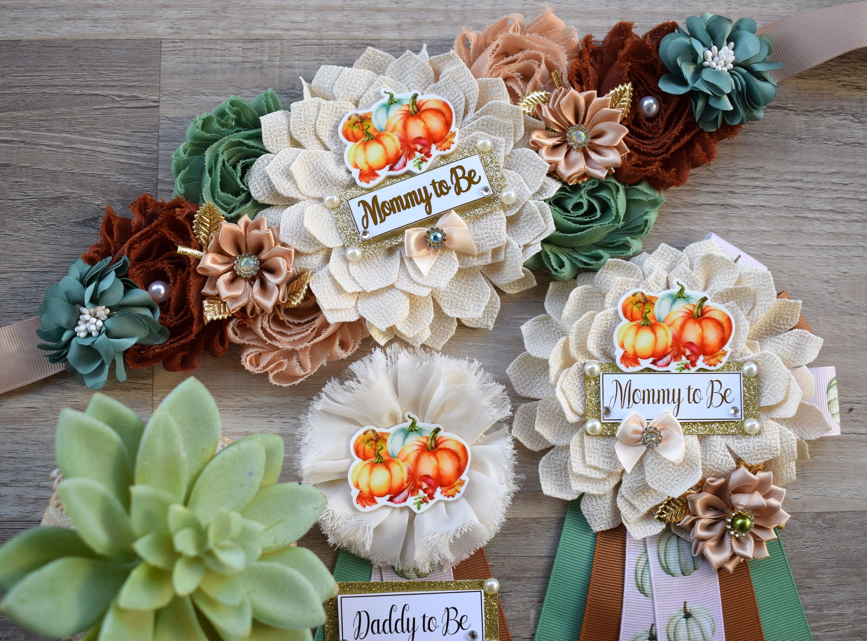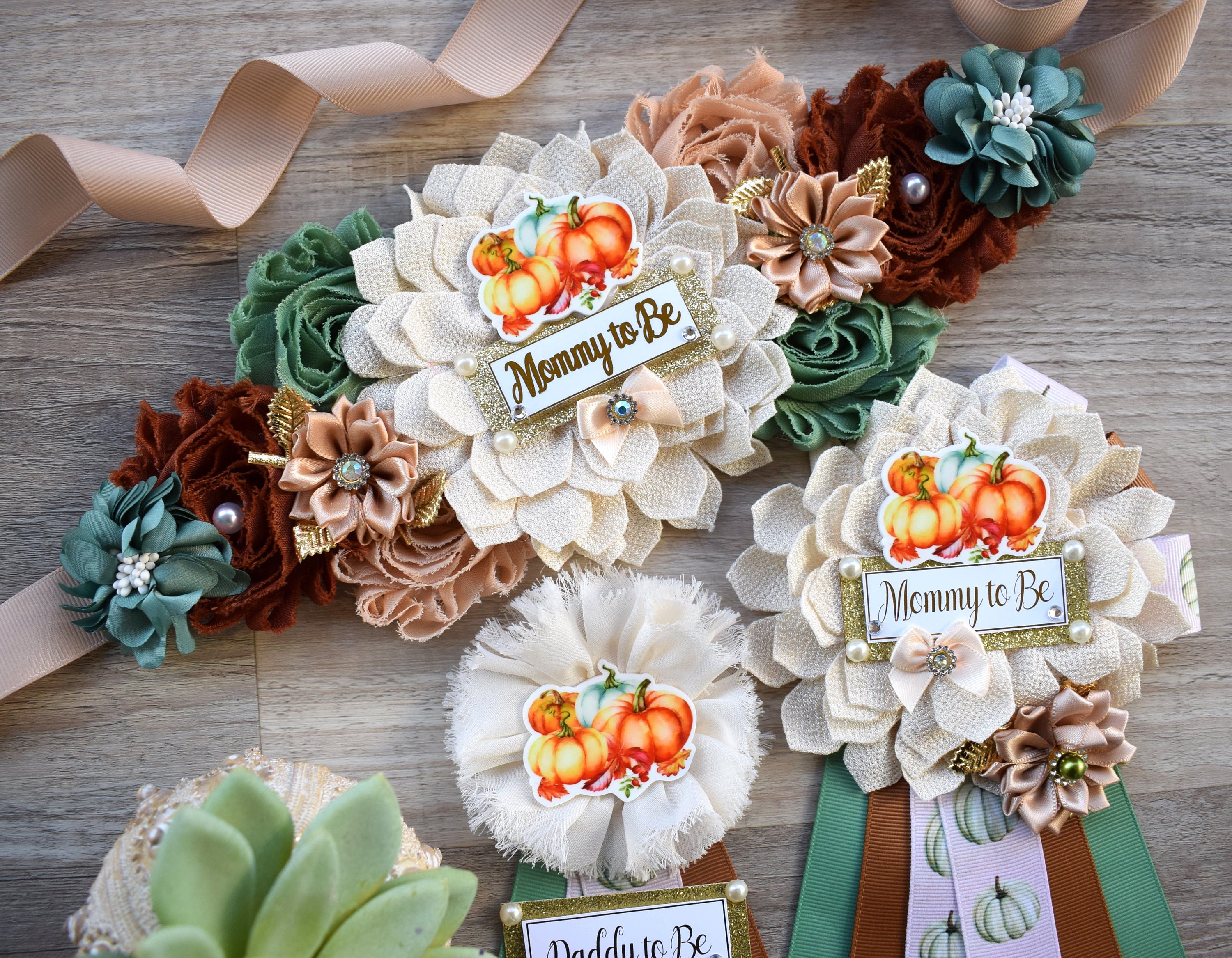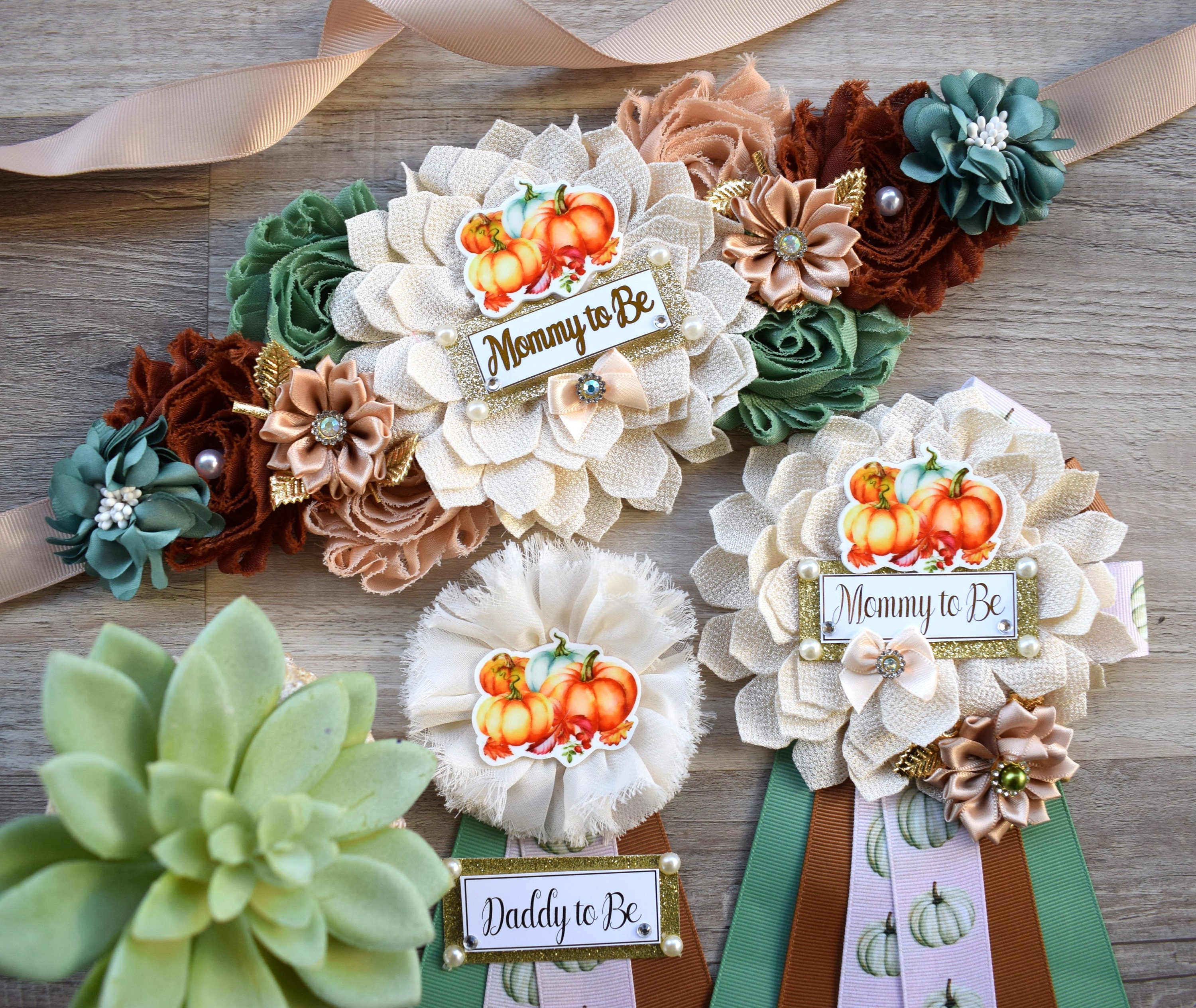 This Gorgeous Pumpkin Sash & Pins Set were made especially for a Baby Shower or a Photo Prop.
