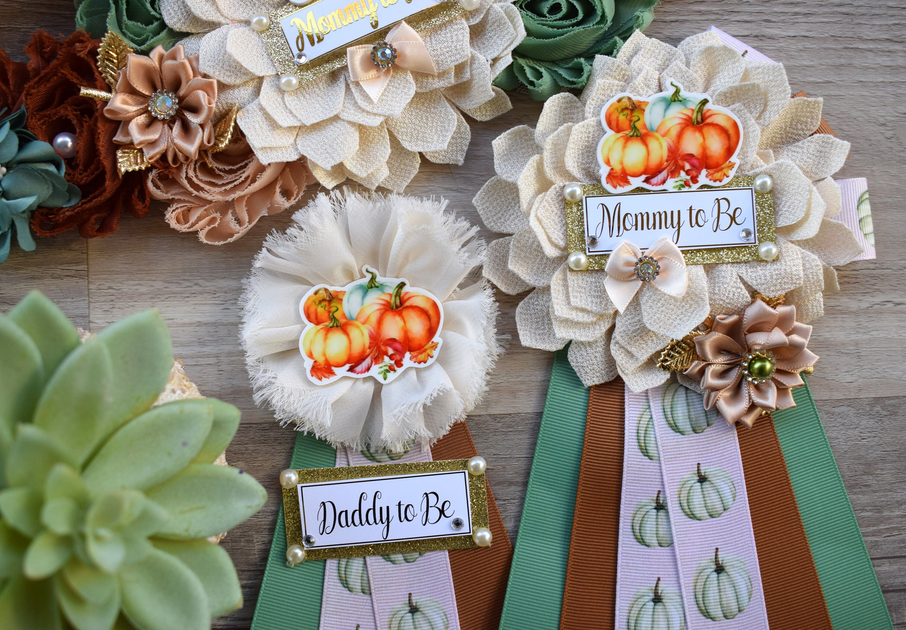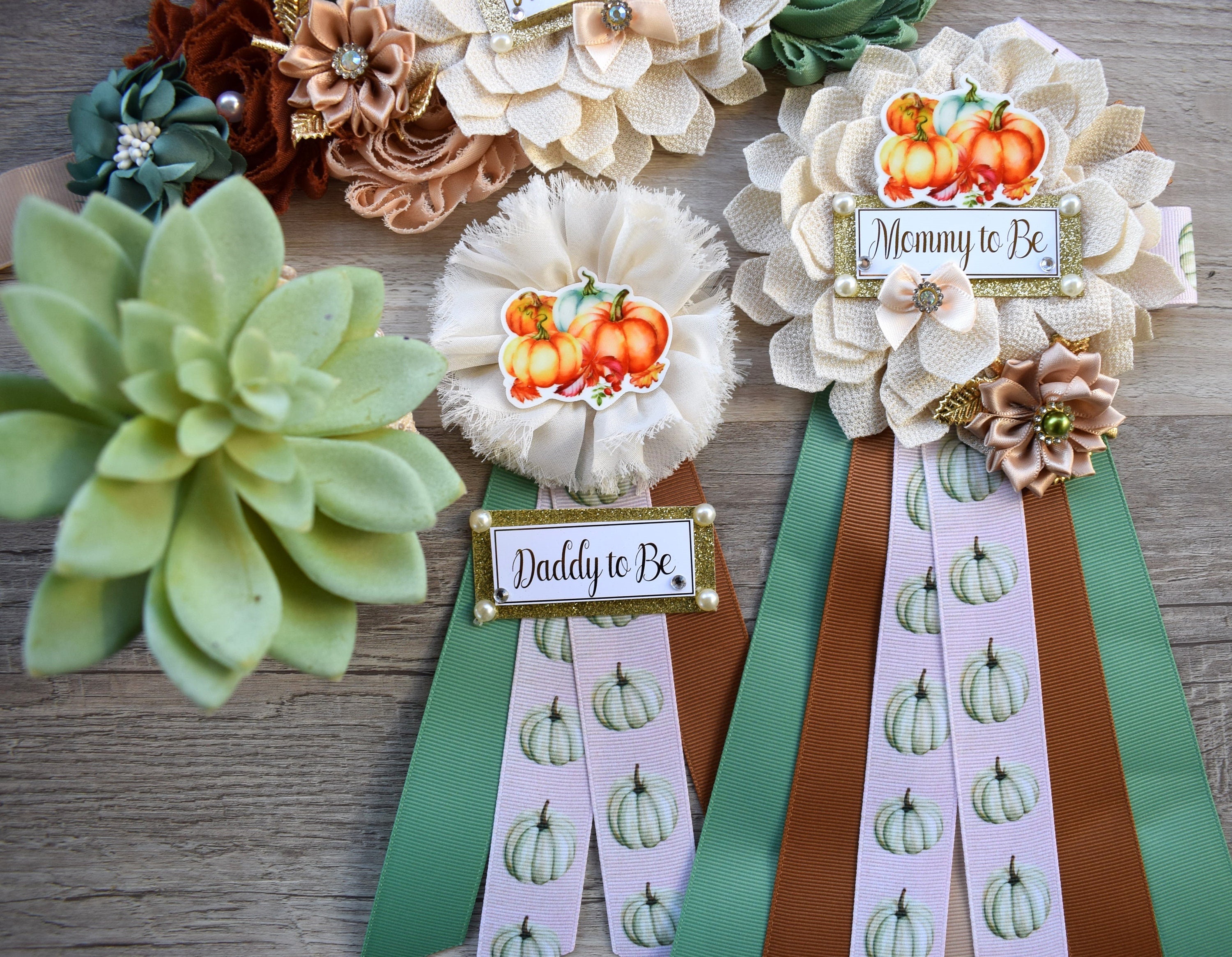 Vintage Pumpkin Baby Shower, Ivory Sage Beige Maternity Sash, Brown Cream Mommy To Be Ribbon, Sage Pumpkin Daddy To Be Pin, Custom