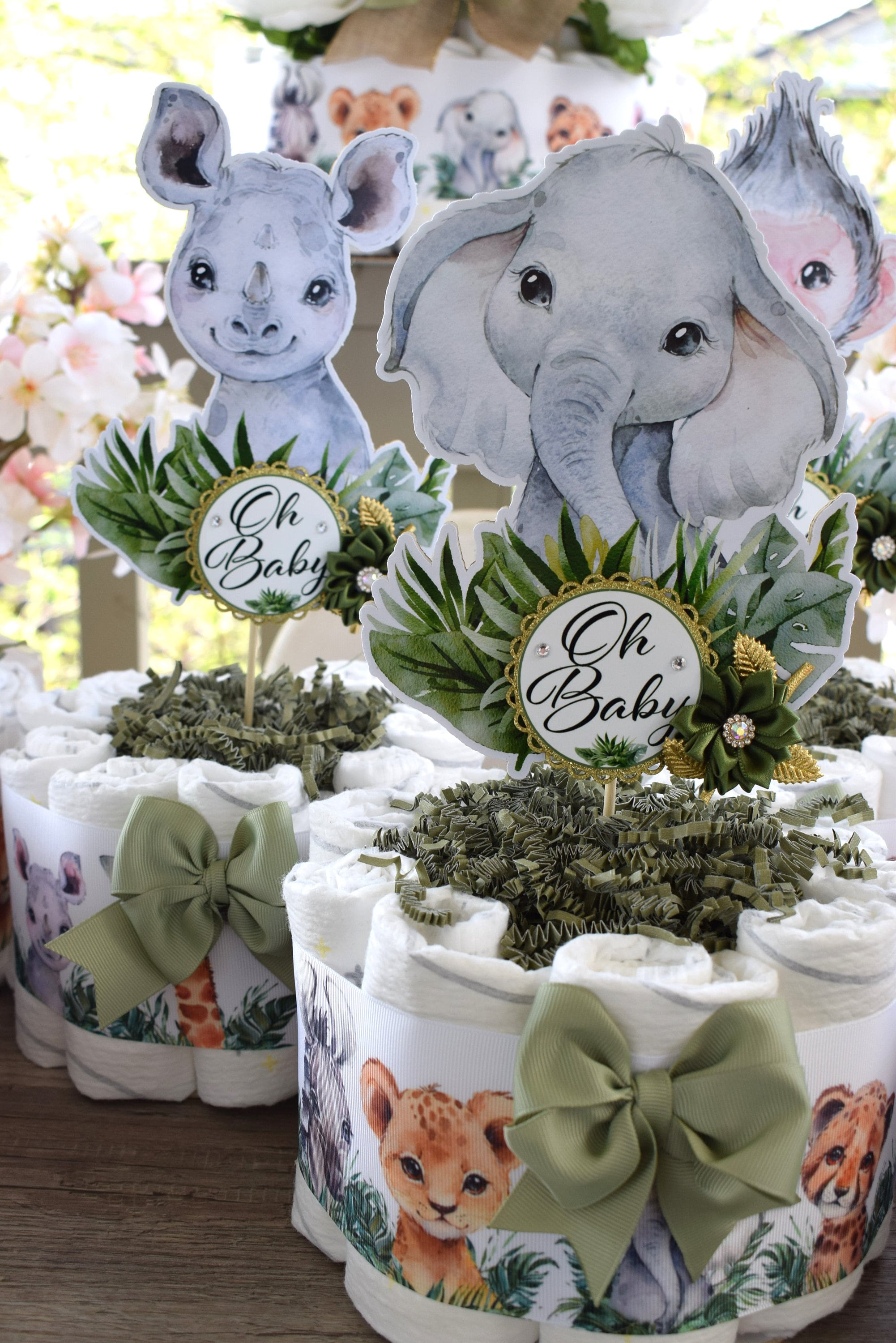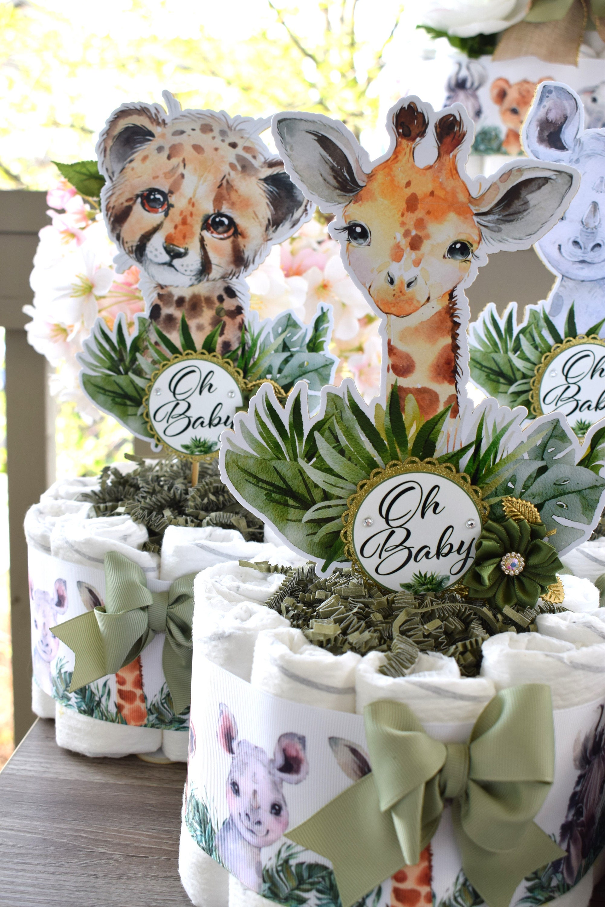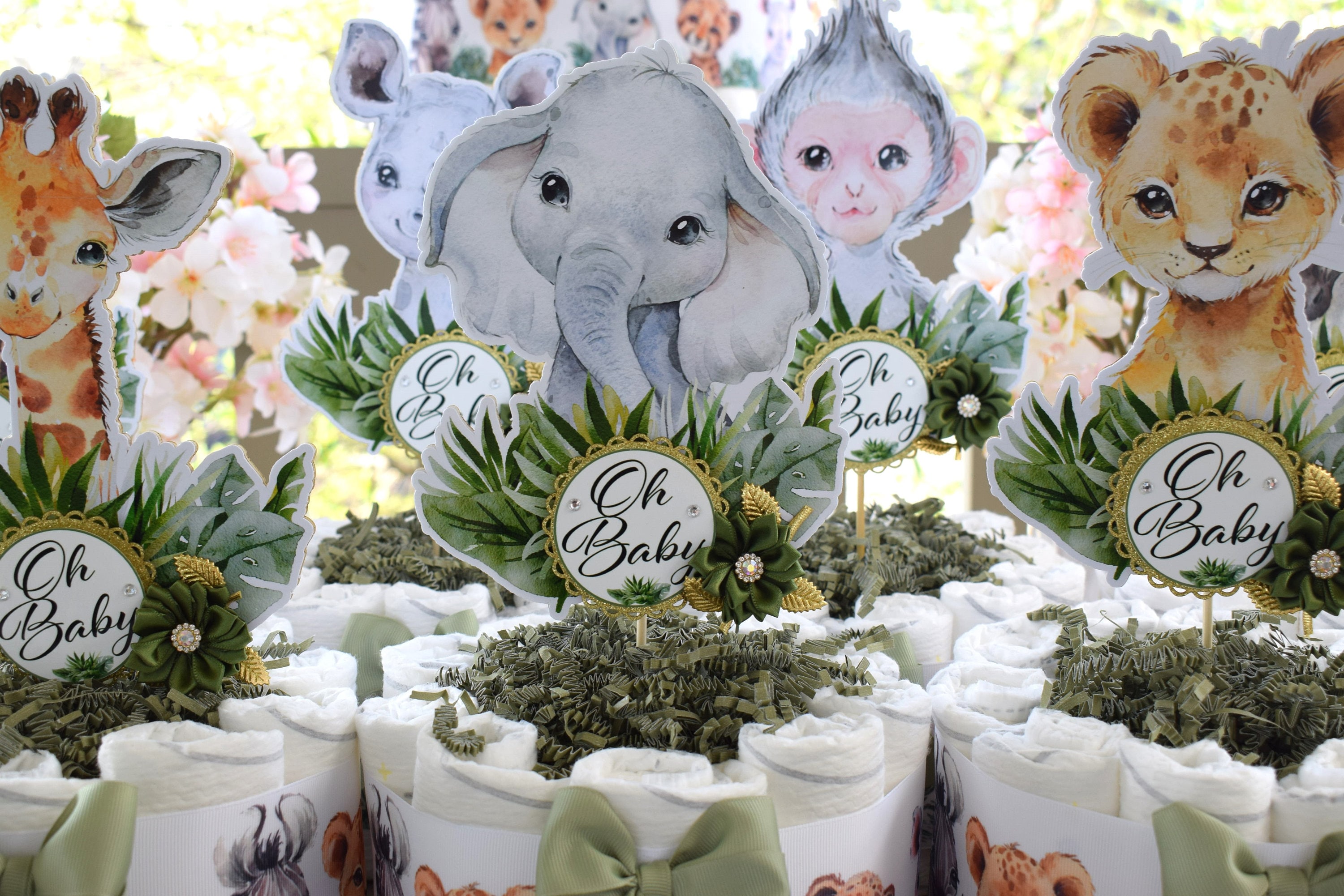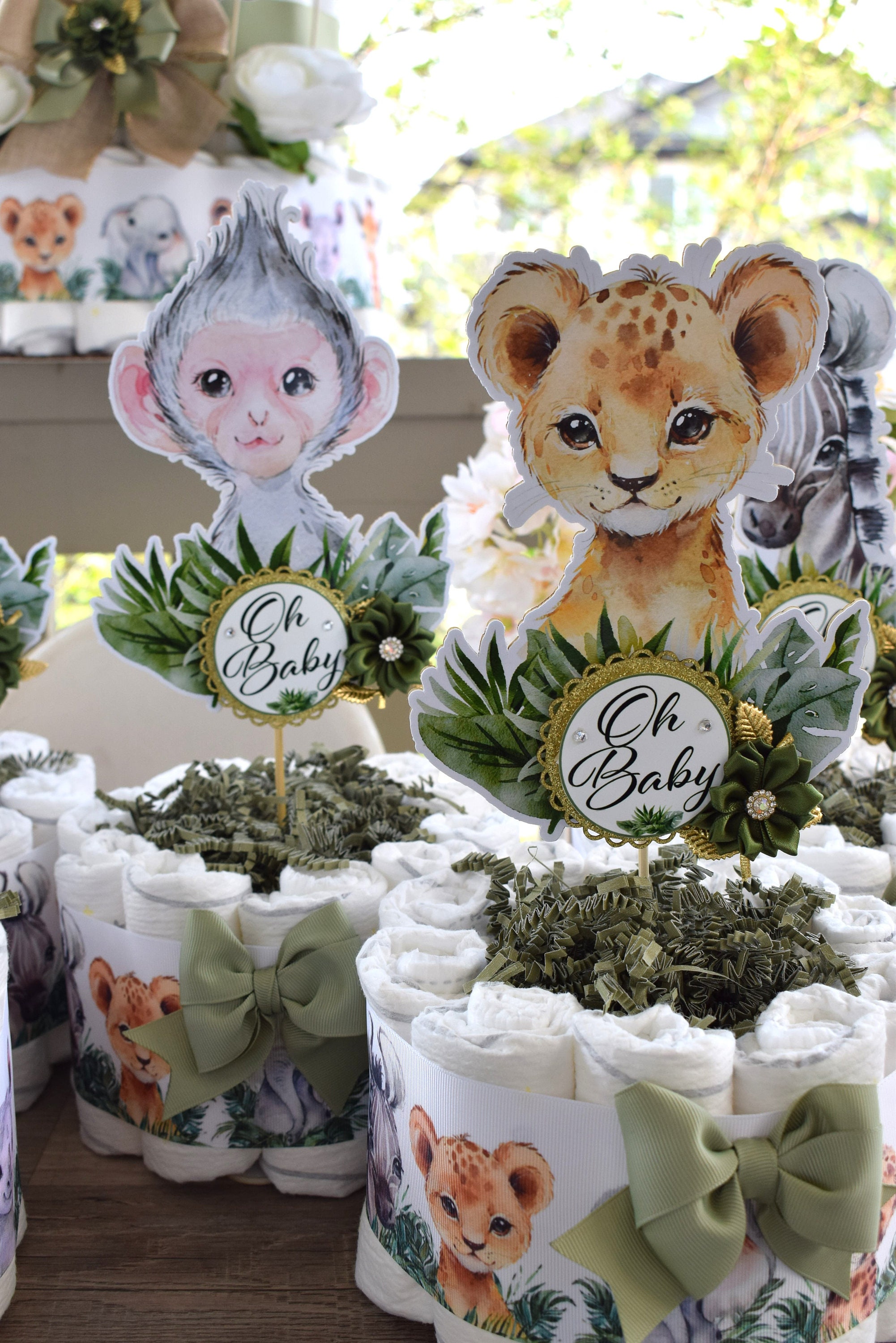 This Gorgeous Jungle Safari Diaper Cakes are the perfect centerpieces for your baby shower. We can match any shower theme.