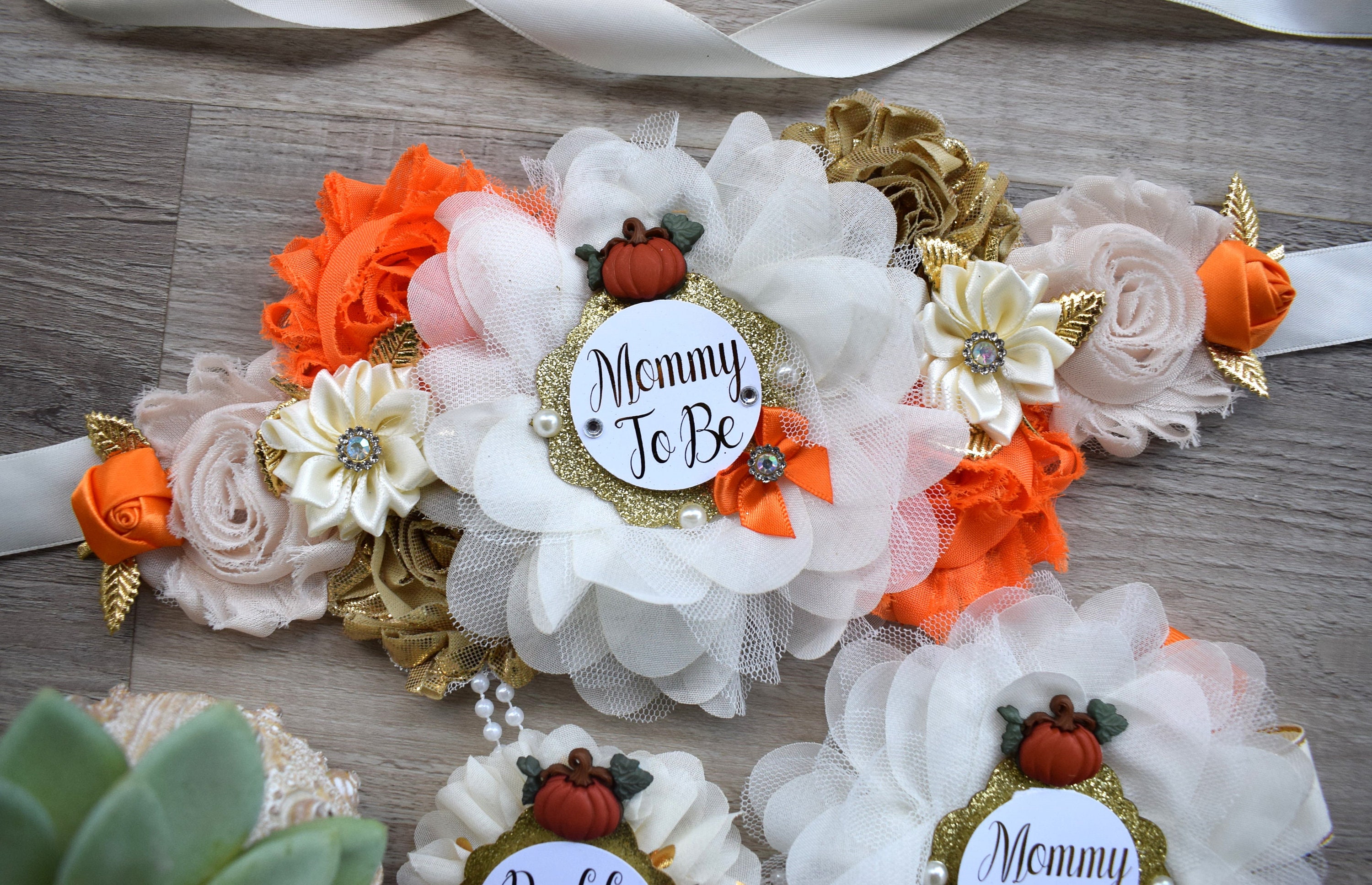 This Gorgeous Pumpkin Sash & Pins Set was made especially for a Baby Shower or a Photo Prop.