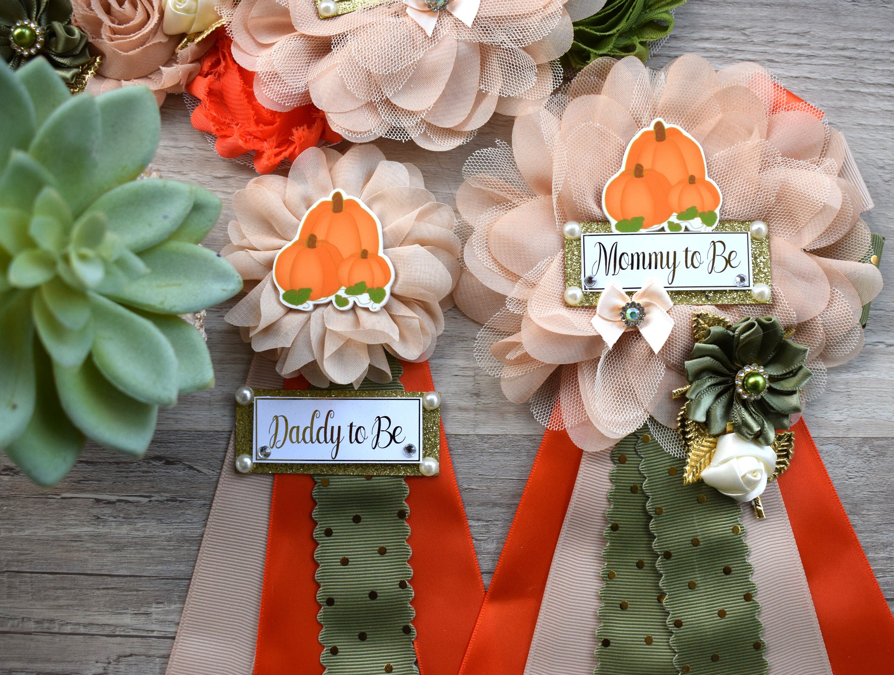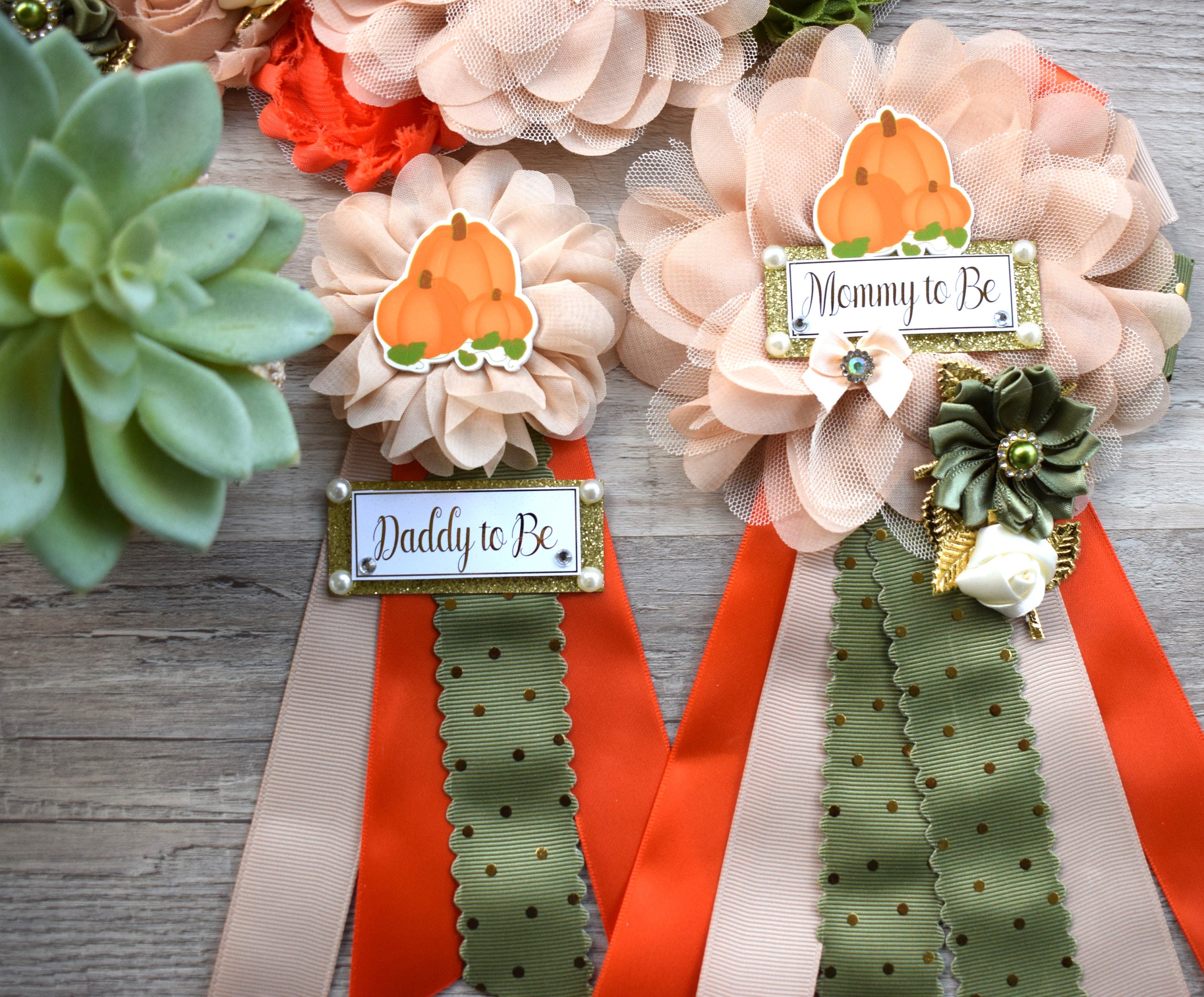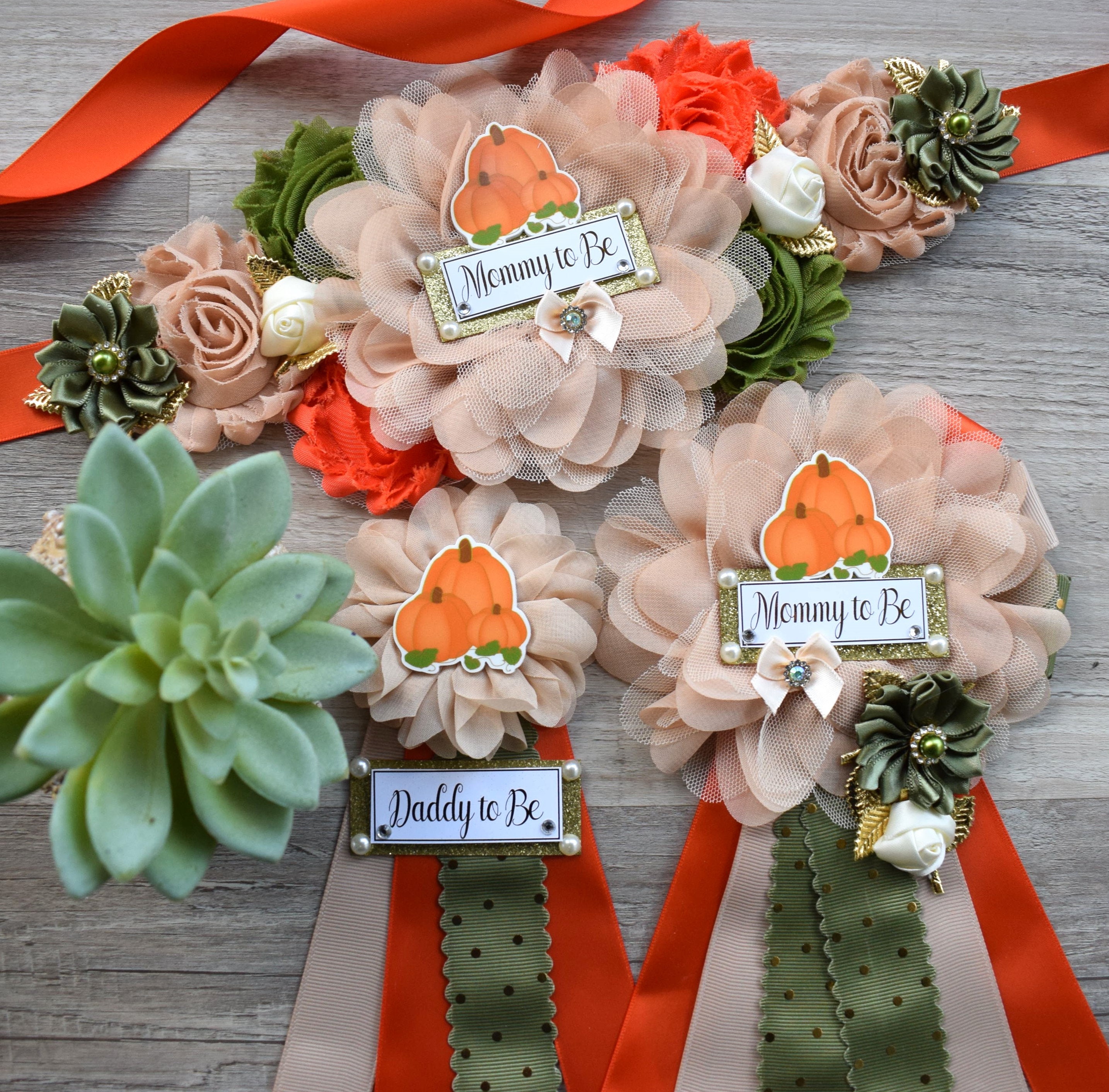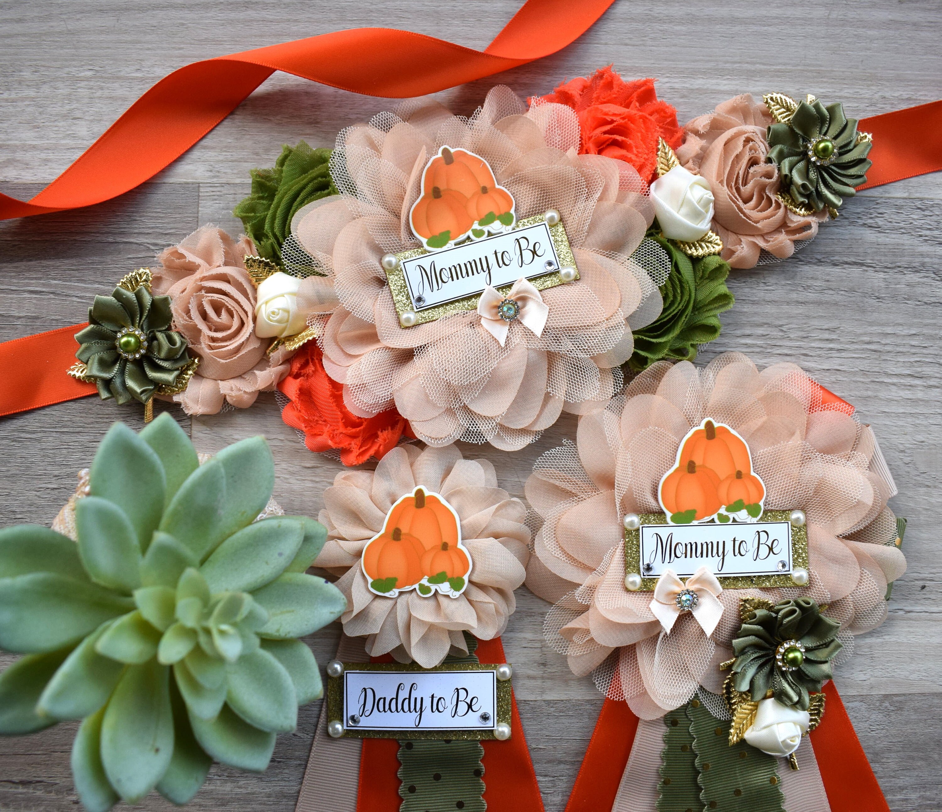 Fall Pumpkin Baby Shower, Olive Ivory Orange Beige Maternity Sash, Gold Cream Mommy To Be Pin, Beige Pumpkin Fall Daddy To Be Pin, Custom
