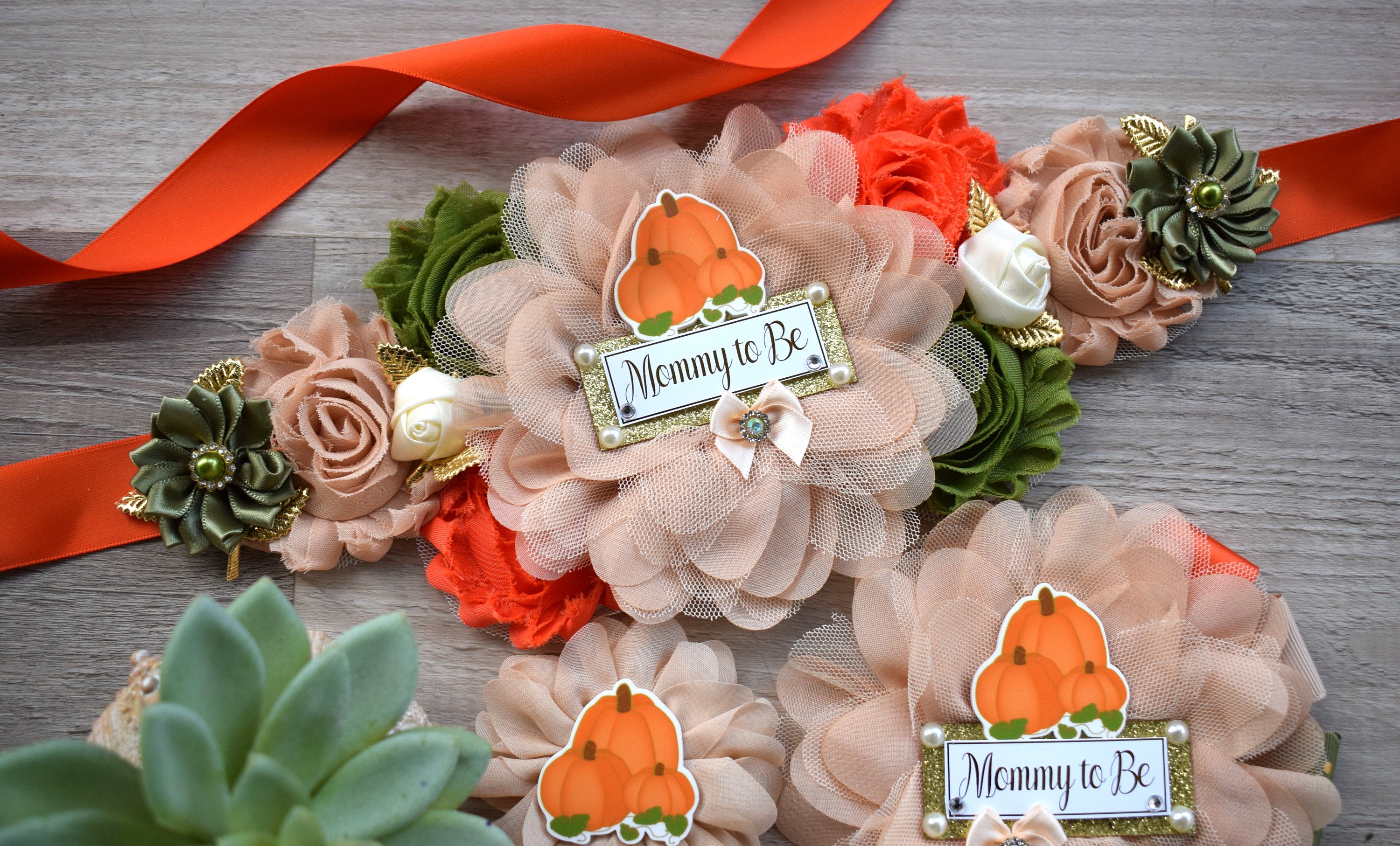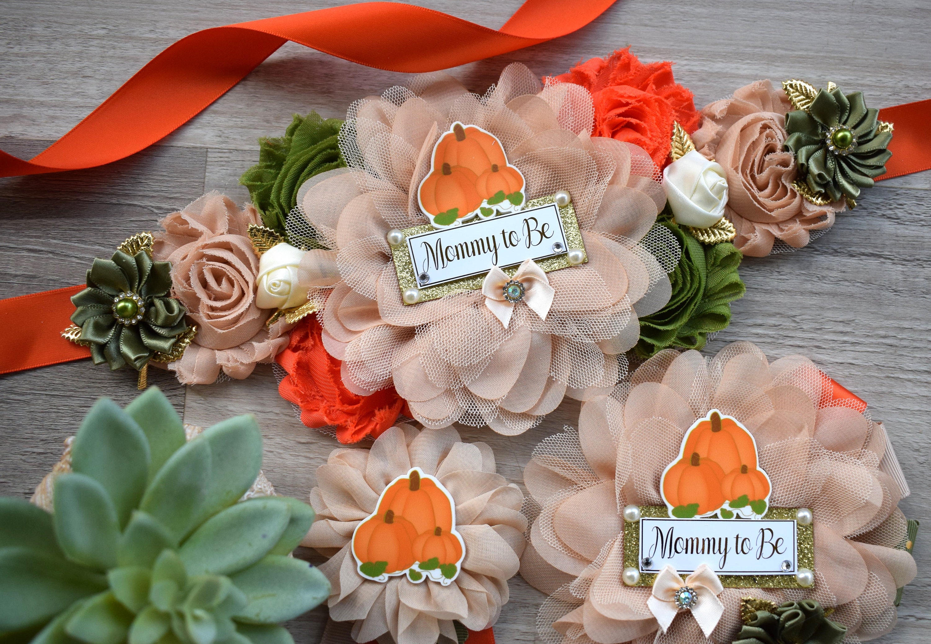 This Gorgeous Pumpkin Sash & Pins Set was made especially for a Baby Shower or a Photo Prop.