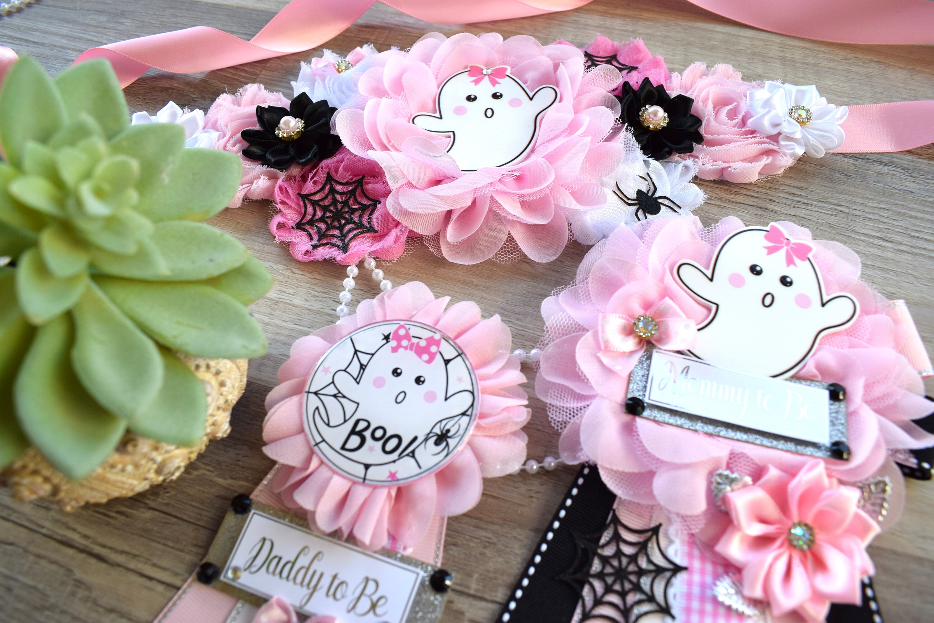 Girl Pink Ghost Halloween Baby Shower, Pink Maternity Sash, Mommy To Be Ribbon, Daddy To Be Pin, Halloween Baby Shower Gift, Custom