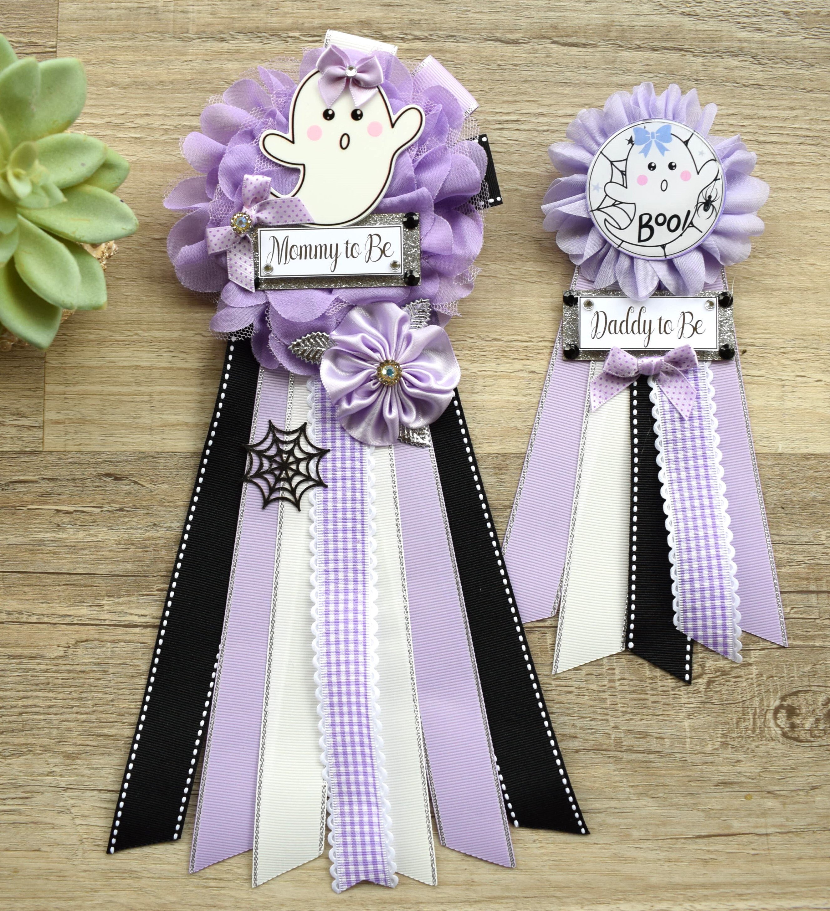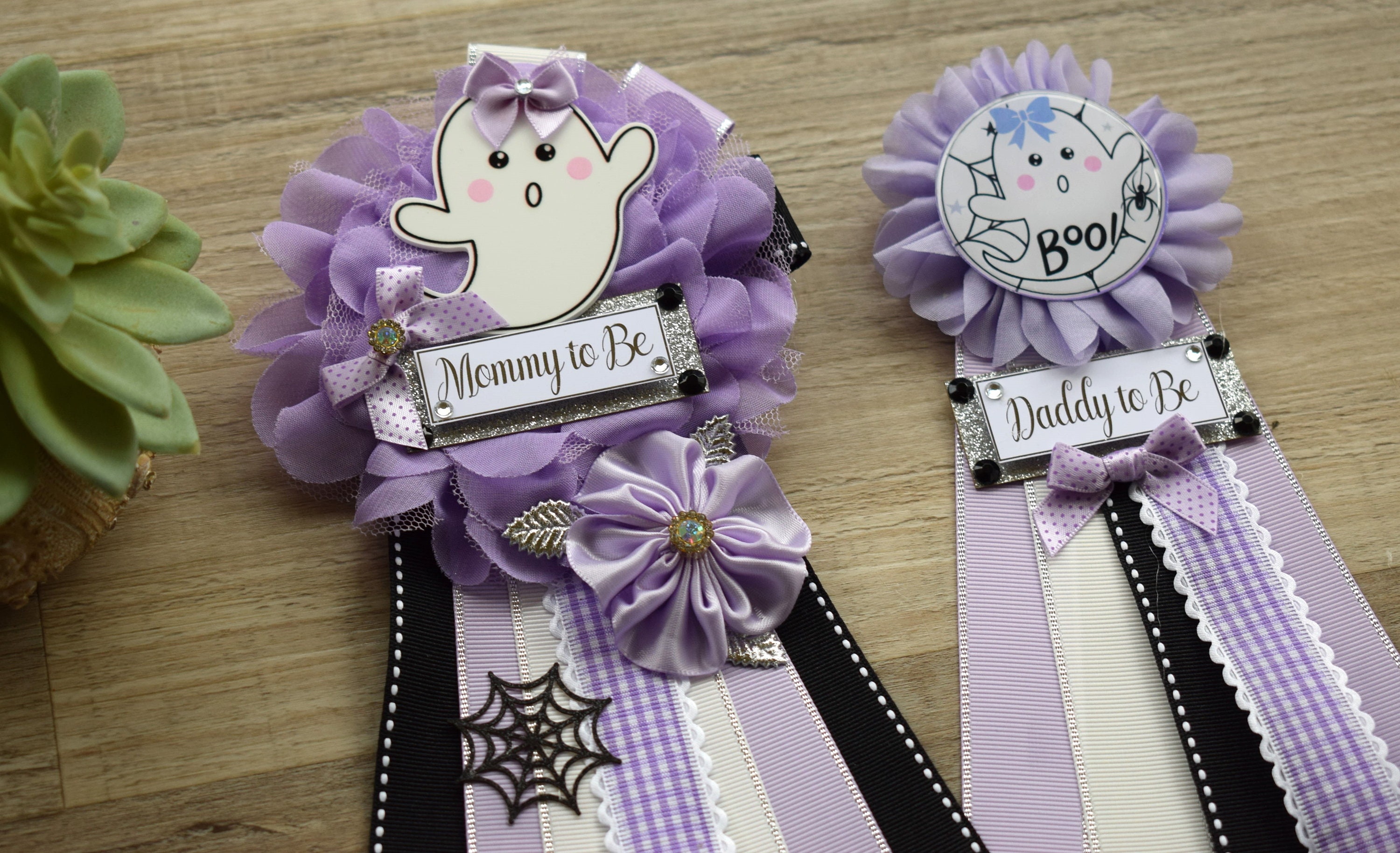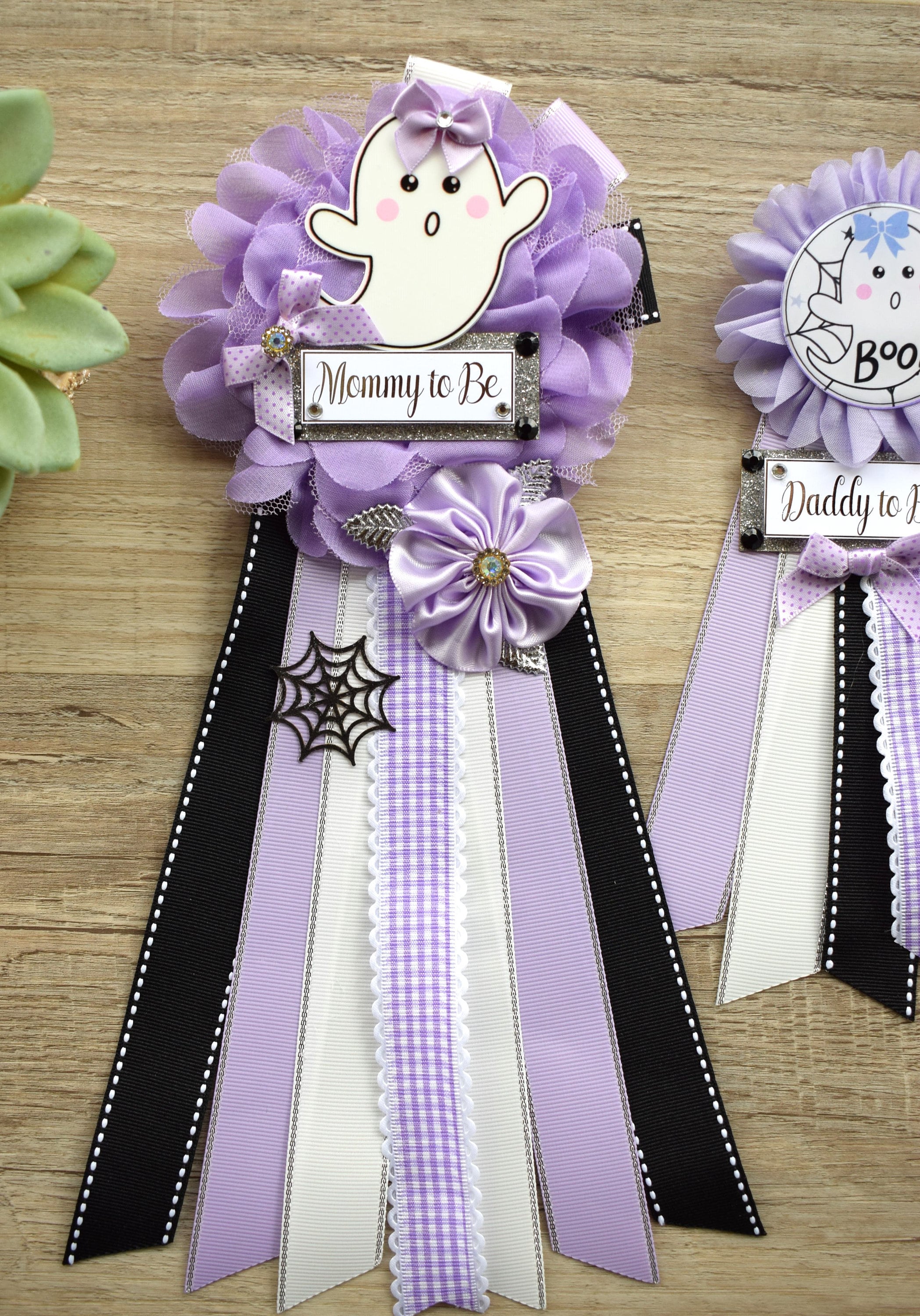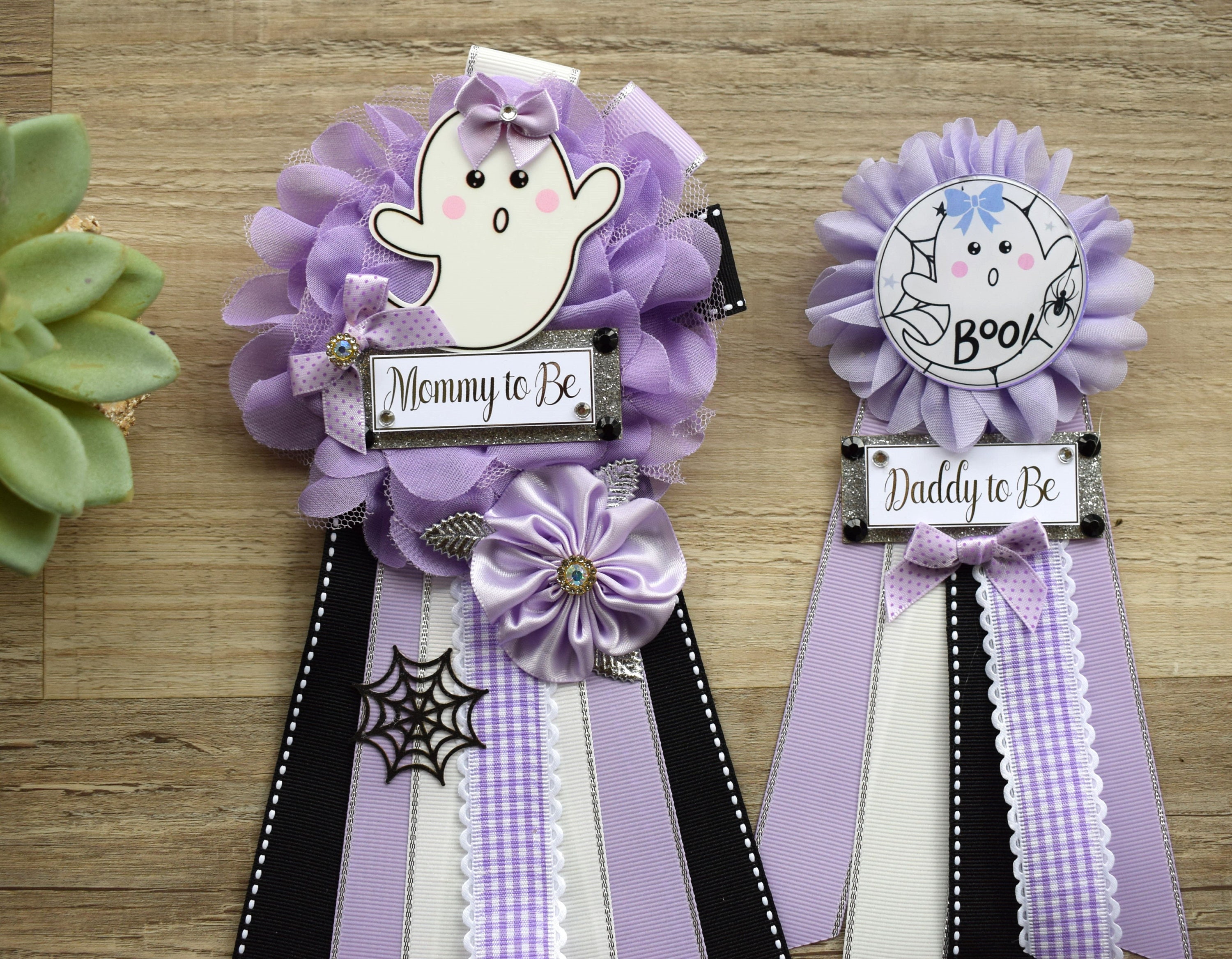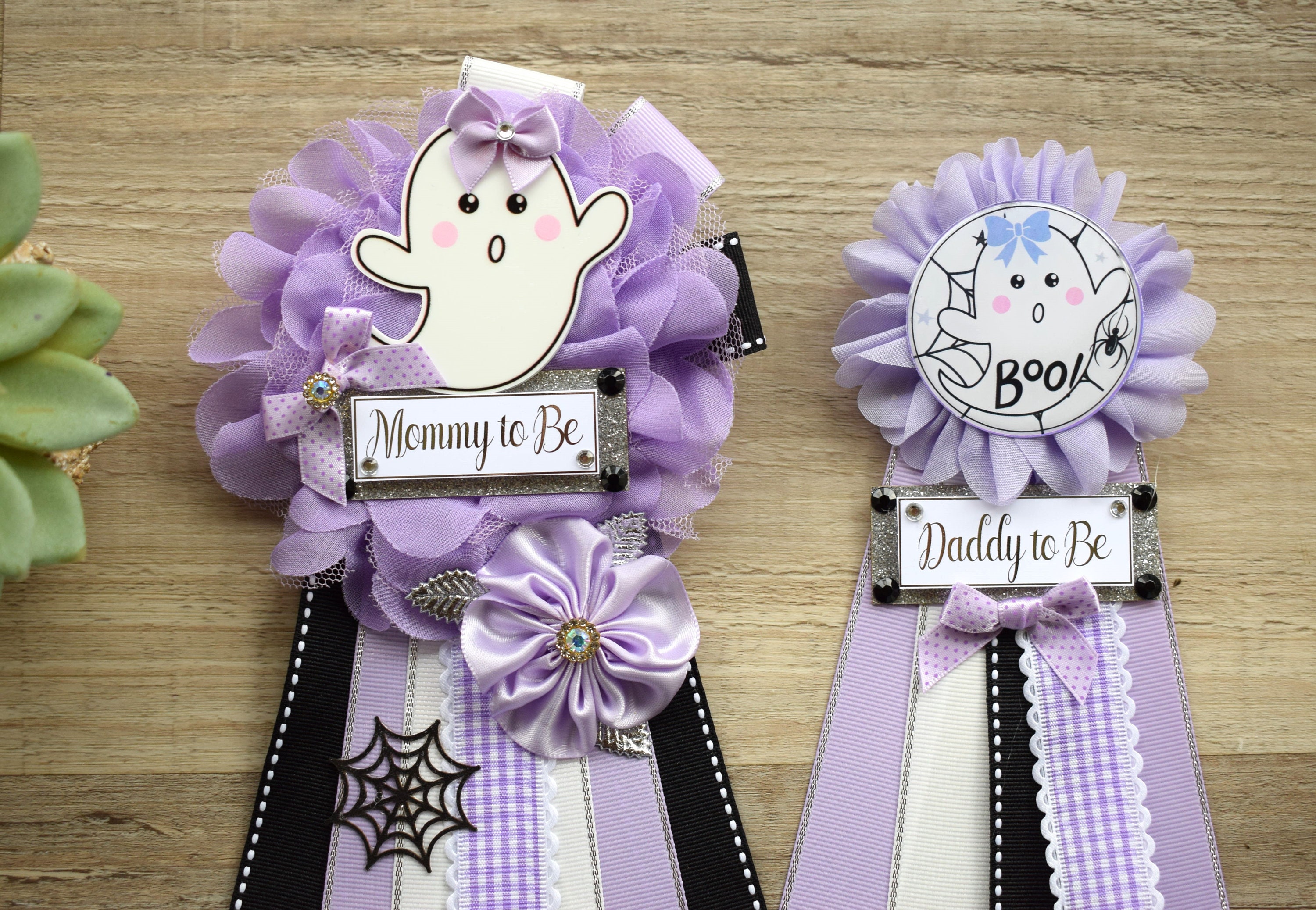 Lavender Ghost Halloween Baby Shower, Lilac Maternity Sash, Mommy To Be Ribbon, Daddy To Be Pin, Halloween Baby Shower Gift, Custom