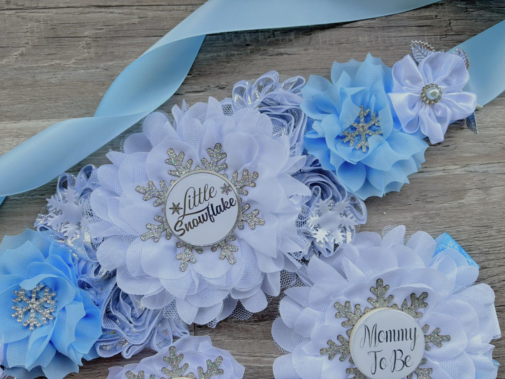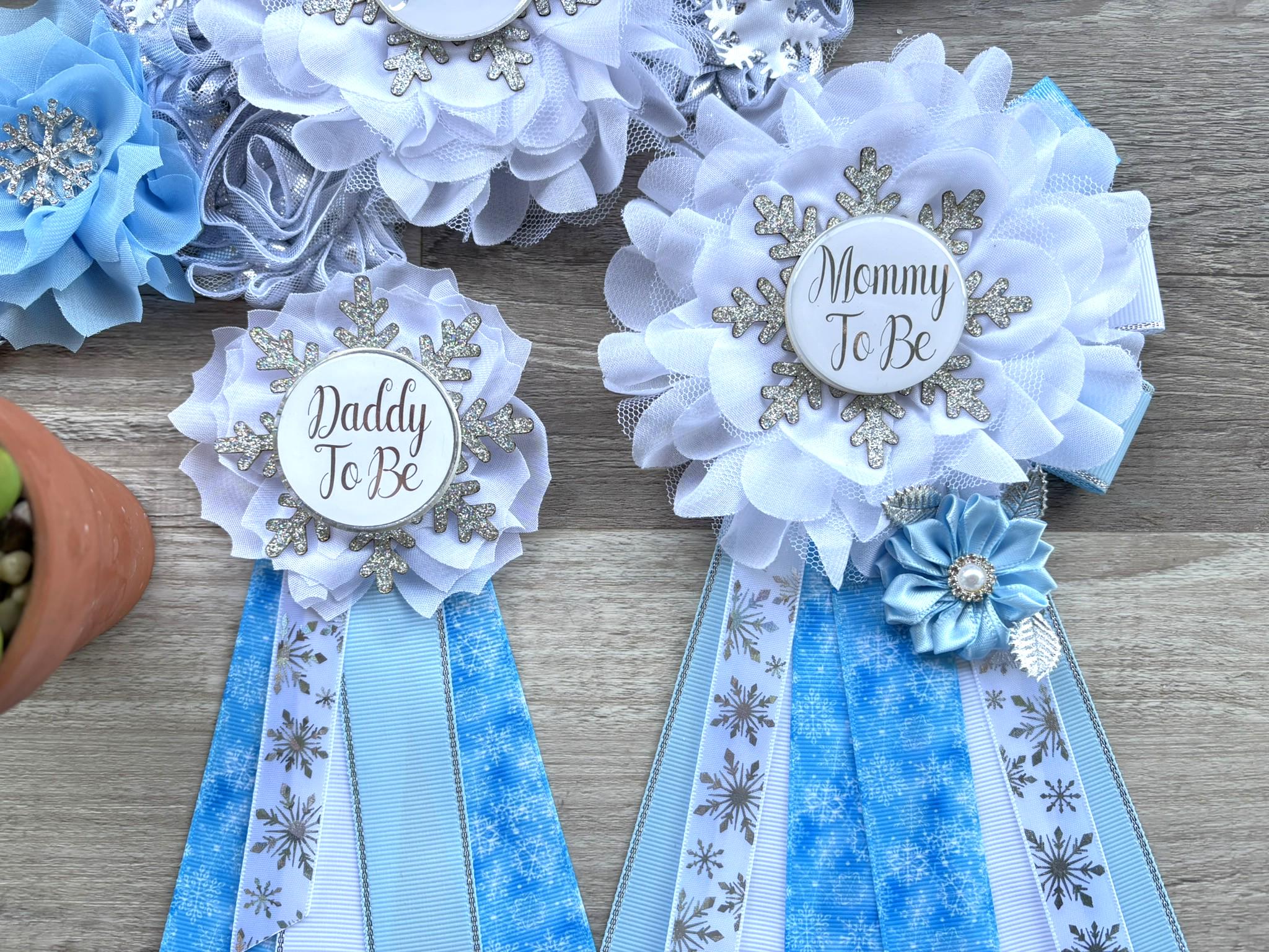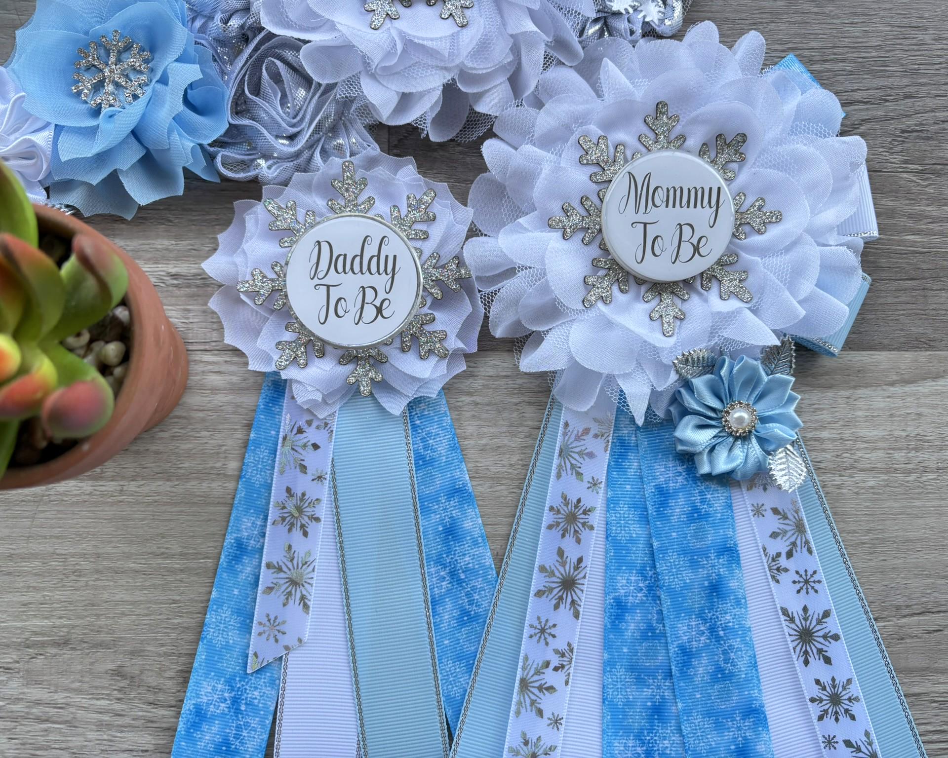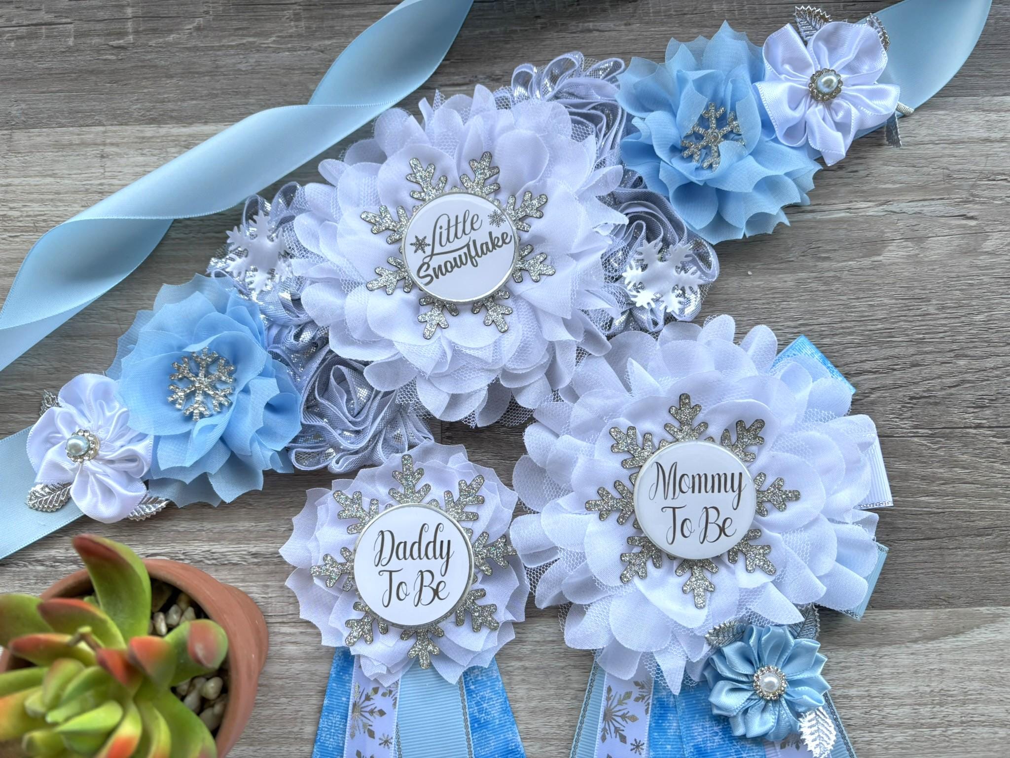 Boy Snowflake Baby Shower Set, Blue White Maternity Sash, Snowflake Mommy To Be Pin, Daddy To Be Pin, Custom Order Welcome