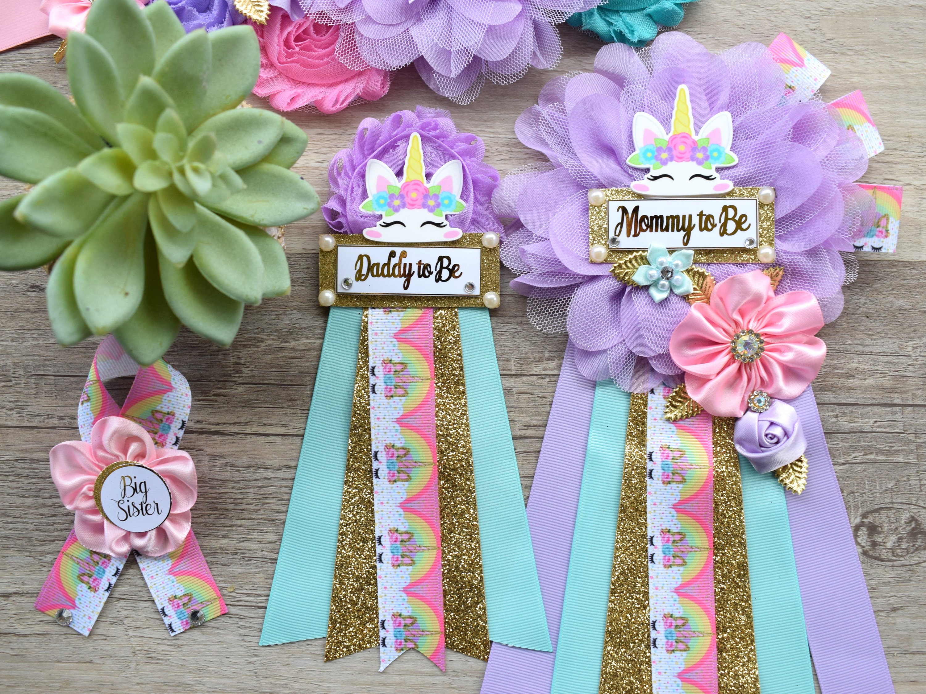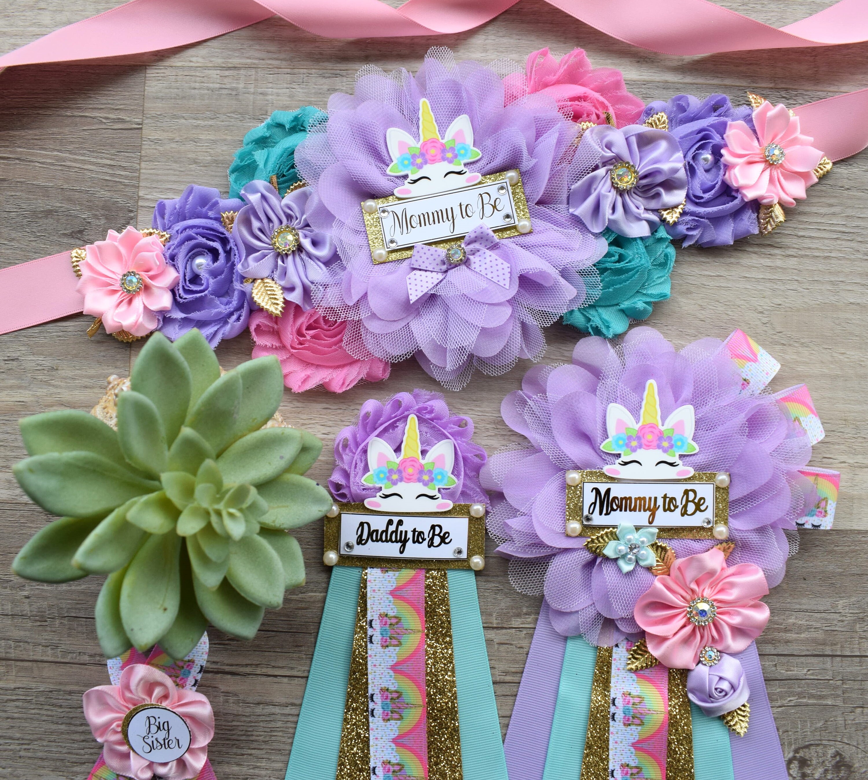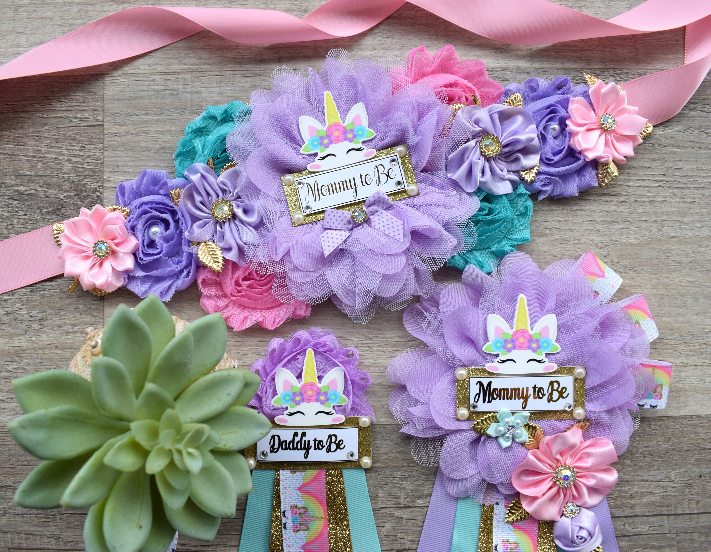 Unicorn Baby Shower, Unicorn Maternity Sash, Unicorn Mommy To Be Ribbon, Daddy To Be Pin, Purple Aqua Pink Sash, Unicorn Baby Shower