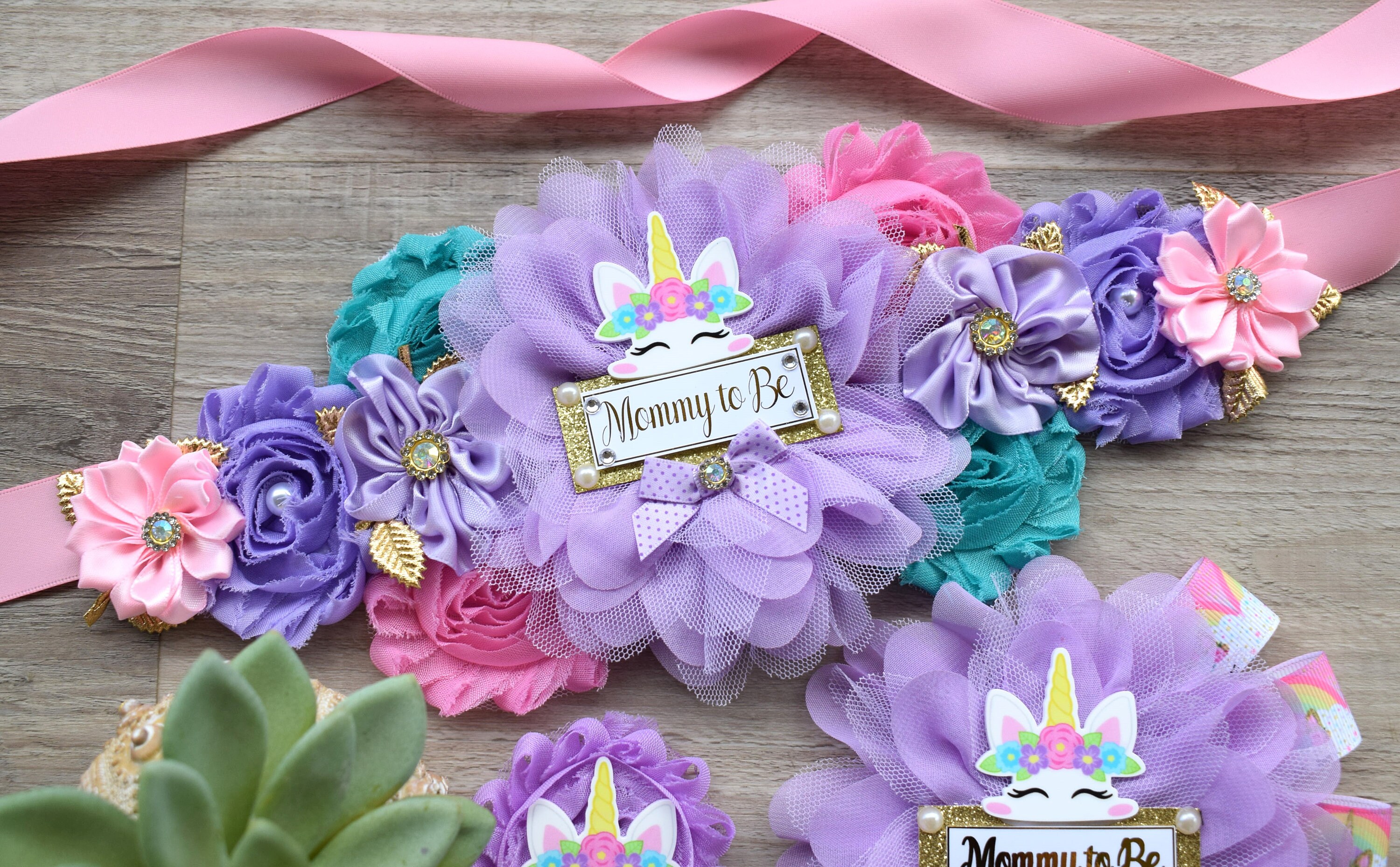 This Gorgeous Unicorn Flower Sash is made especially for a Baby Shower or a Photo Prop.