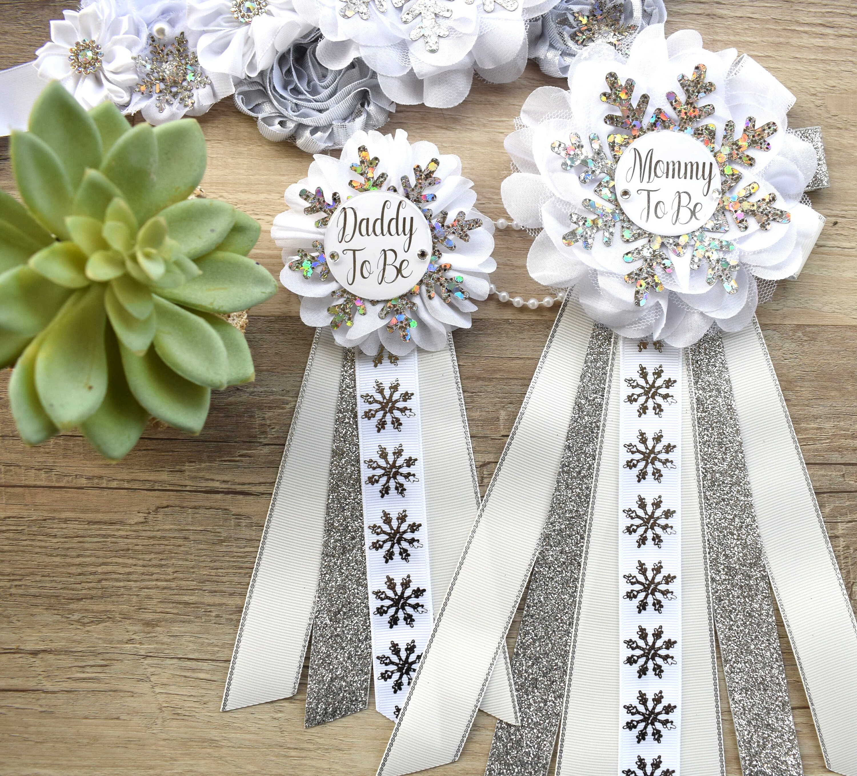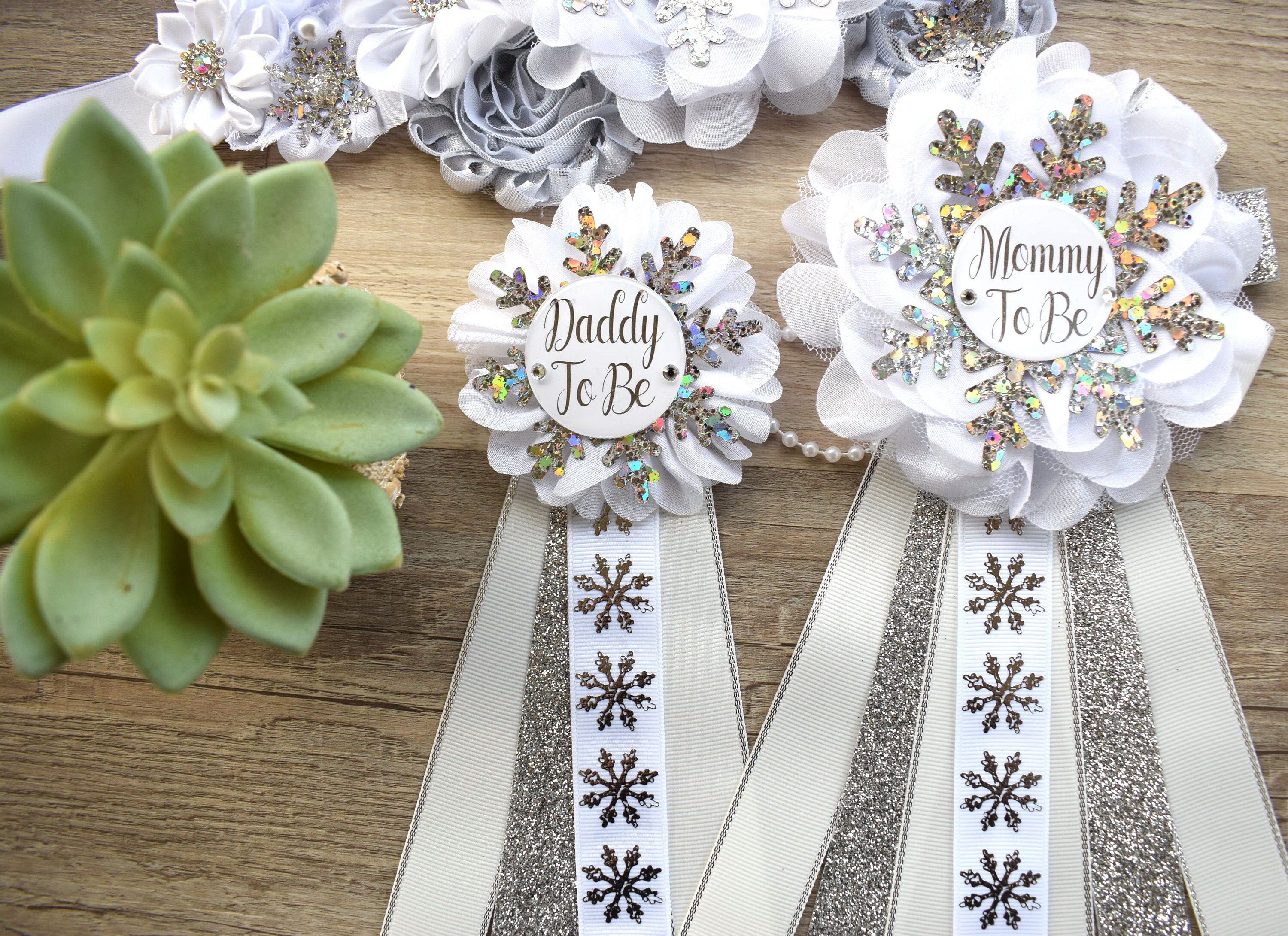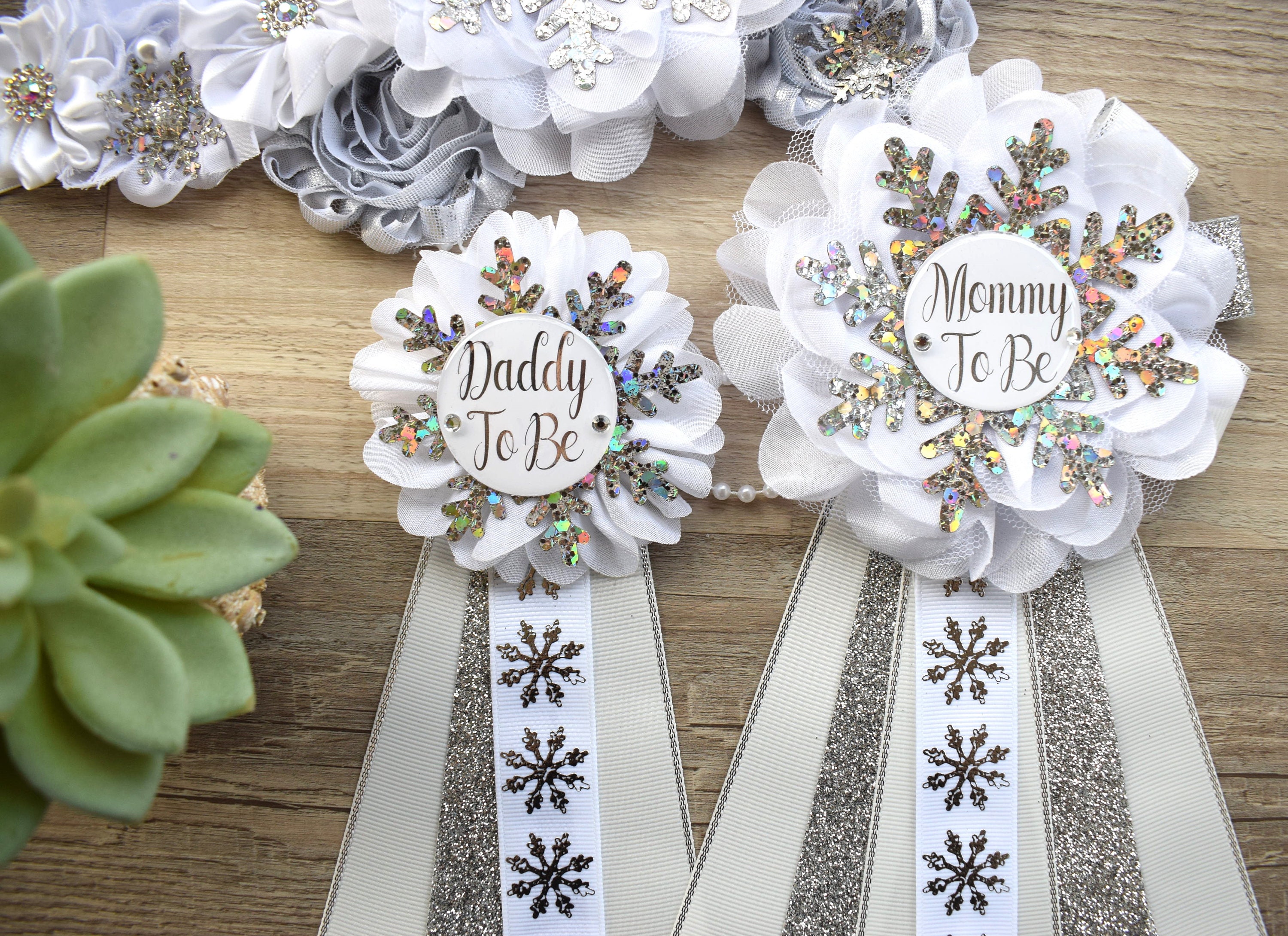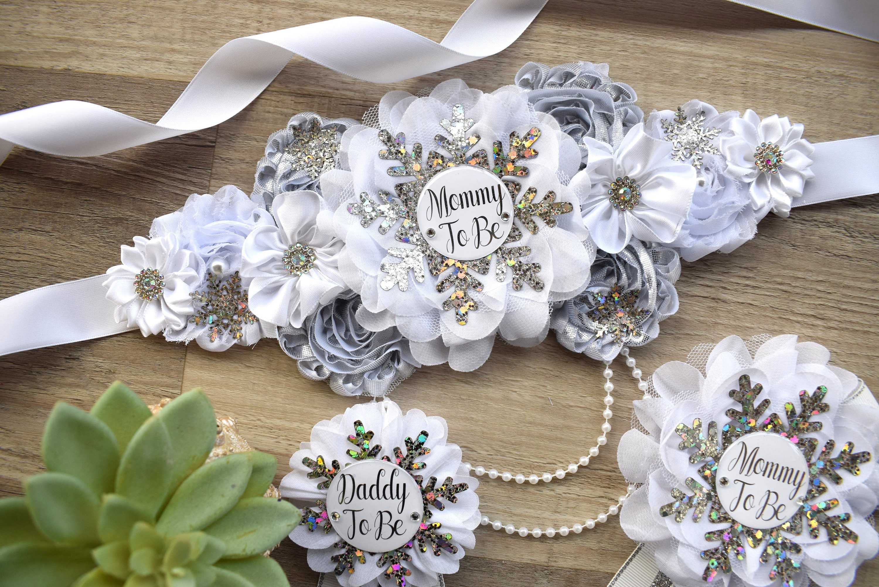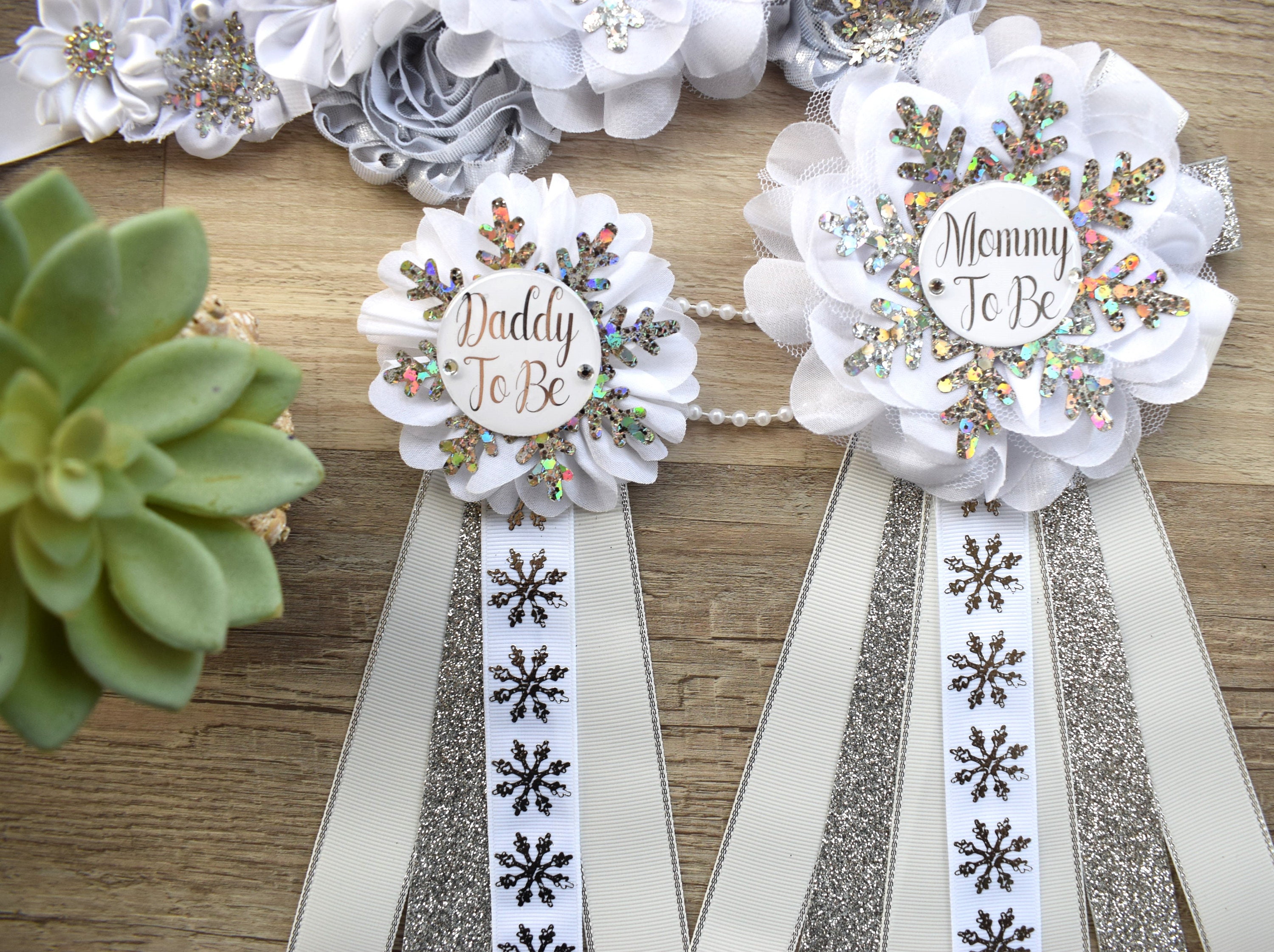 Gender Reveal Snowflake Baby Shower, White Silver Maternity Sash, Snowflake Mommy To Be Ribbon, Daddy To Be pin, Baby Shower Gift, Custom