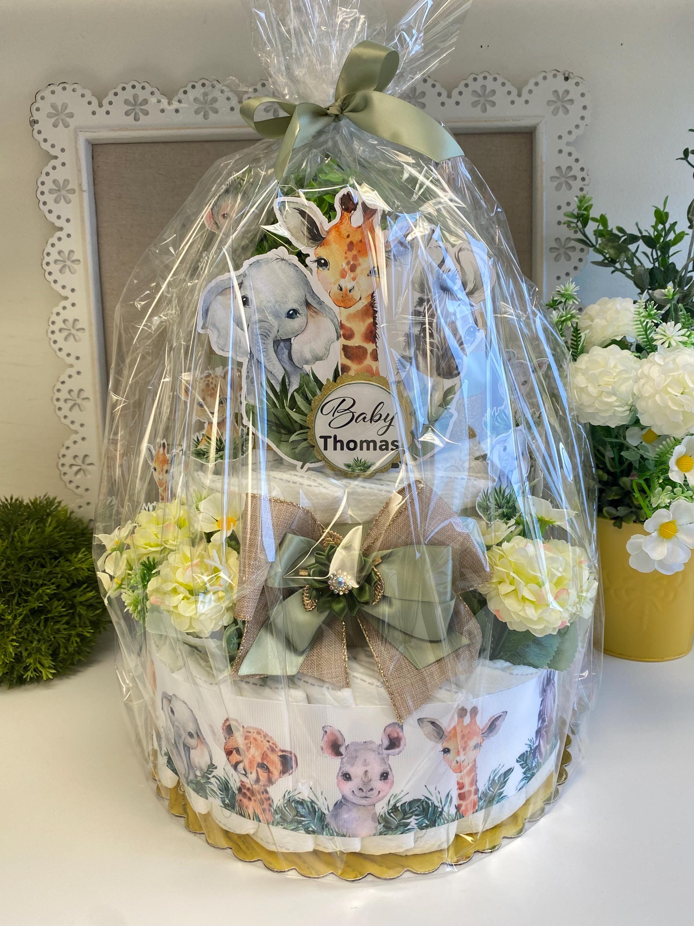 Jungle Safari Diaper Cake Baby Shower, Baby Shower Centerpieces Decorations, Room Nursery Decor, New Mom Gifts 3 Tier Diaper Cake - S0001