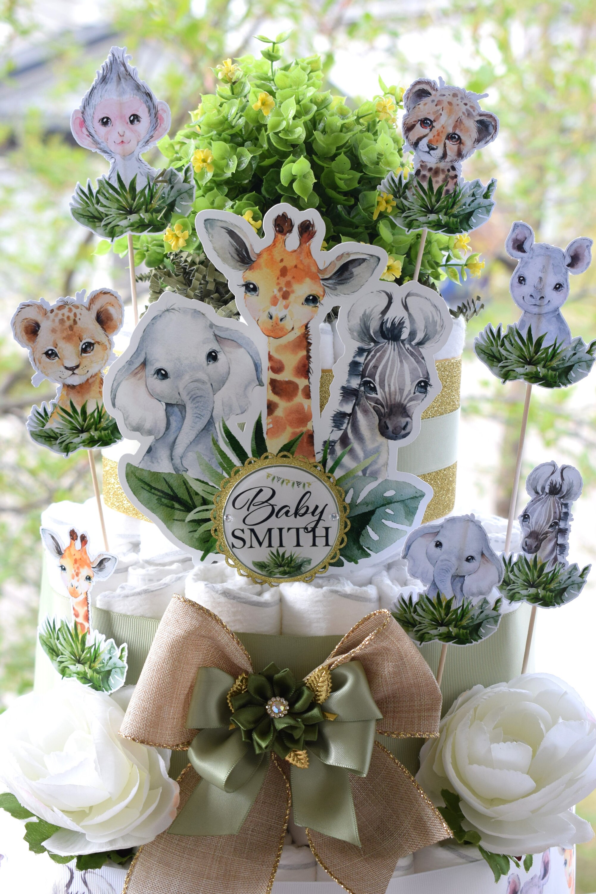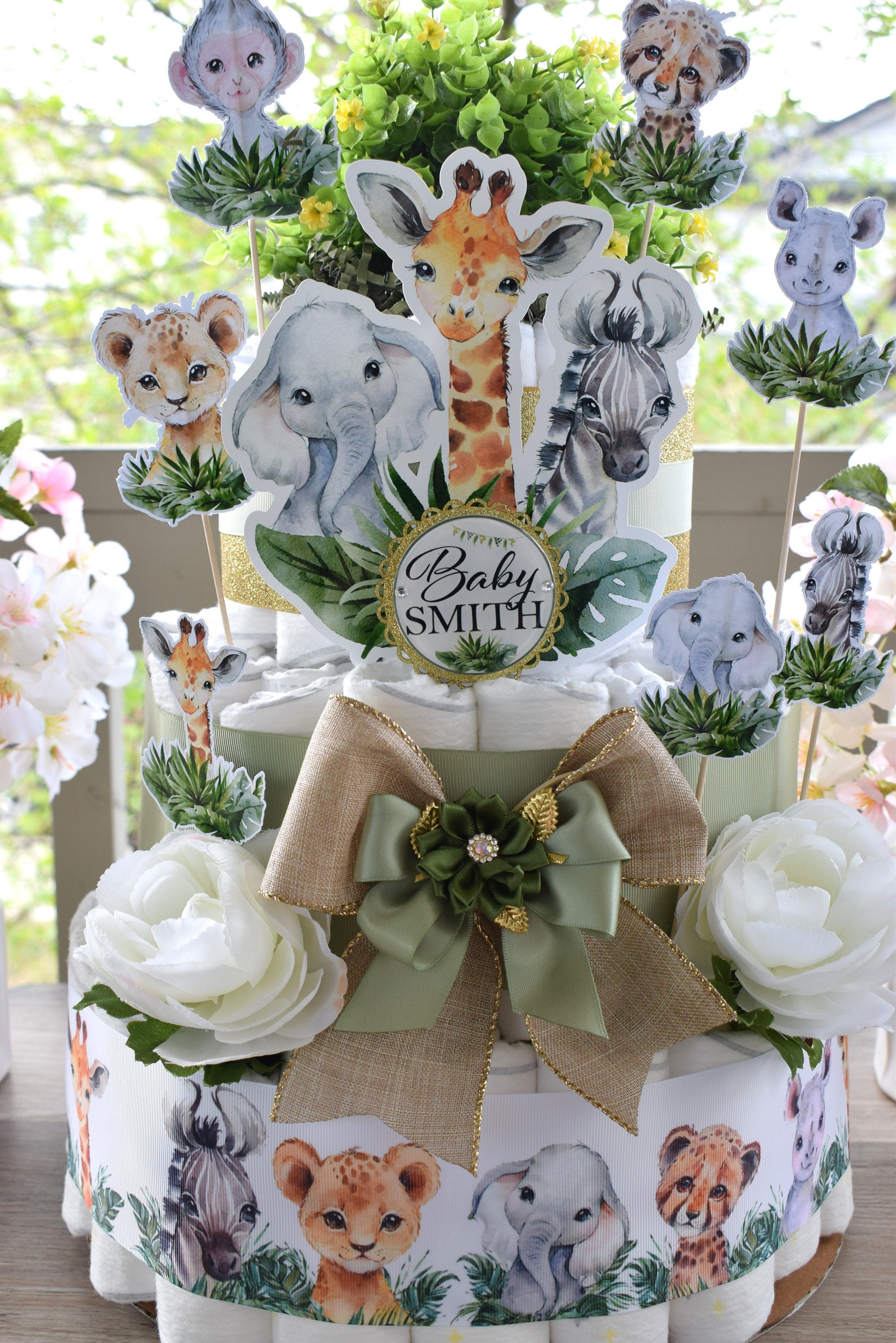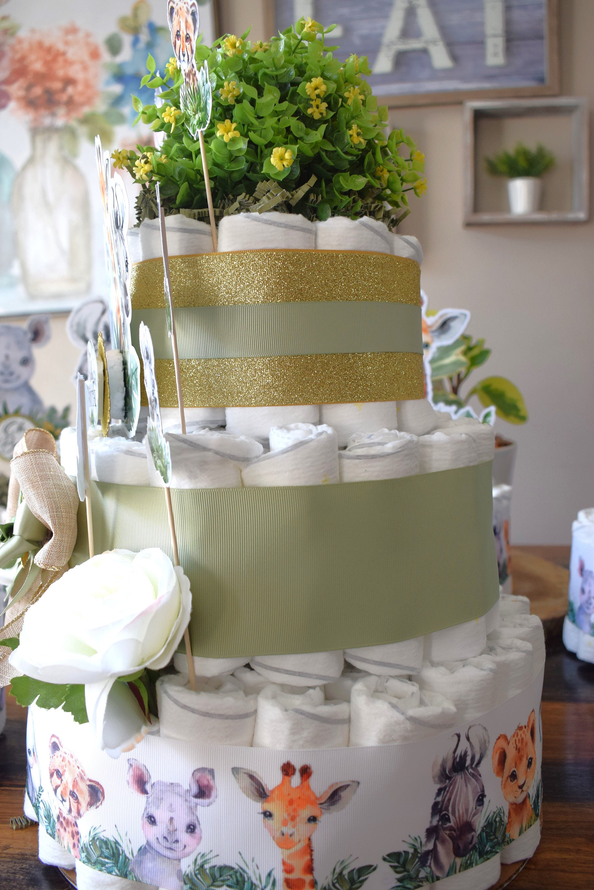 -. This DIAPER CAKE is decorated with safari theme in sage, rustic, gold and white colors.