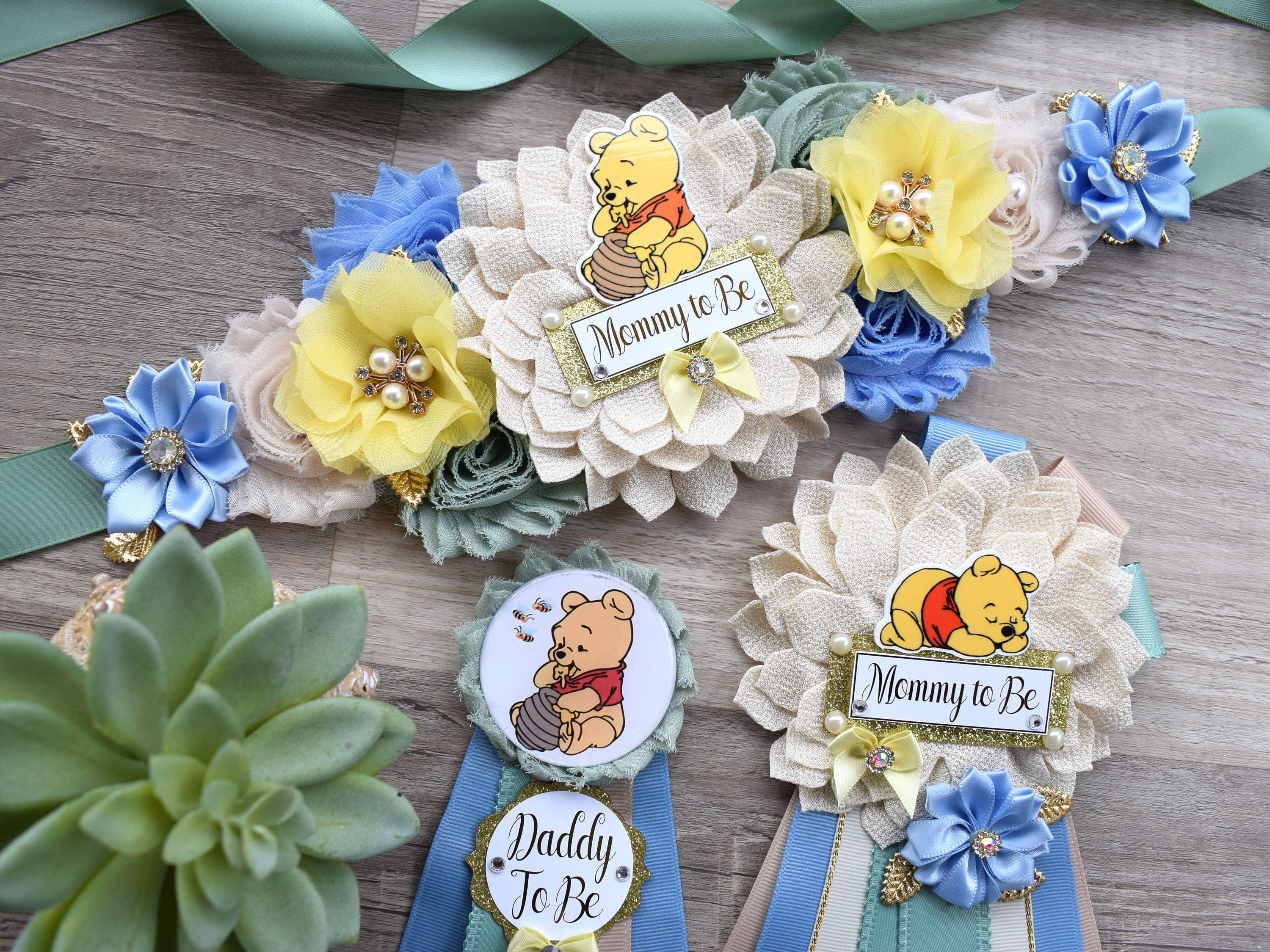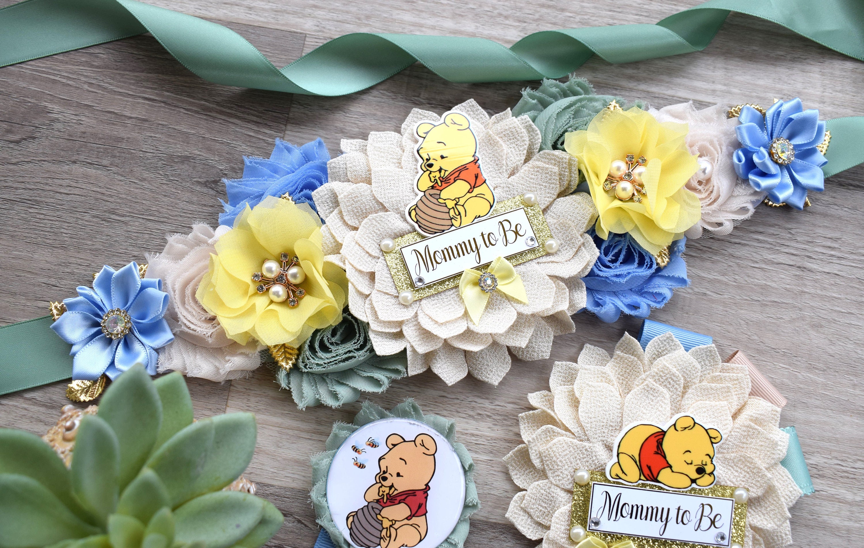 * Maternity Sash: This has eleven flowers in Blue, Yellow, Tan, Sage & Gold colors embellished with rhinestones and pearls. The ribbon sash is 80'' (2 meters) long.