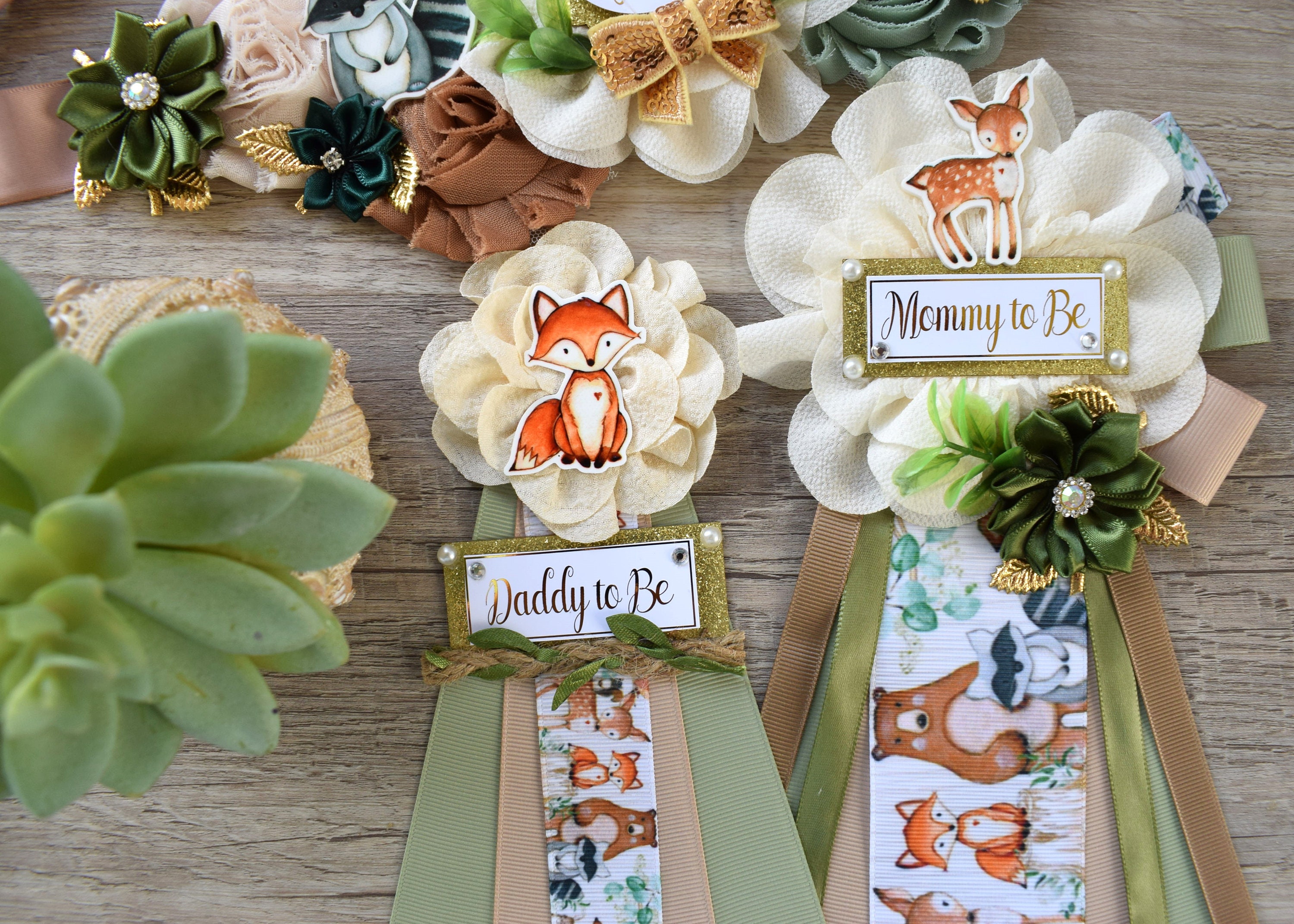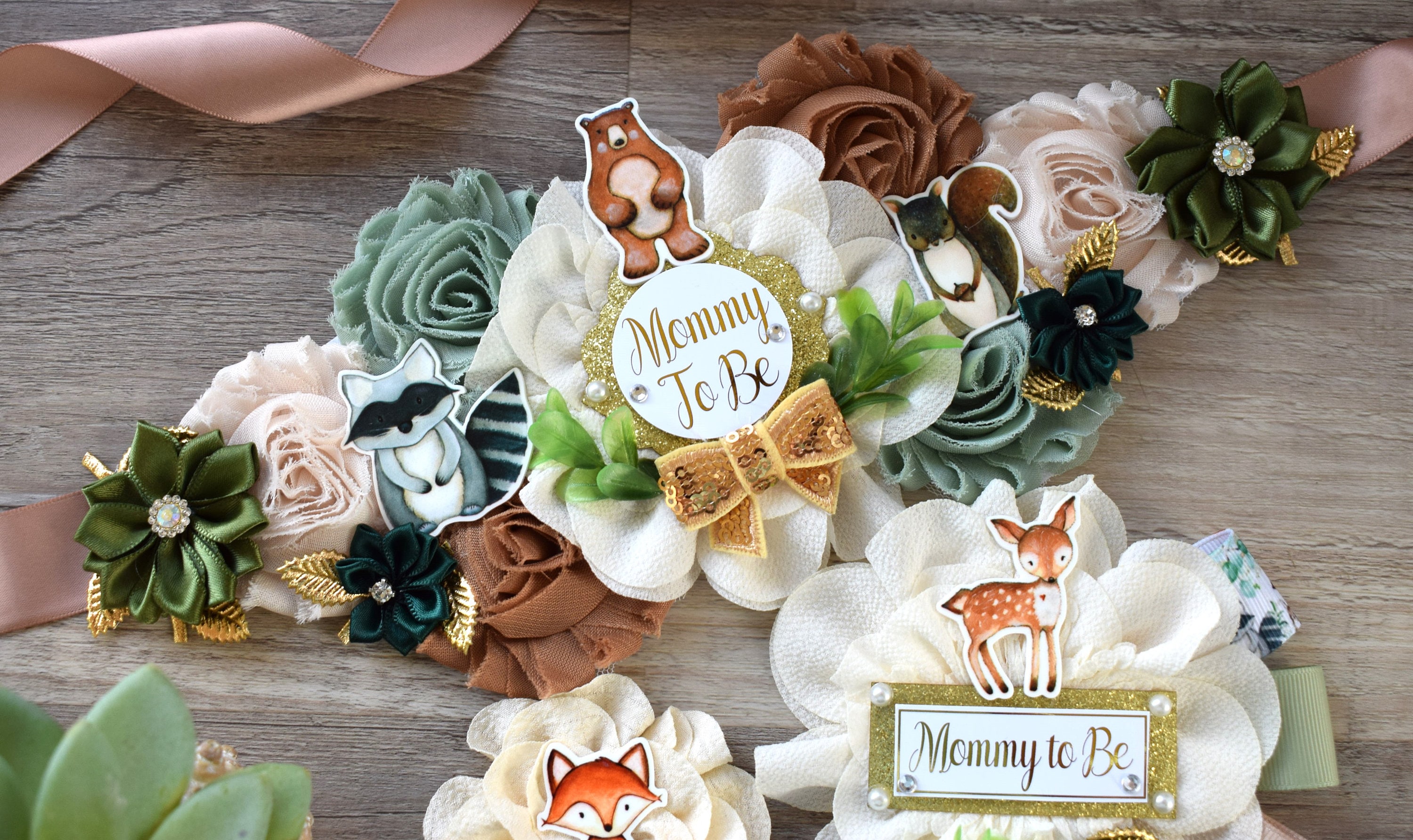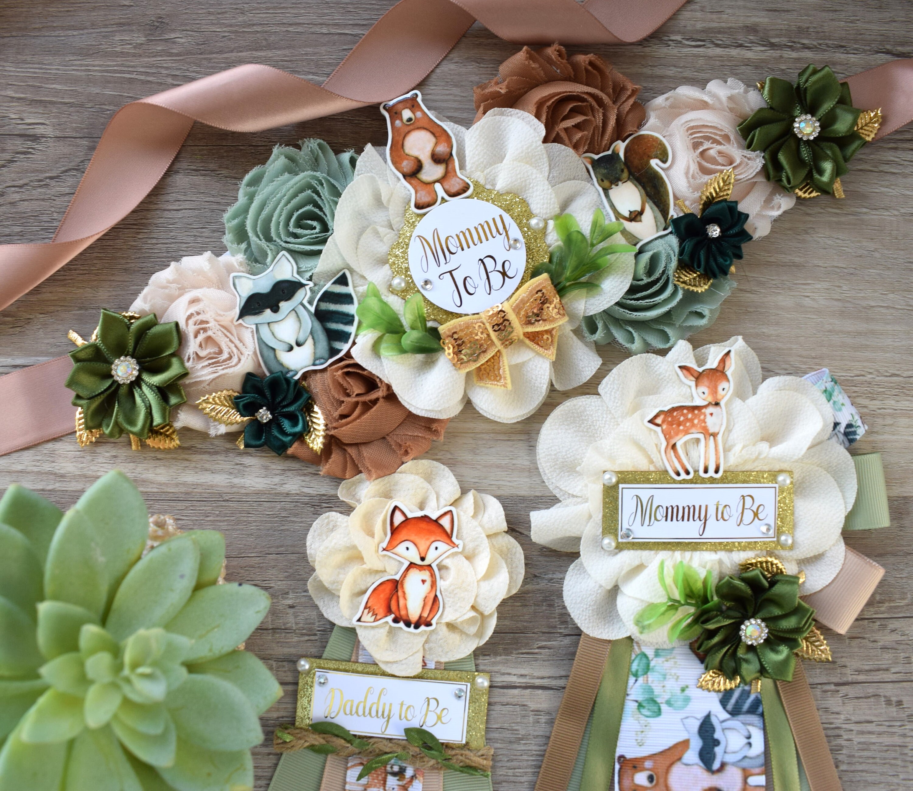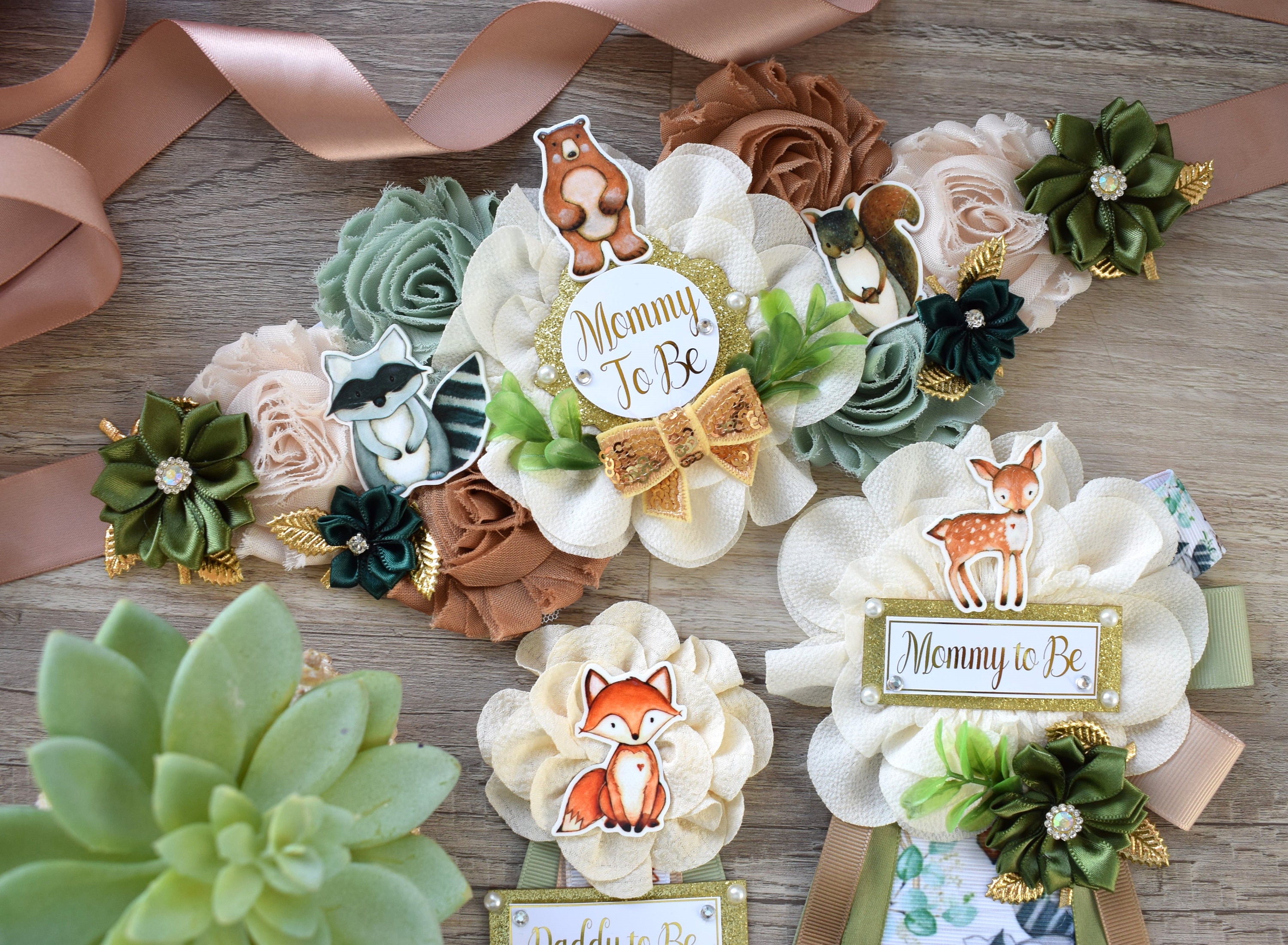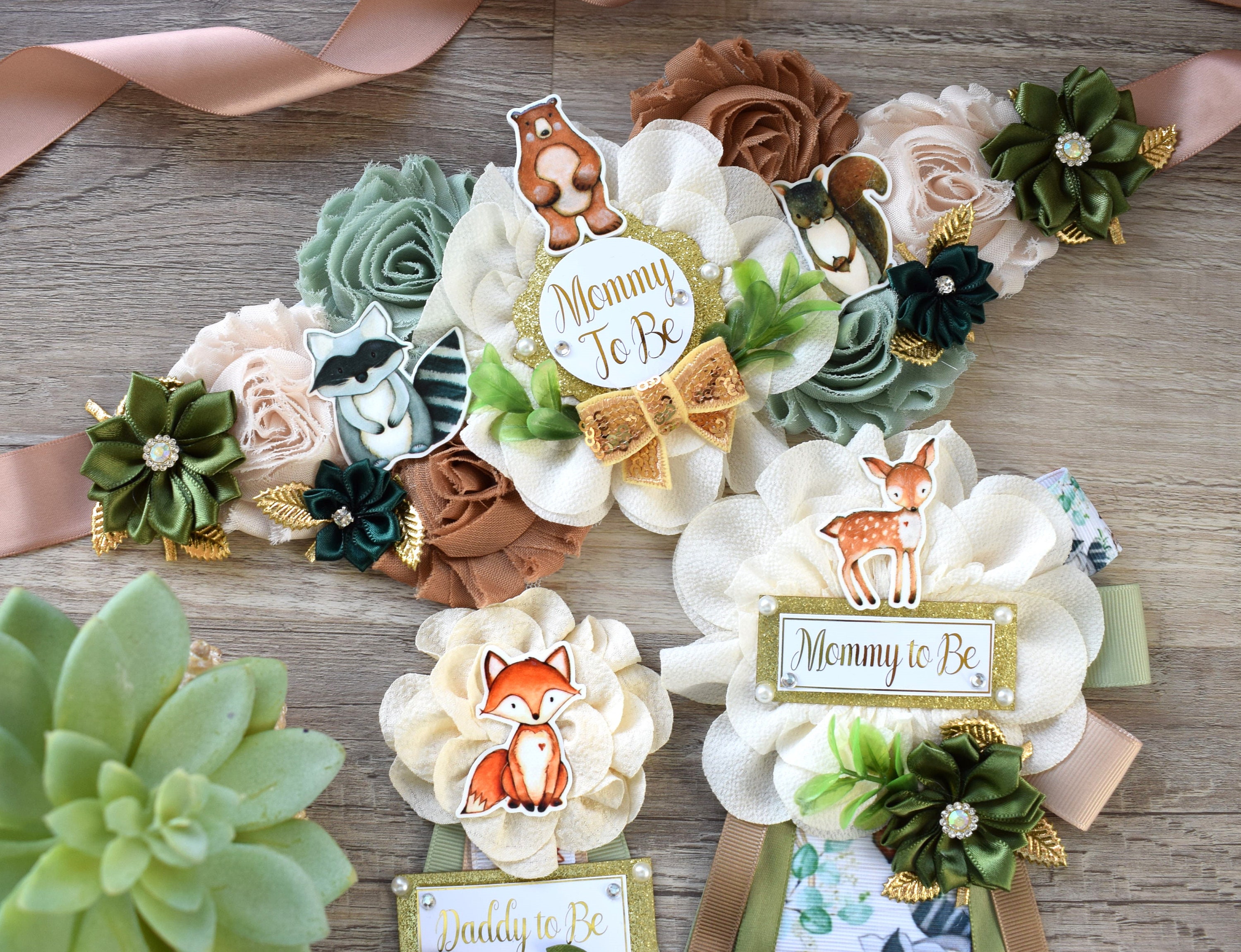 Woodland Baby Shower, Sage Green Fox Raccoon Woodland Maternity Sash, Mommy To Be Ribbon, Daddy To Be Pin, Woodland Baby Shower, Custom