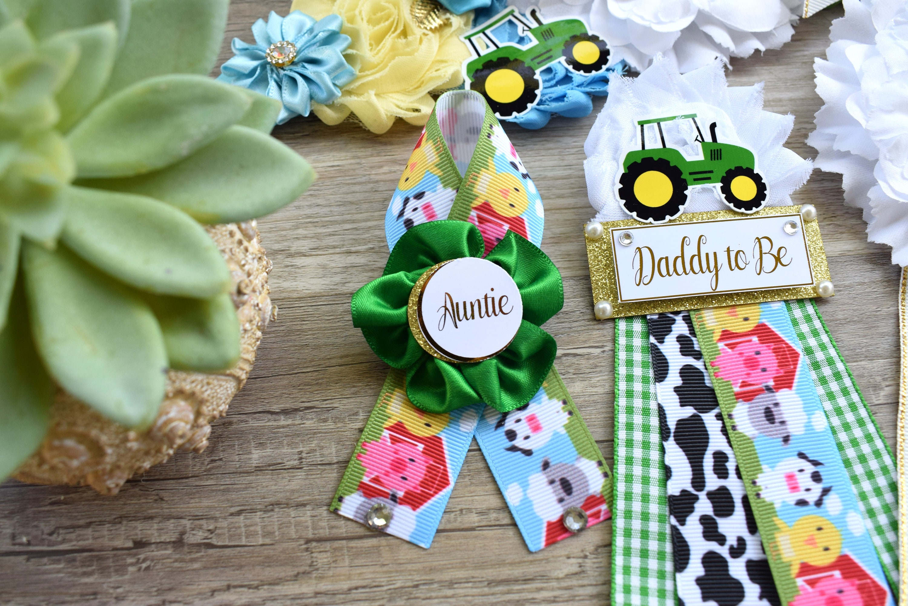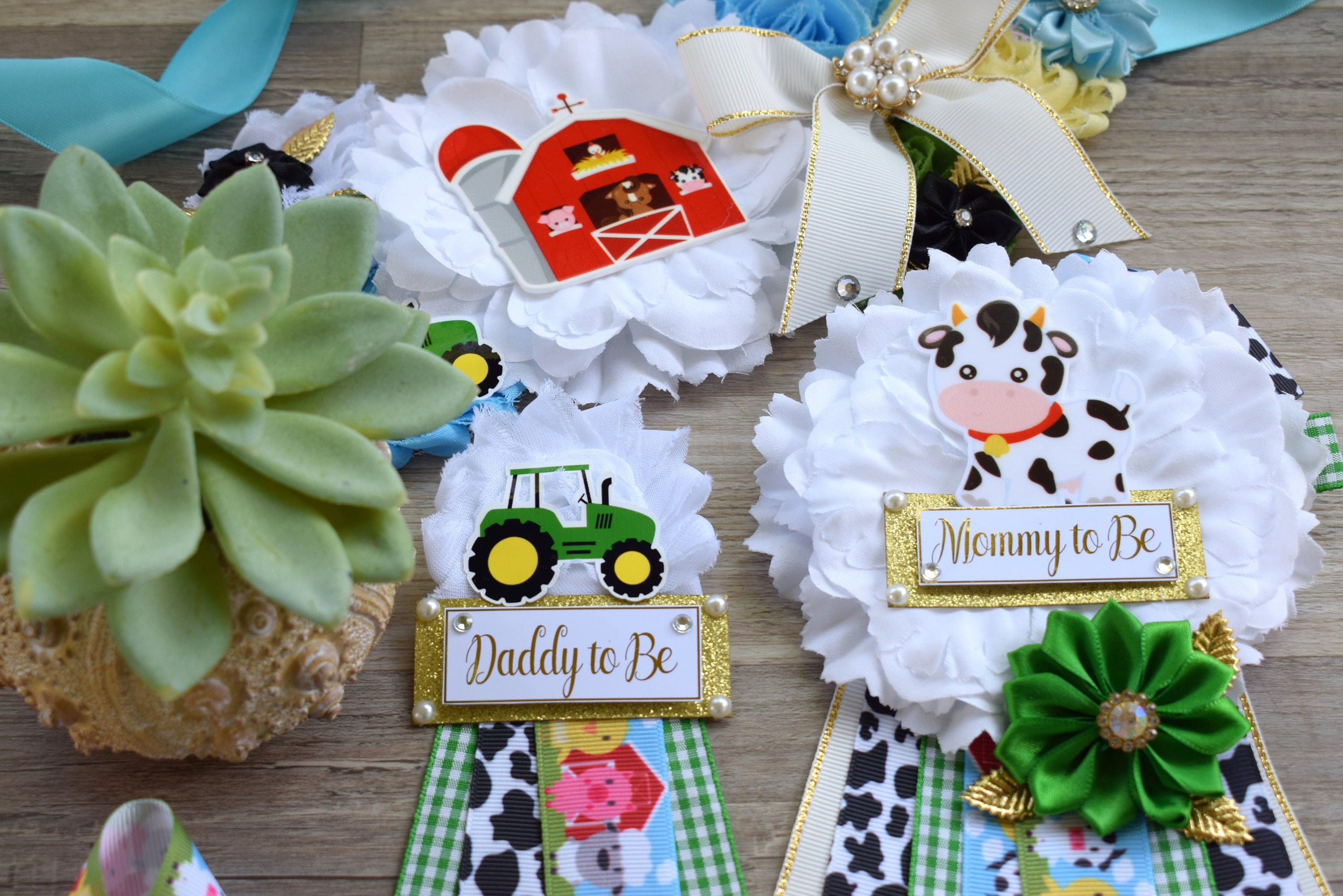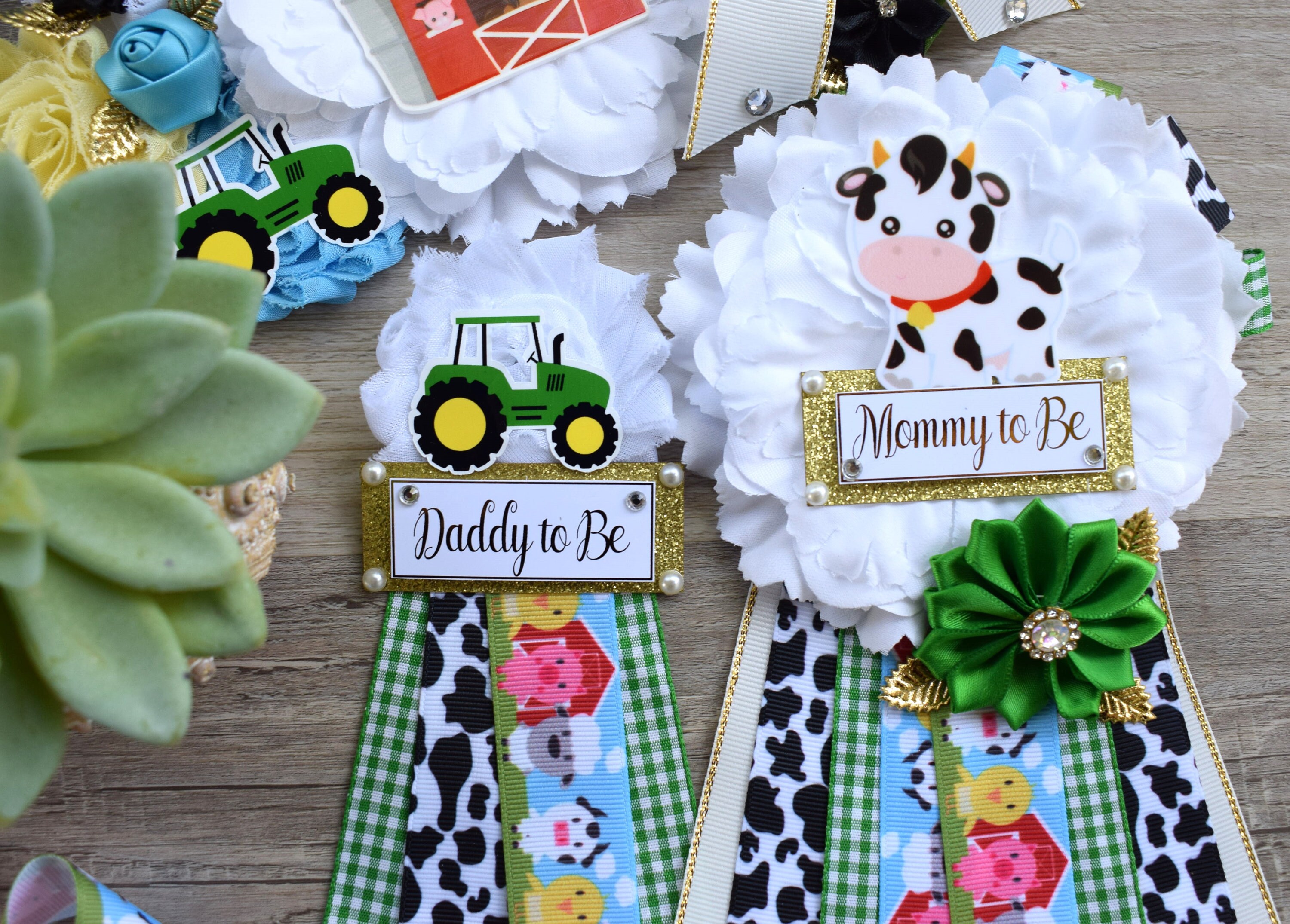 Farm Animal Baby Shower, Barn Animal Baby Shower, Cow Sheep Horse Mommy To Be Ribbon Pin, Daddy To Be Ribbon Pin, Green Truck Baby Shower