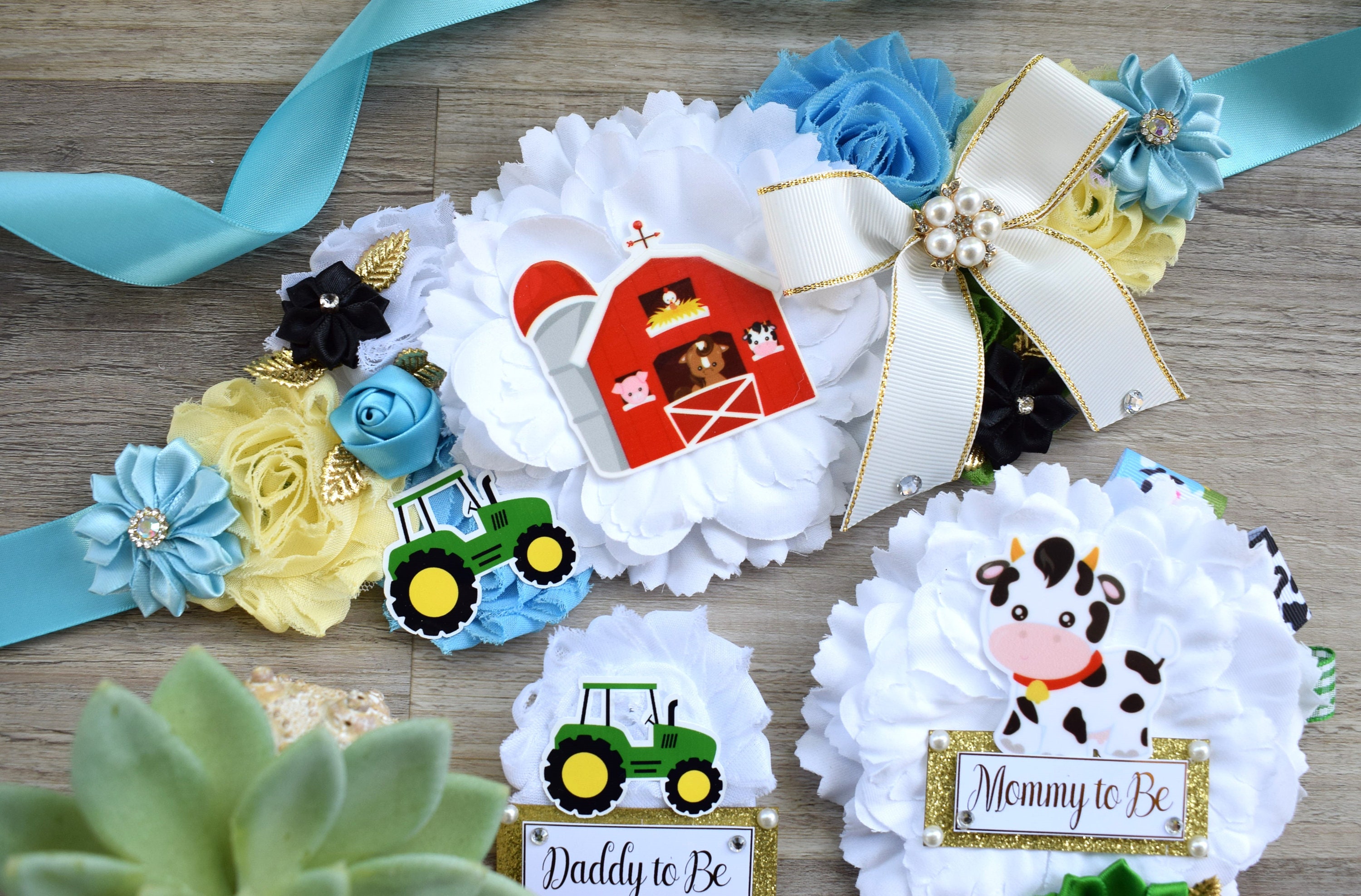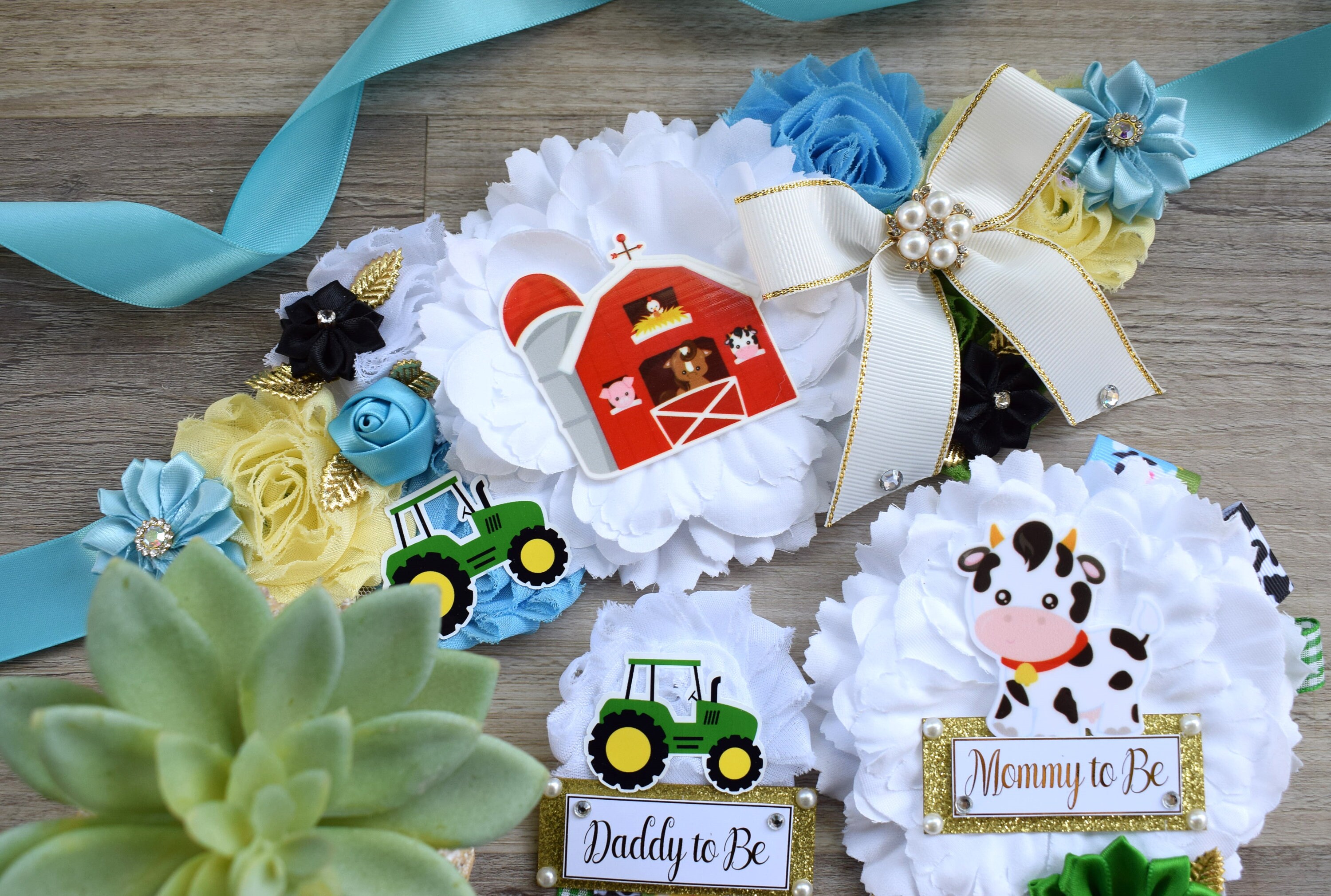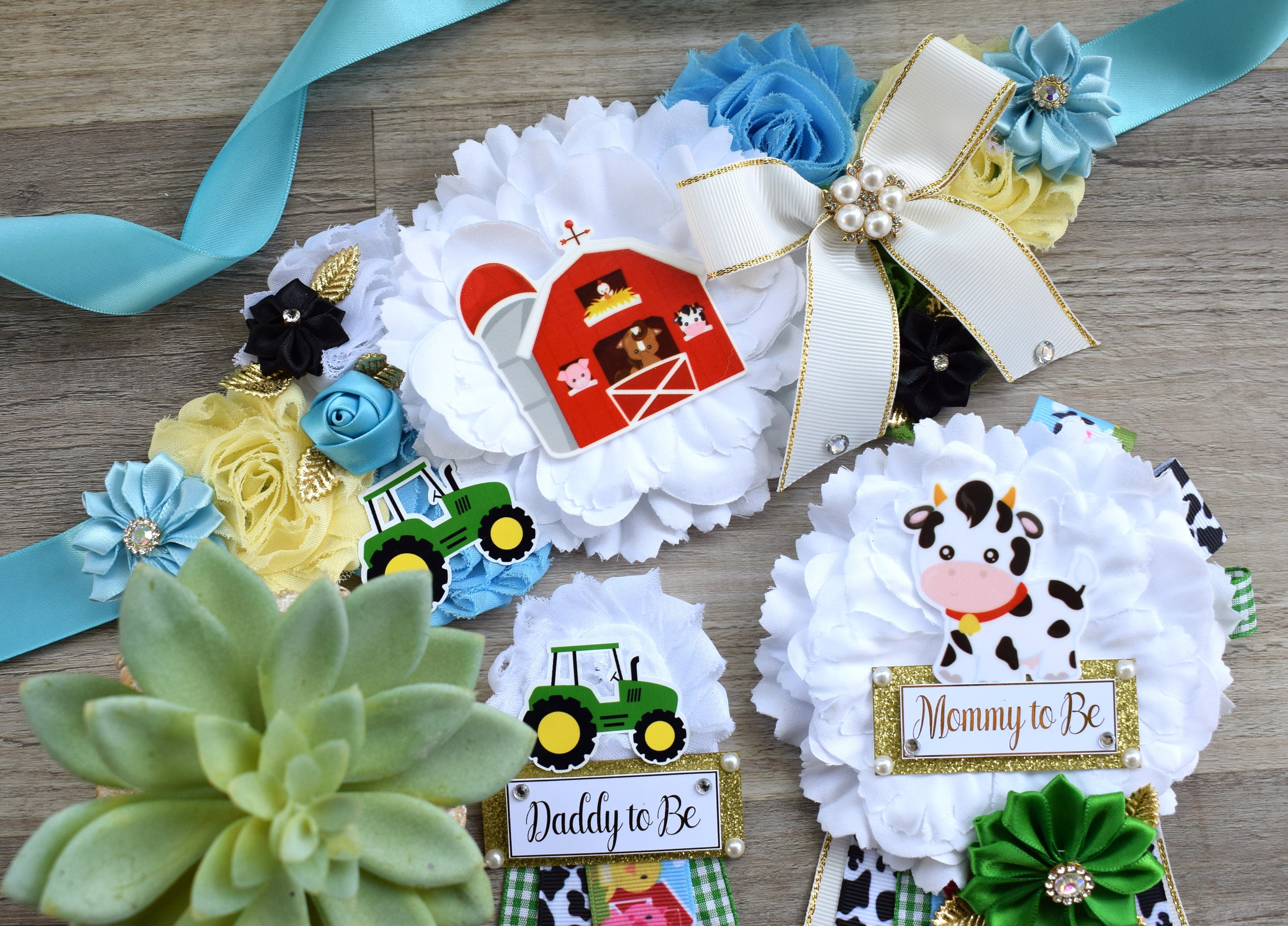 Farm Animal Baby Shower, Barn Animal Baby Shower, Cow Sheep Horse Mommy To Be Ribbon Pin, Daddy To Be Ribbon Pin, Green Truck Baby Shower