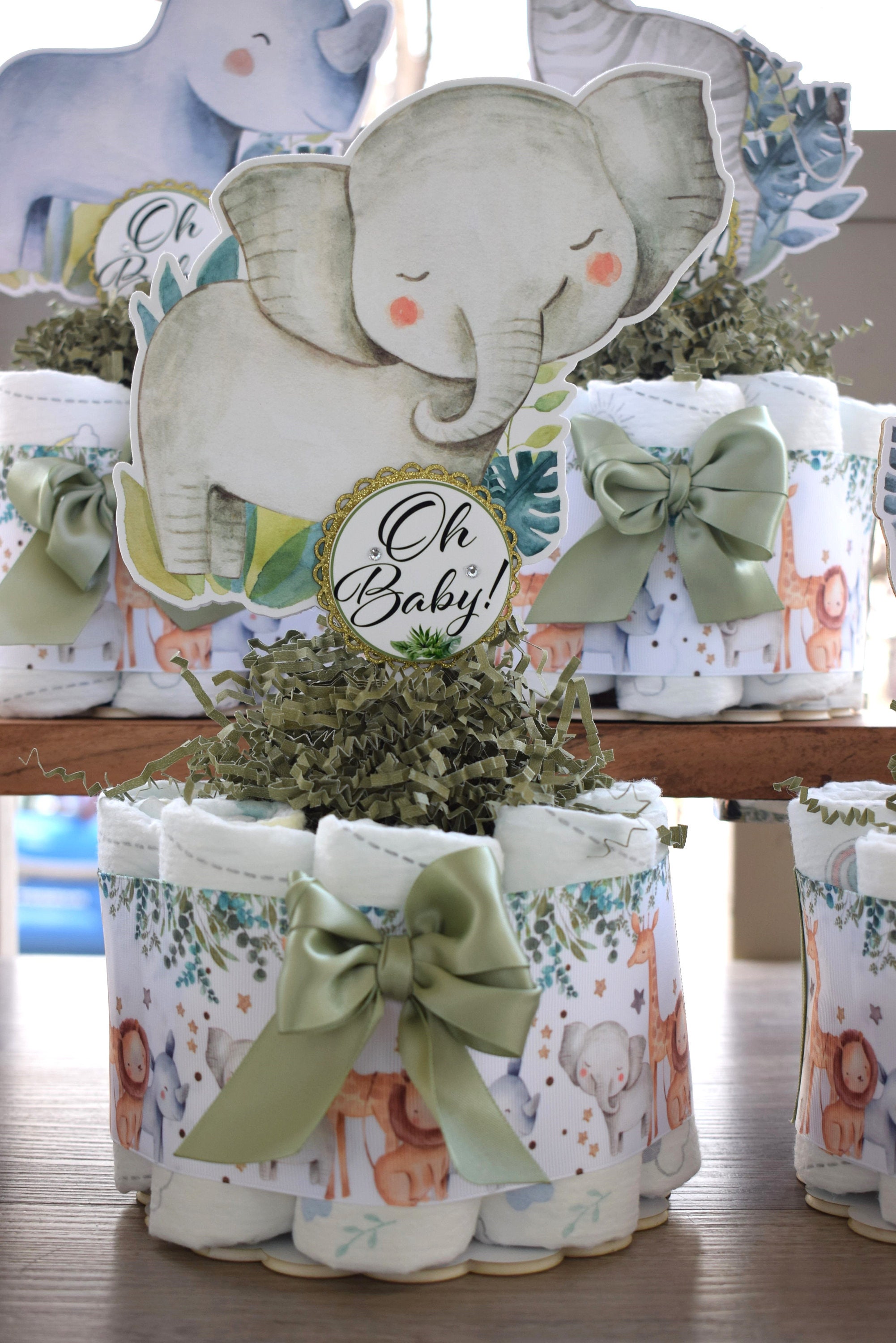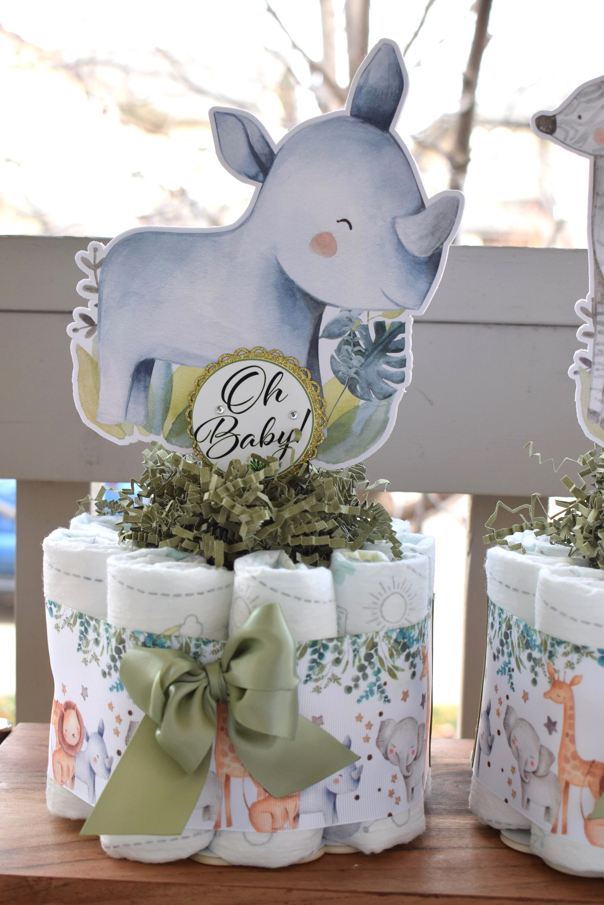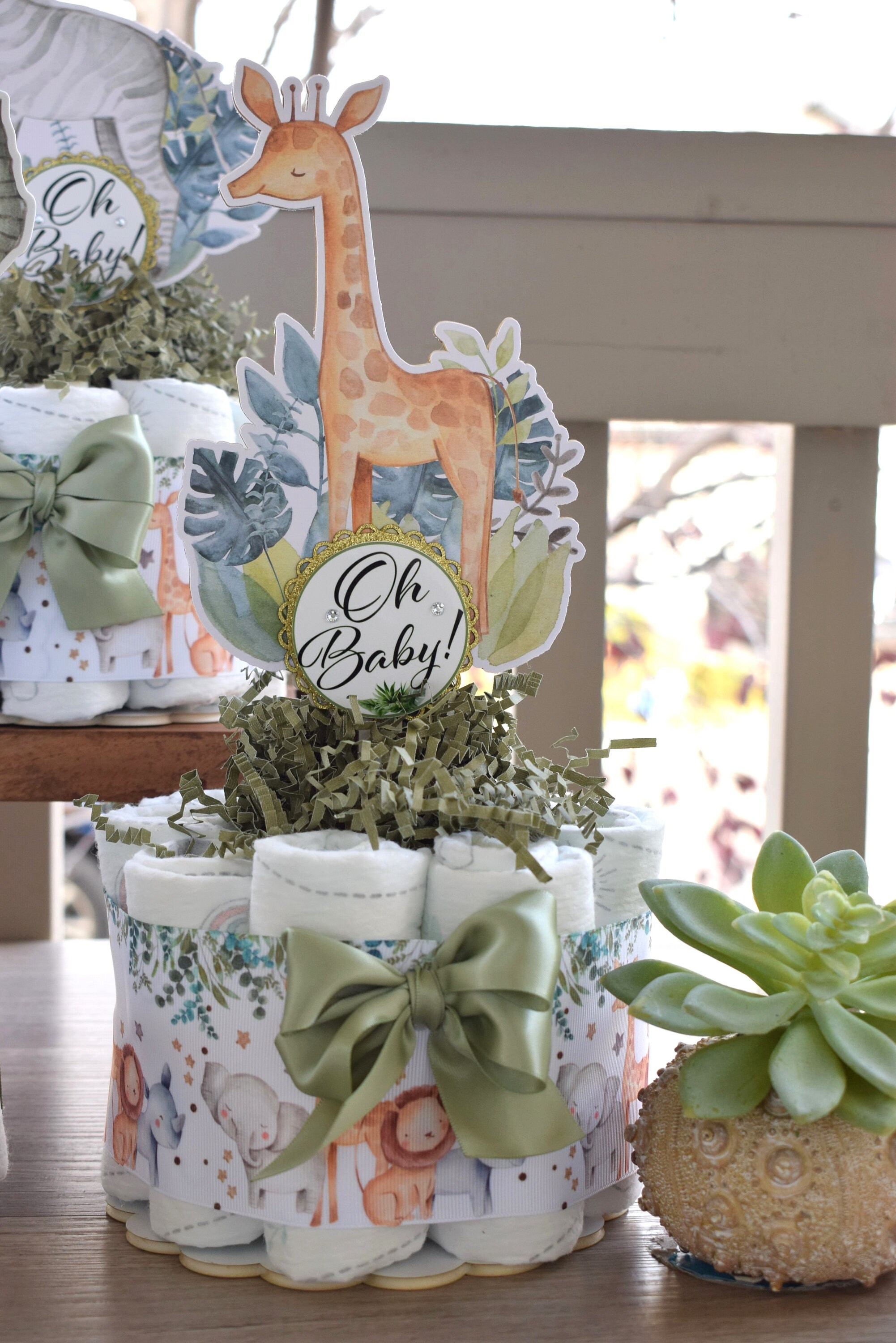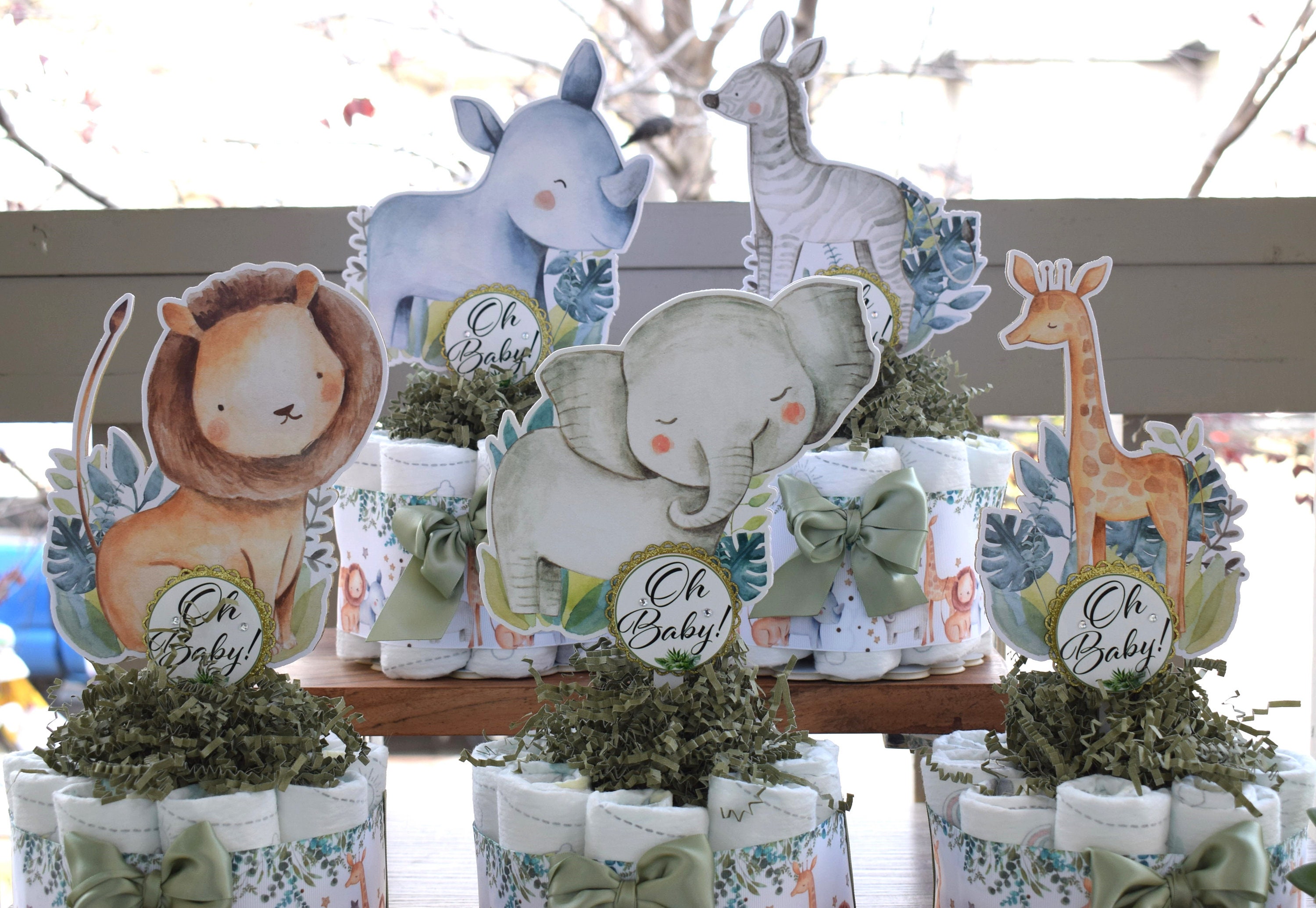 This Gorgeous Jungle Safari Diaper Cakes are the perfect centerpieces for your baby shower. We can match any shower theme.