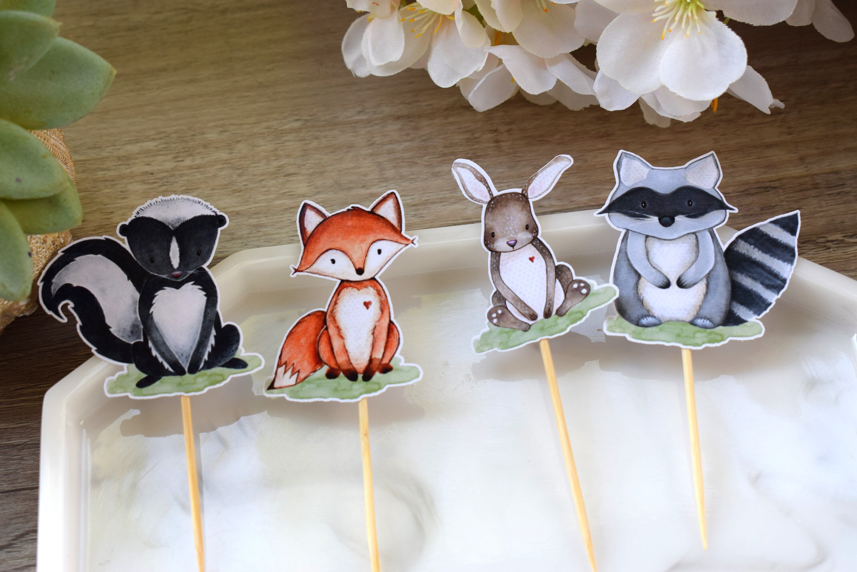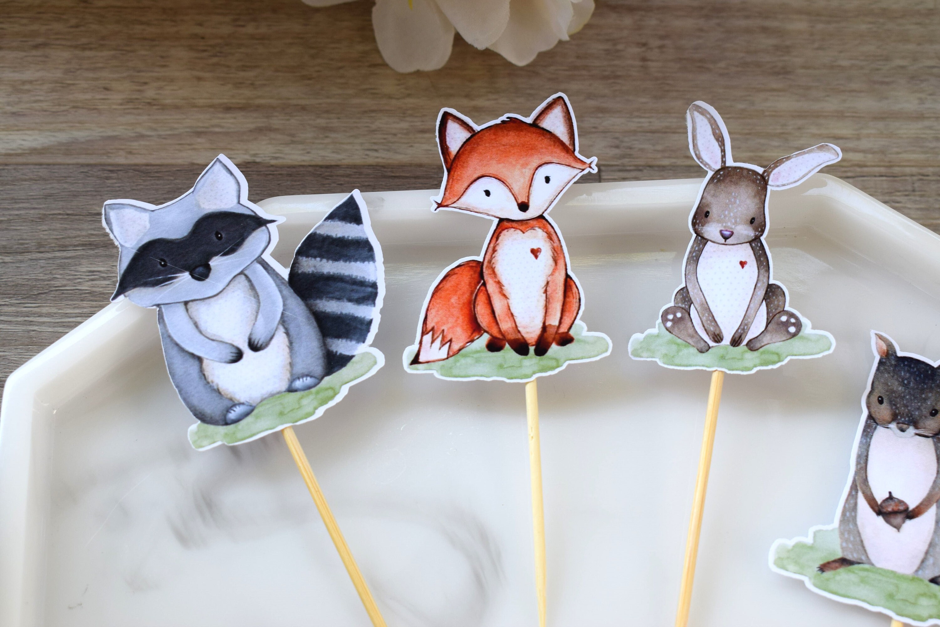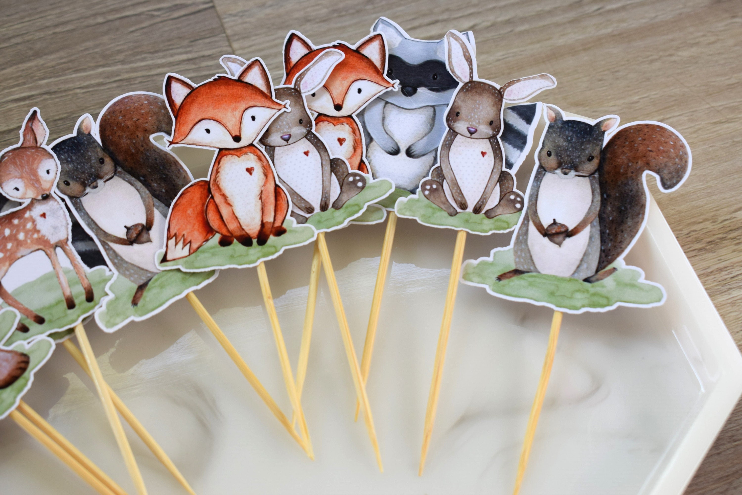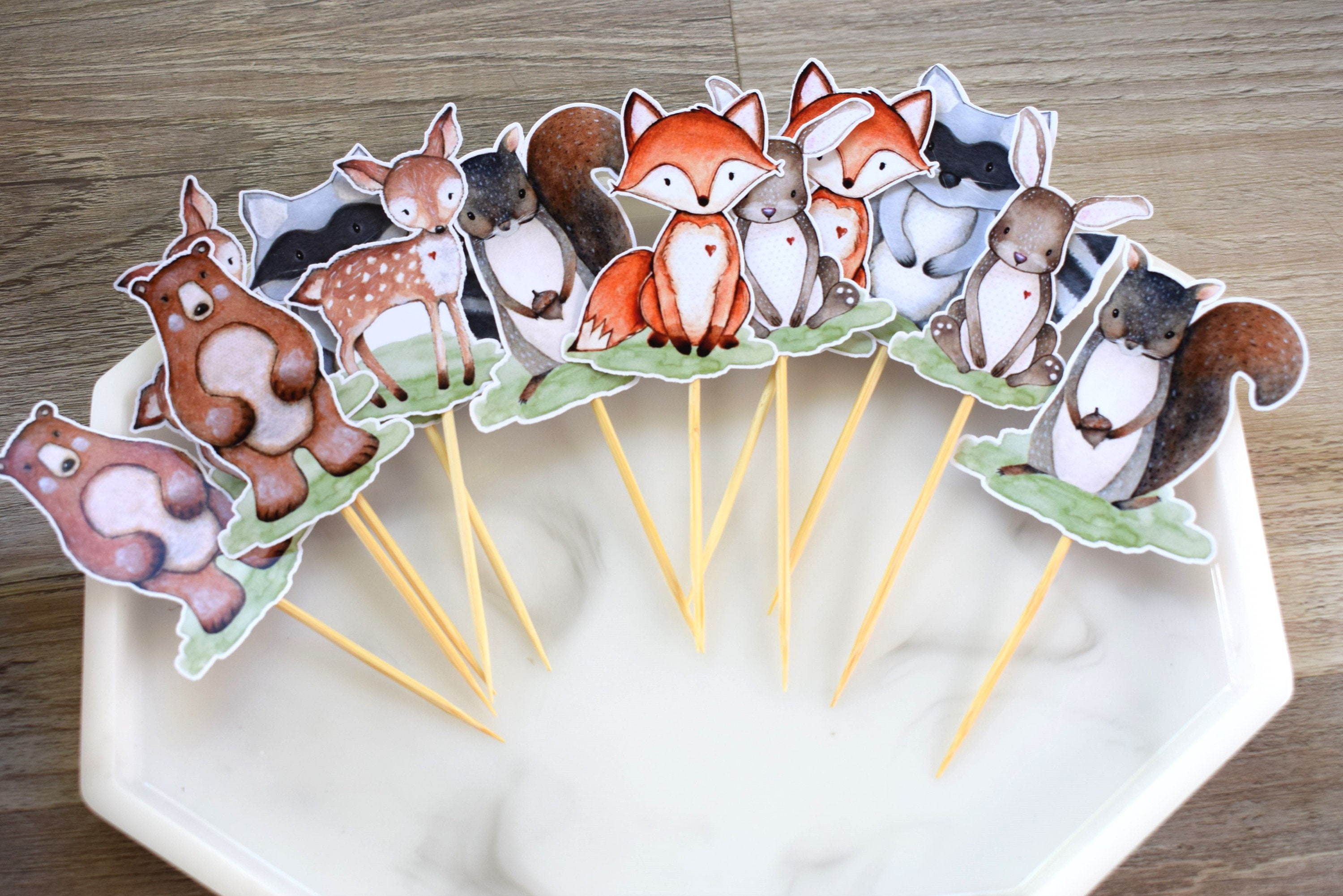 12 Woodland Cupcake, Cupcake Toppers, Baby Shower, Fox Bear Deer Rabbit Raccoon Skunk & Squirrel, Baby Shower Decorations - S0005
