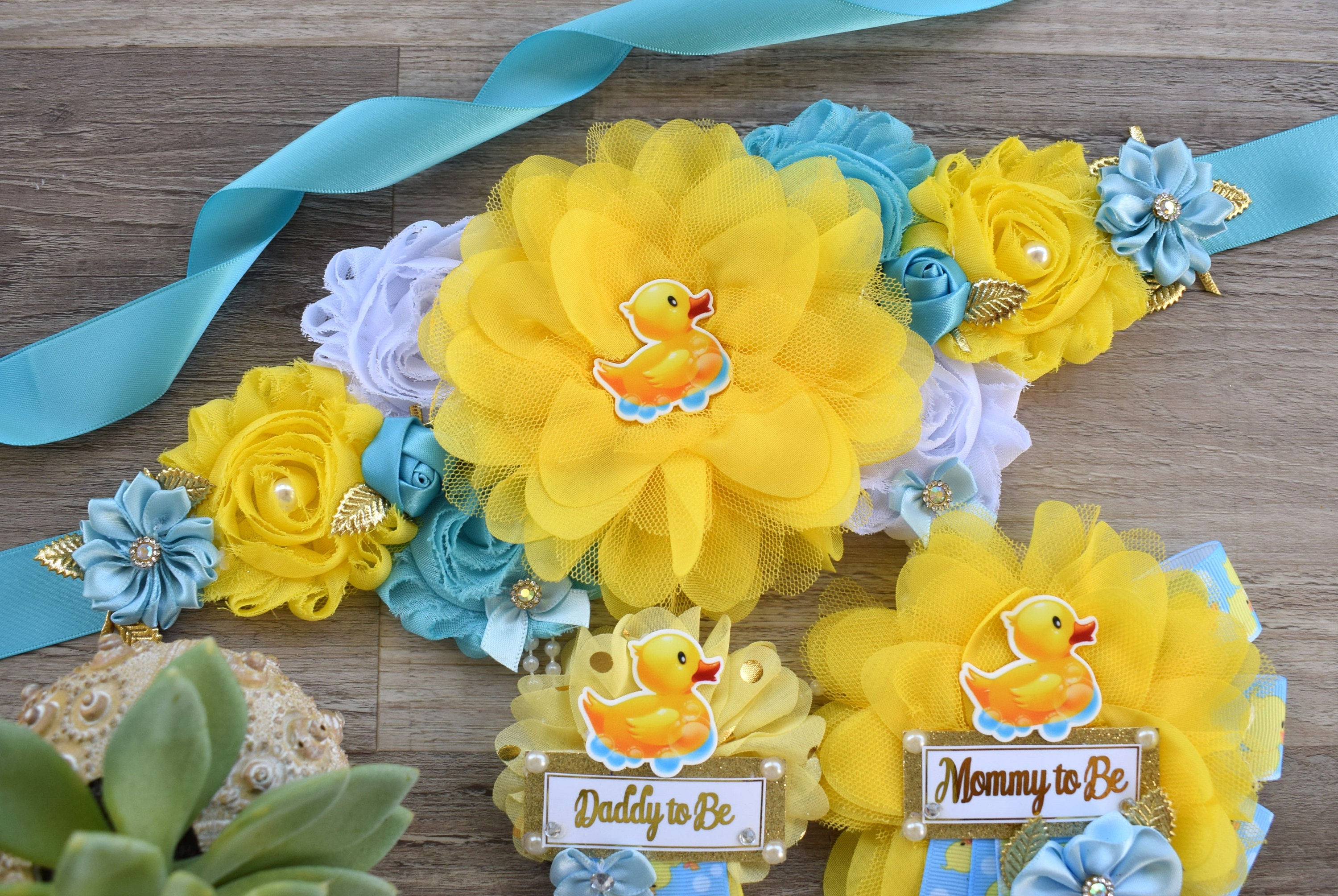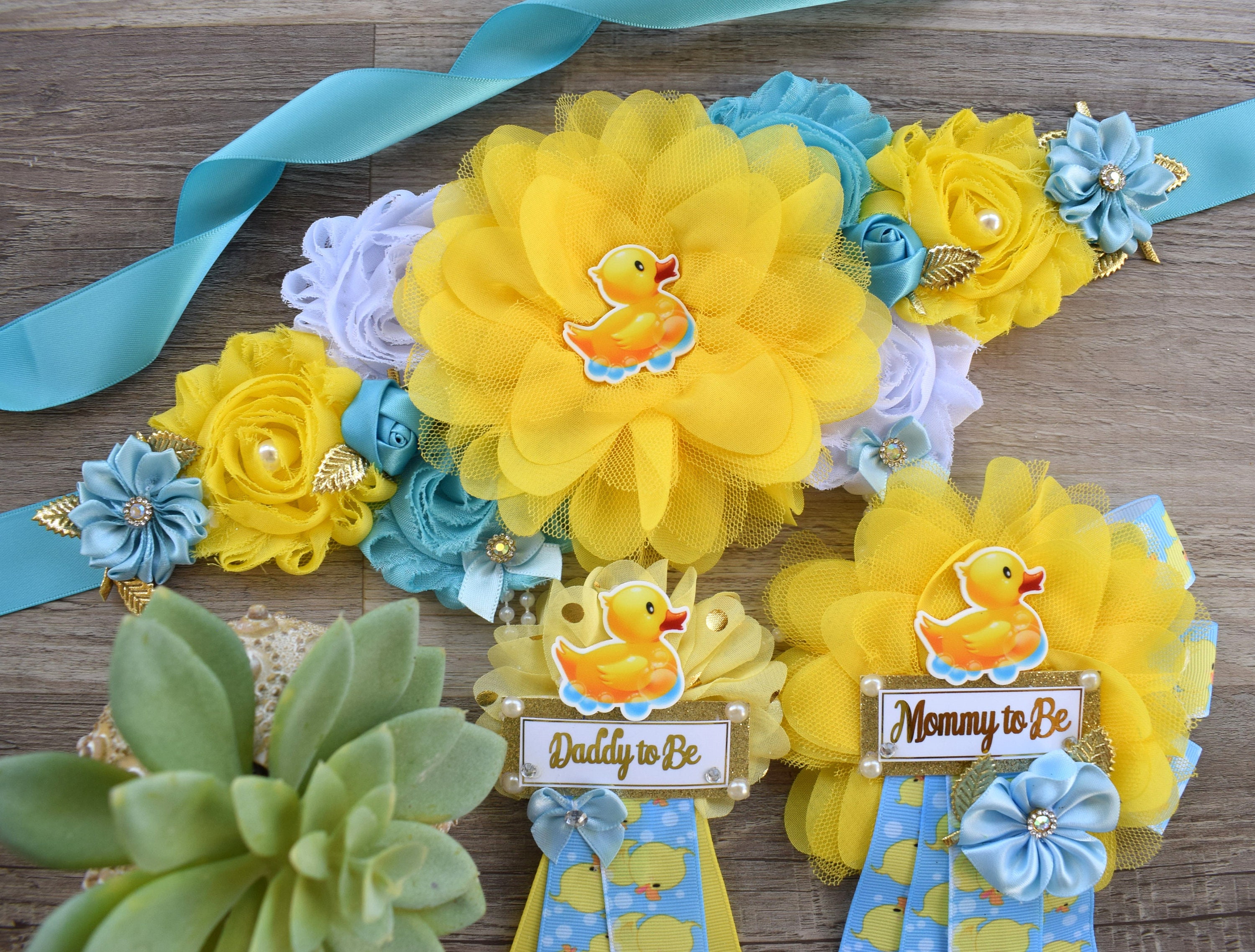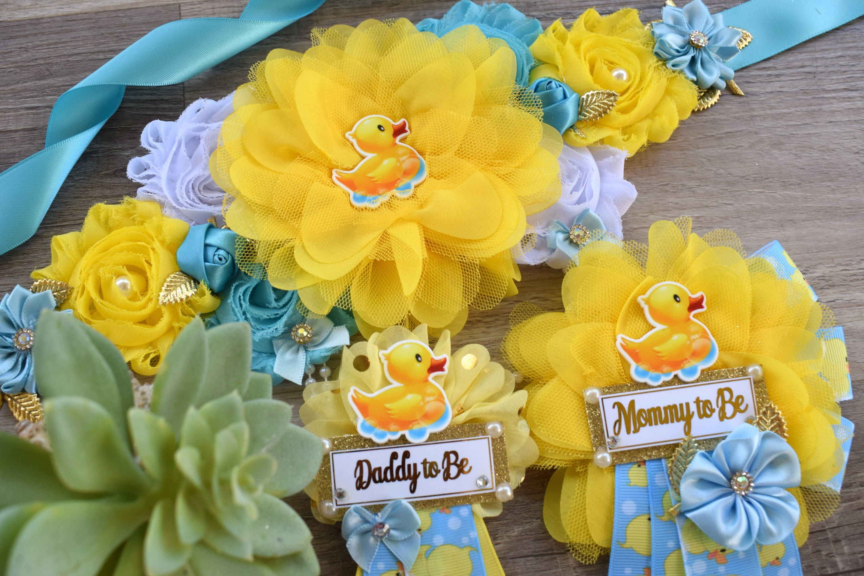 Boy Rubber Duck Baby Shower, Duck Maternity Sash, Yellow Blue Rubber Mommy To Be Ribbon, Duck Daddy To Be Pin, Custom
