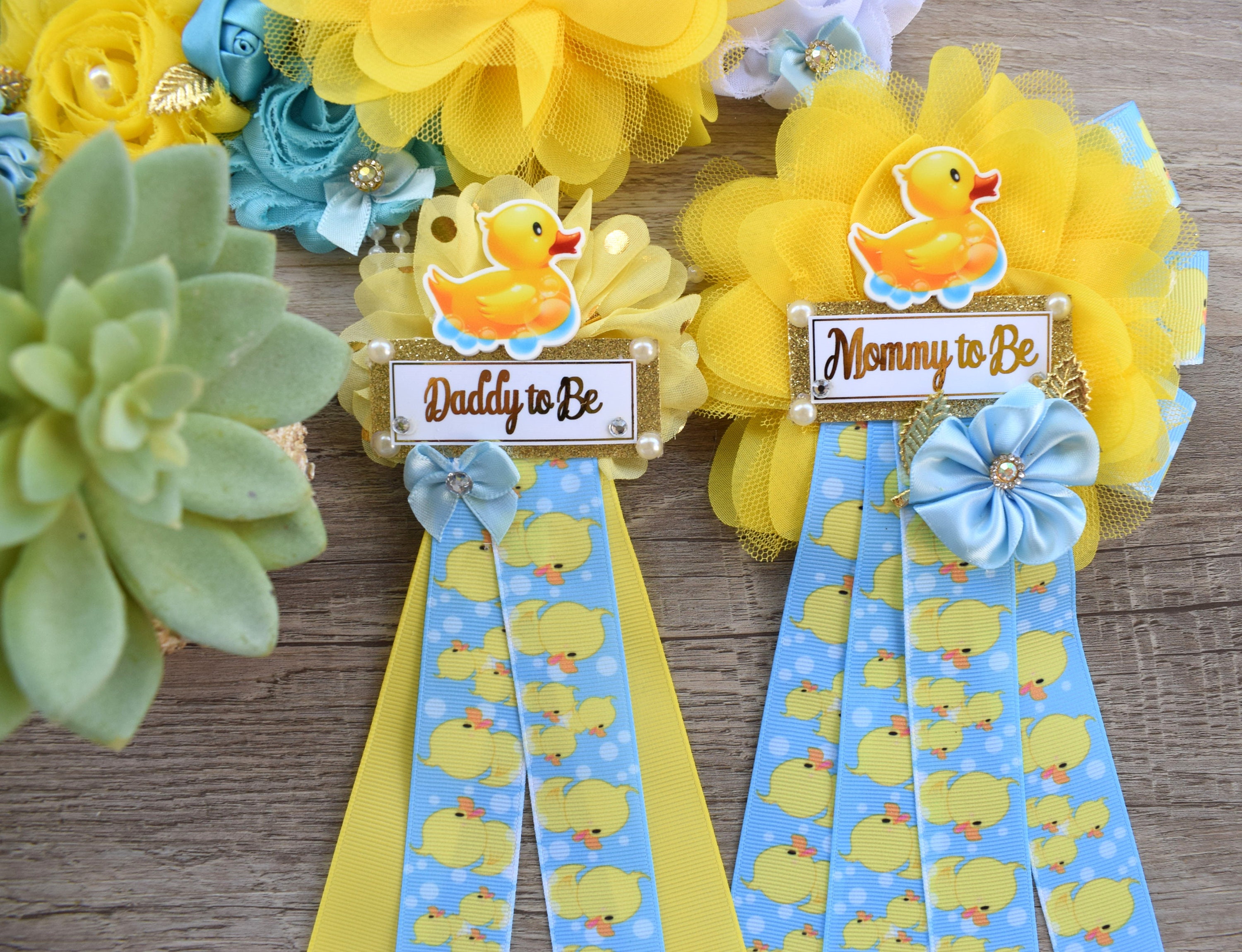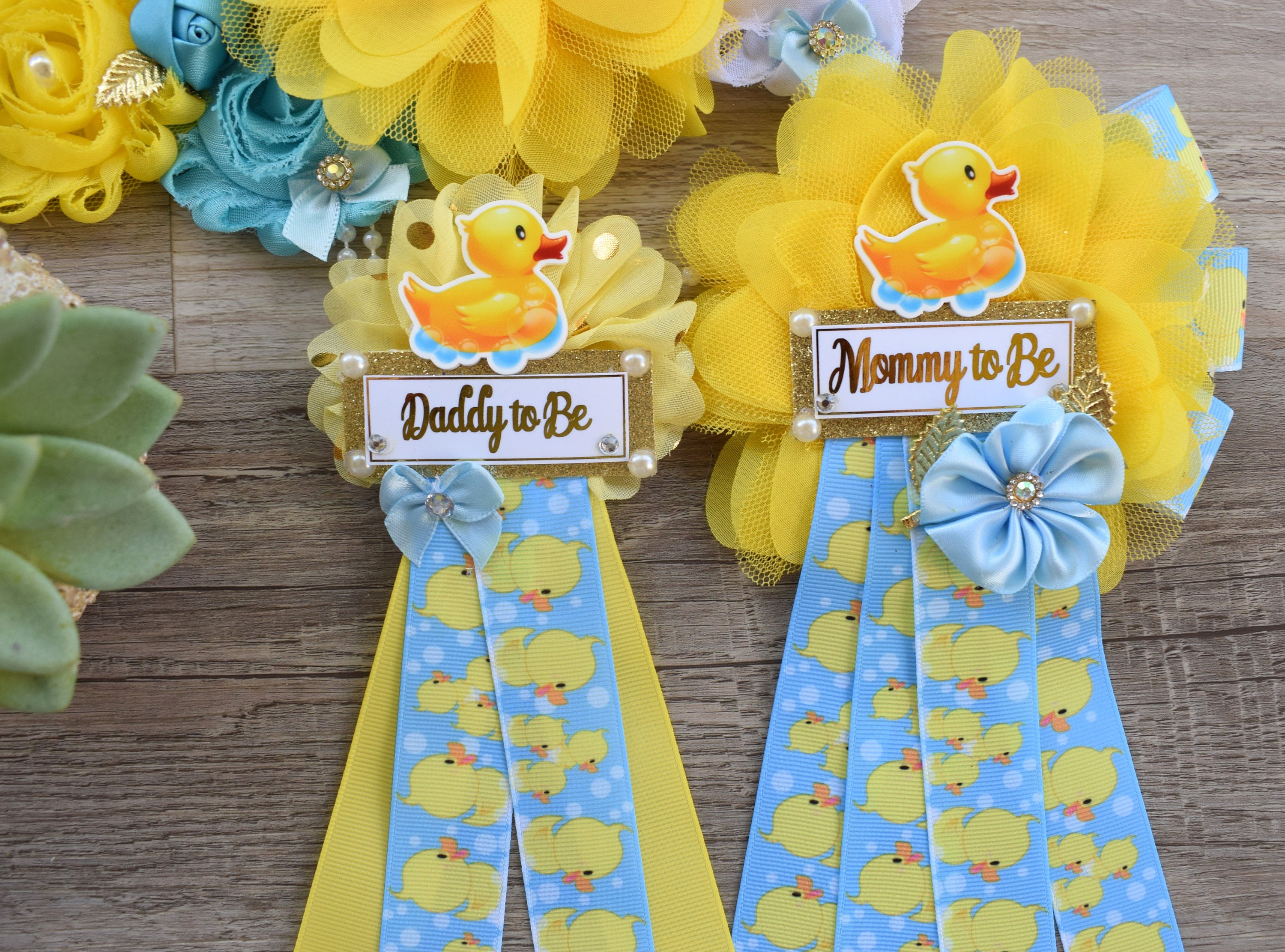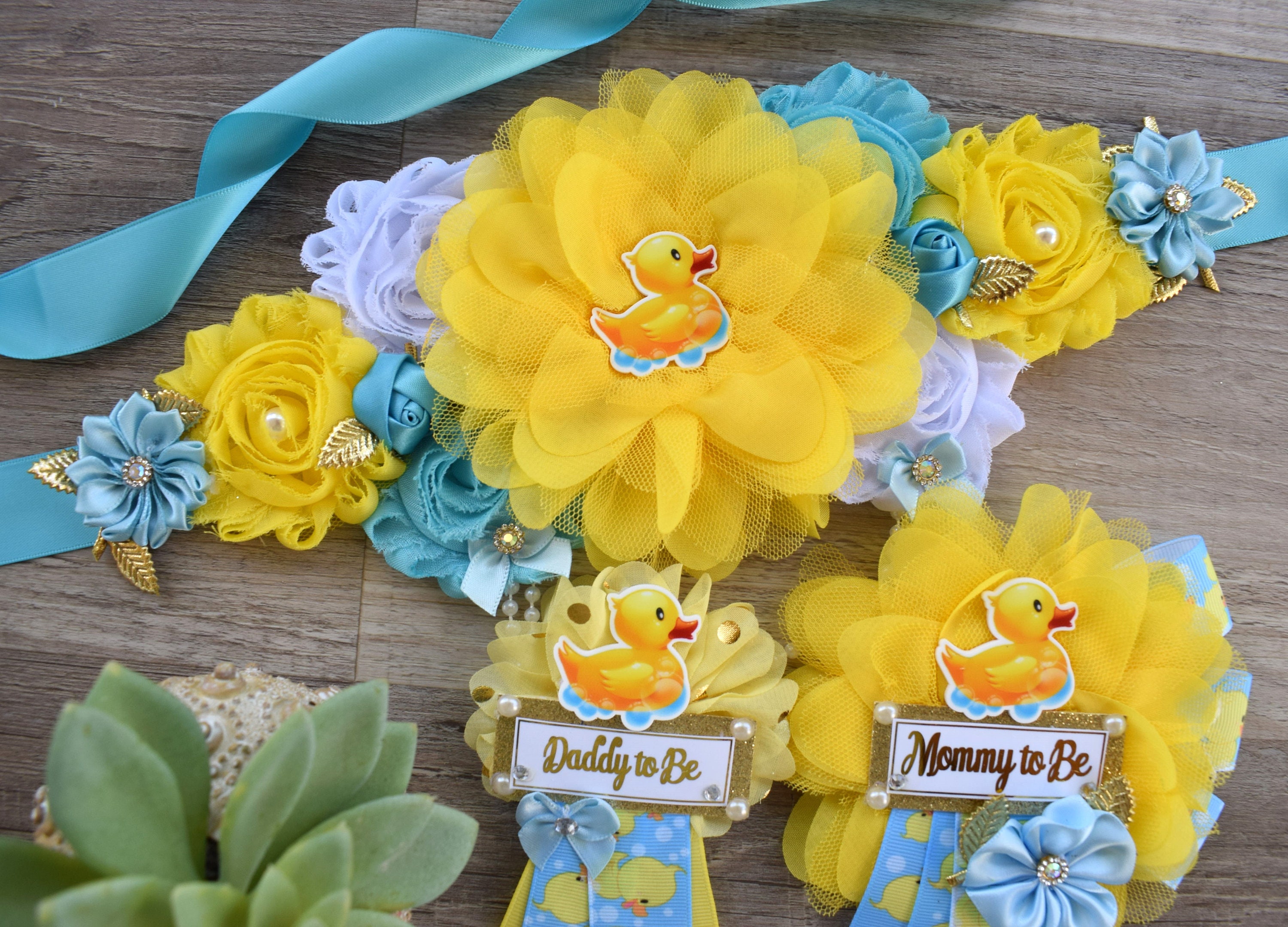 Boy Rubber Duck Baby Shower, Duck Maternity Sash, Yellow Blue Rubber Mommy To Be Ribbon, Duck Daddy To Be Pin, Custom