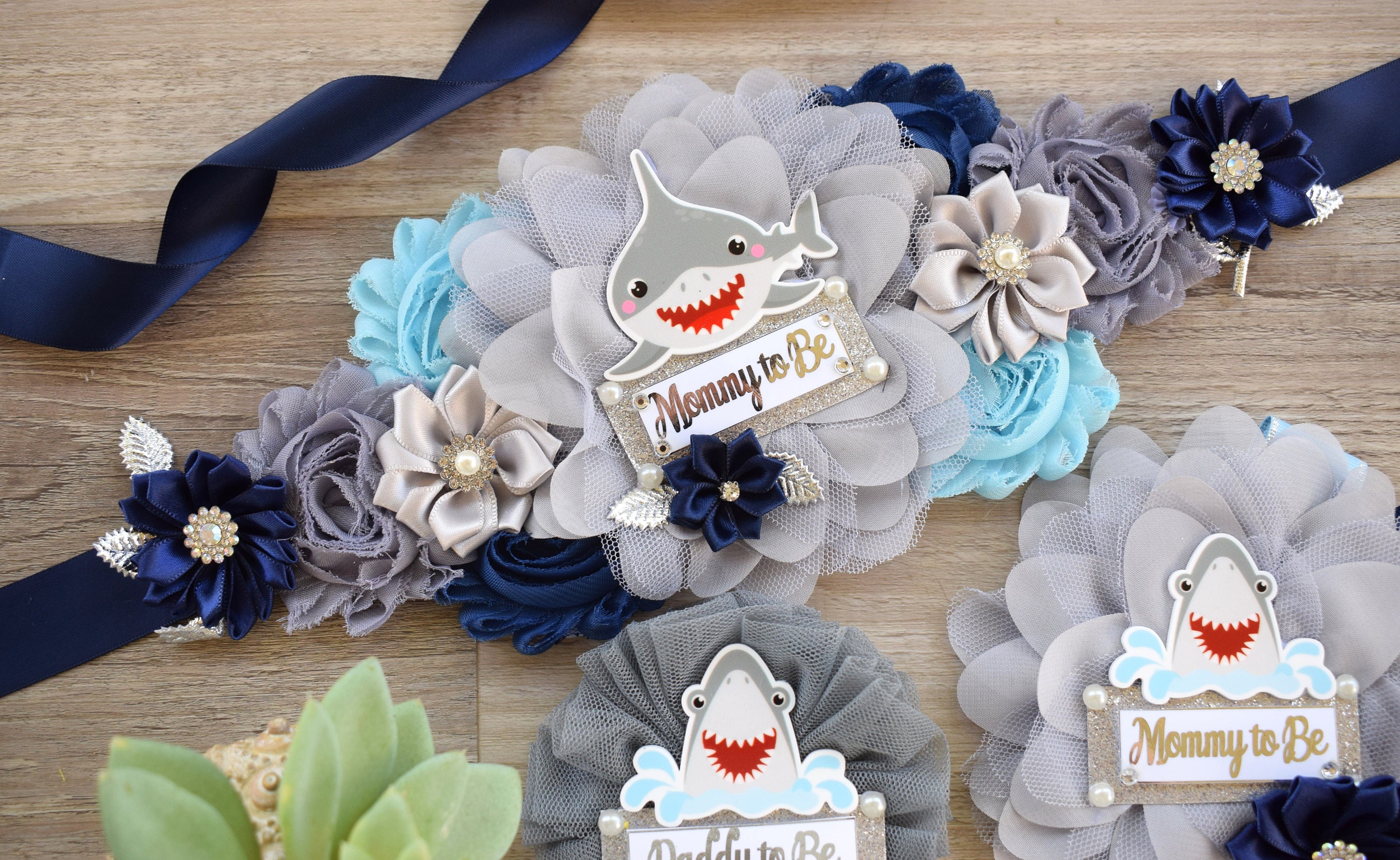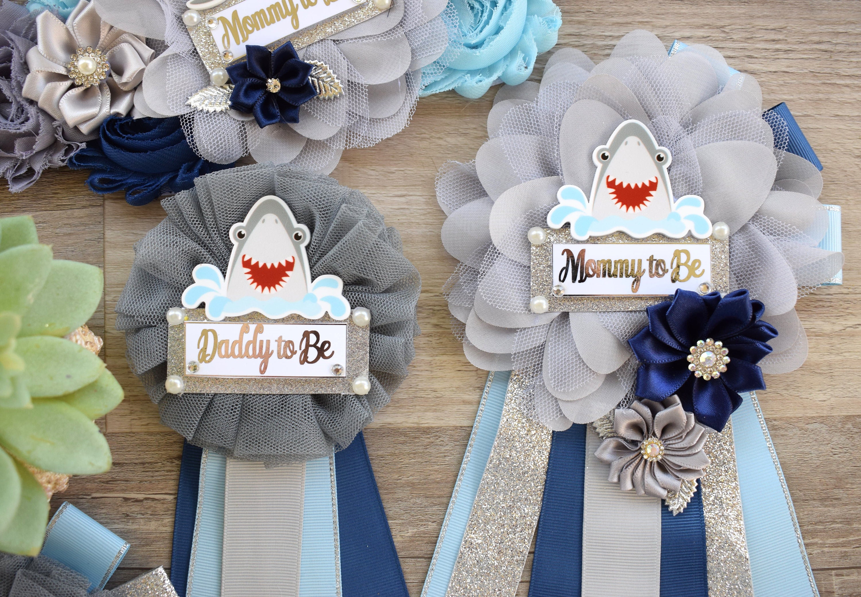 Shark Baby Shower, Blue Gray Maternity Sash, Shark Blue Grey Blue Baby Shower, Shark Mommy To Be Ribbon, Daddy To Be Pin, Custom