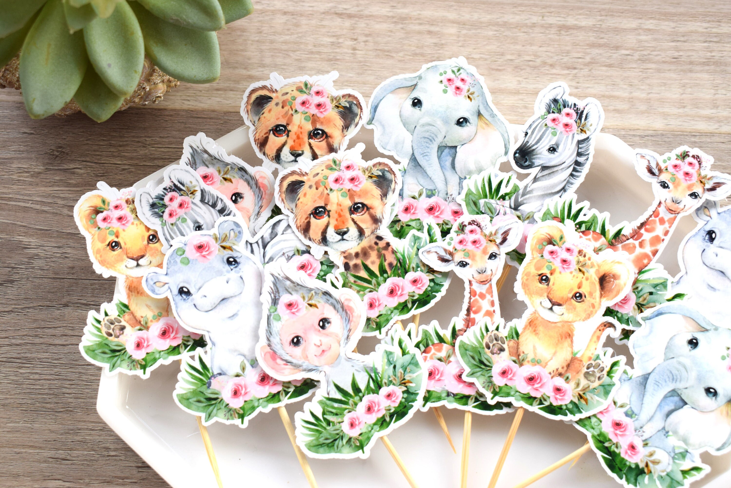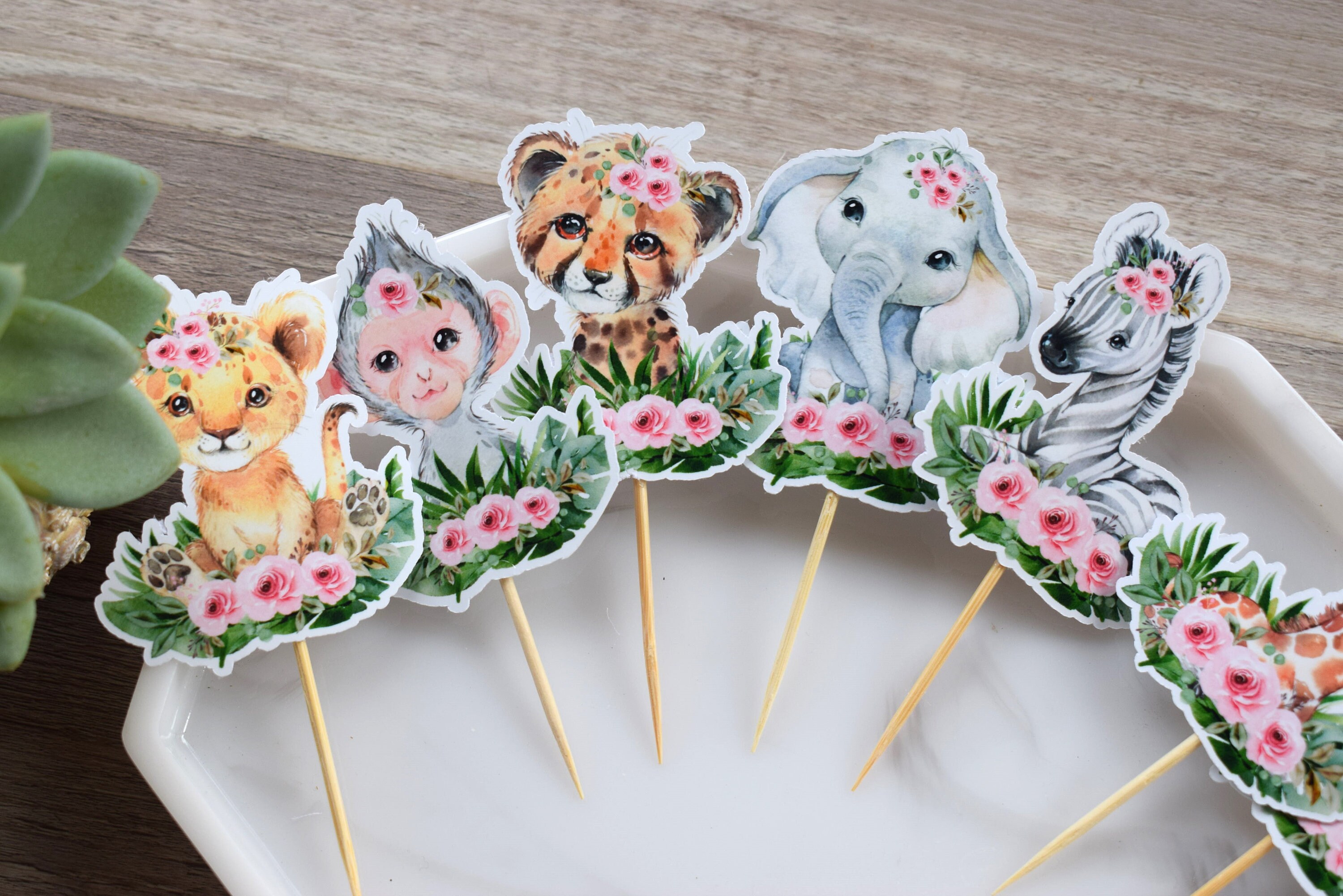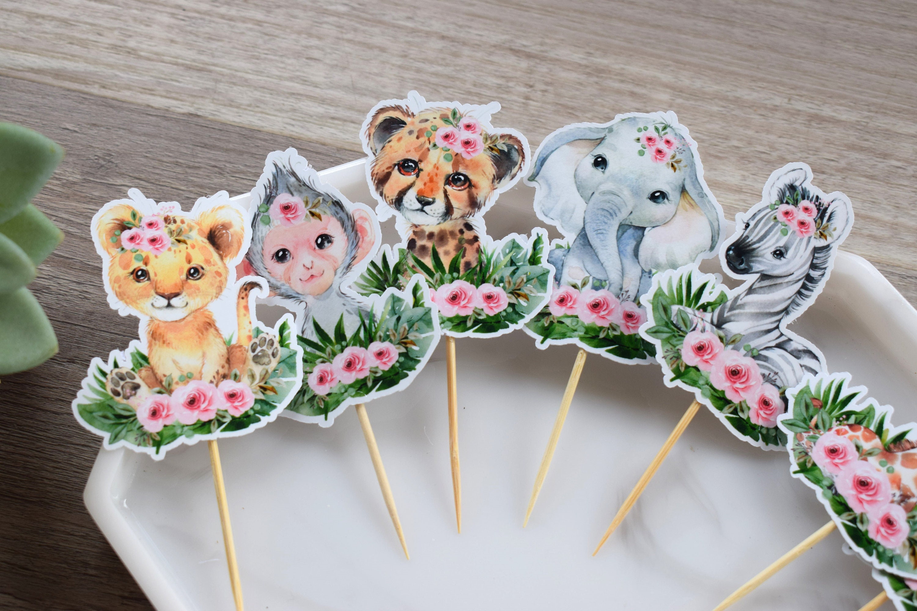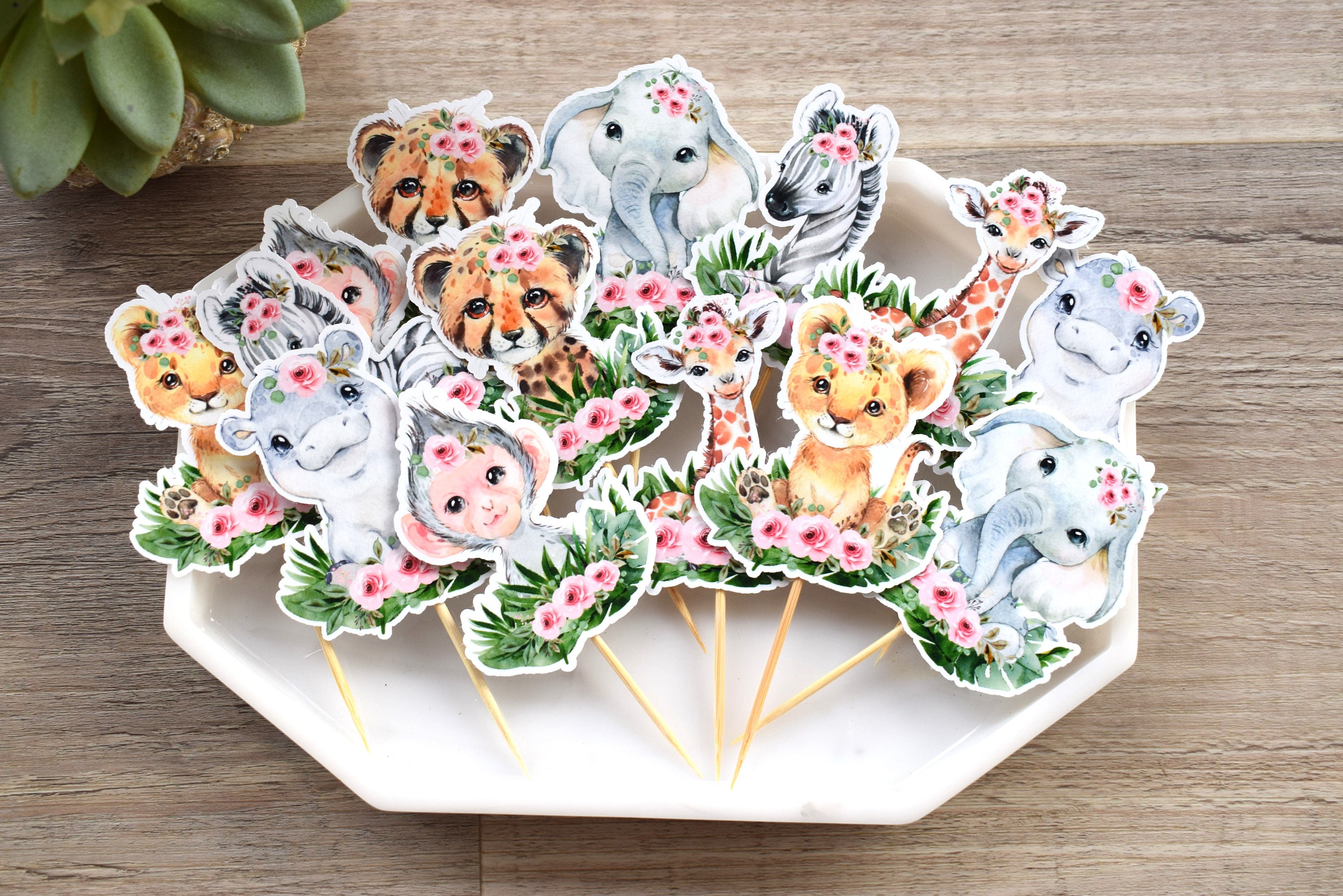 12 Safari Cupcake Toppers, Baby Shower, Party, Cupcake, Giraffe Zebra Elephant Tiger, Baby Shower Decorations, Custom S0002