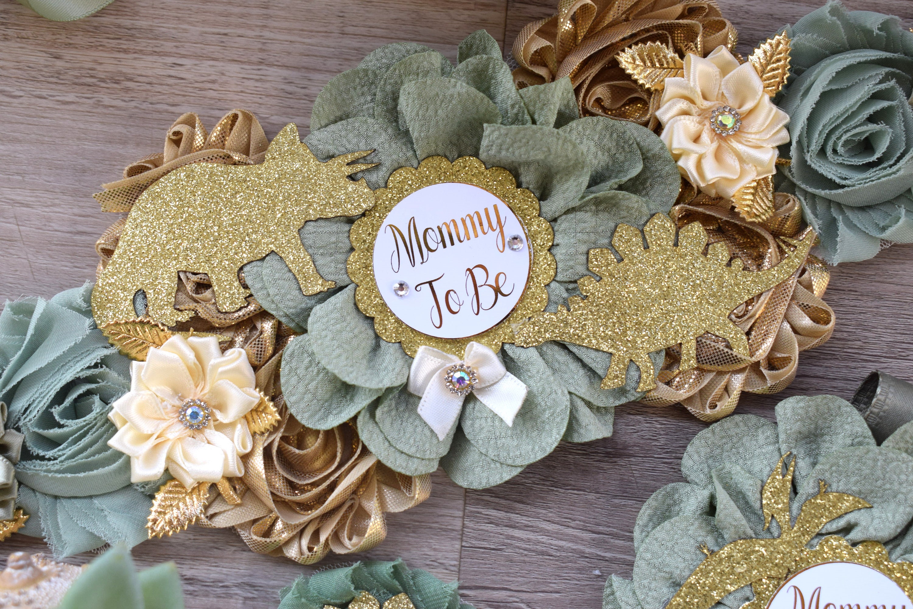 ☆ Maternity Sash: This has eleven flowers in sage, tan and gold colors embellished with rhinestones and pearls. Additionally, this sash is decorated with safari animals. The ribbon sash is 80'' (2 meters) long.