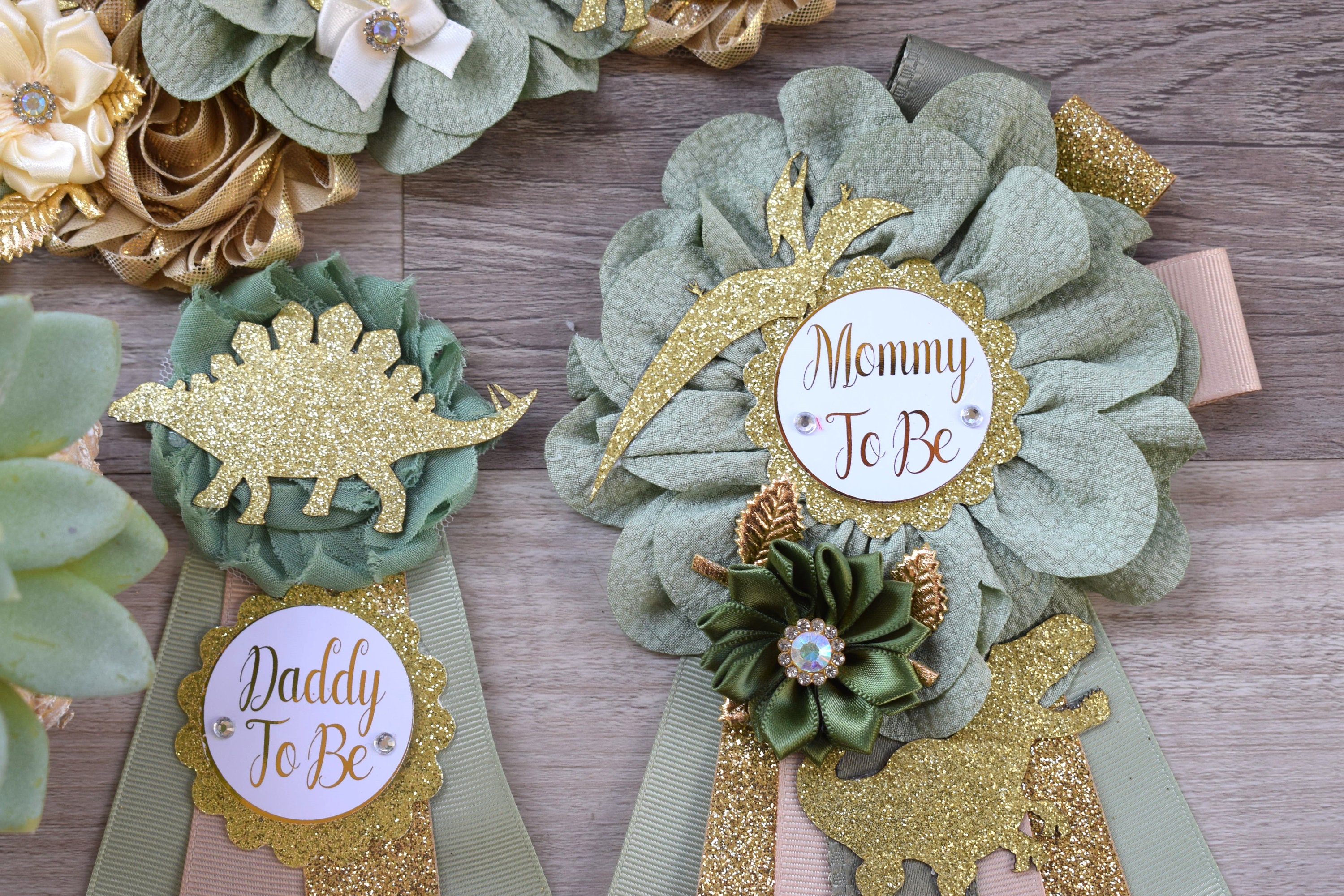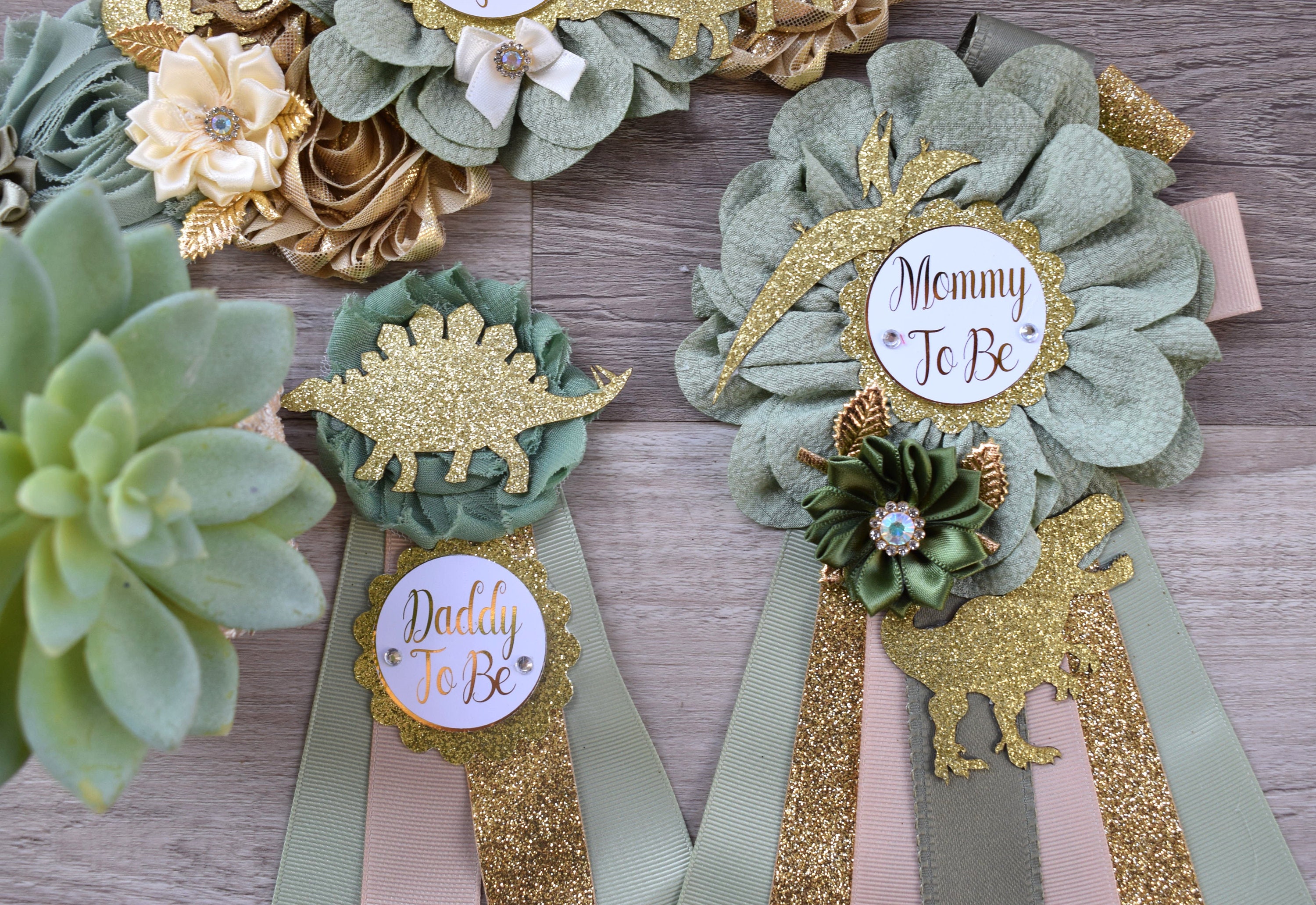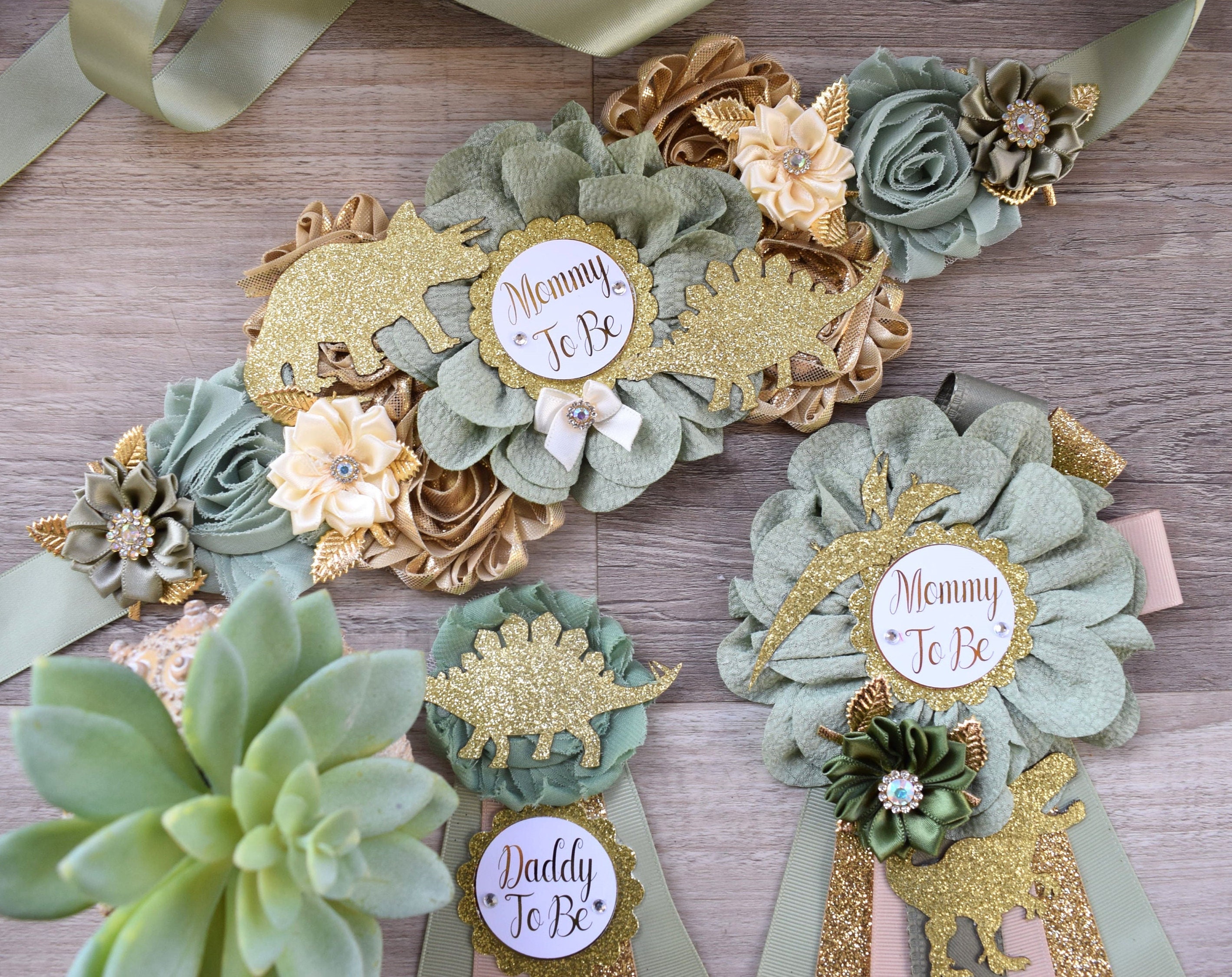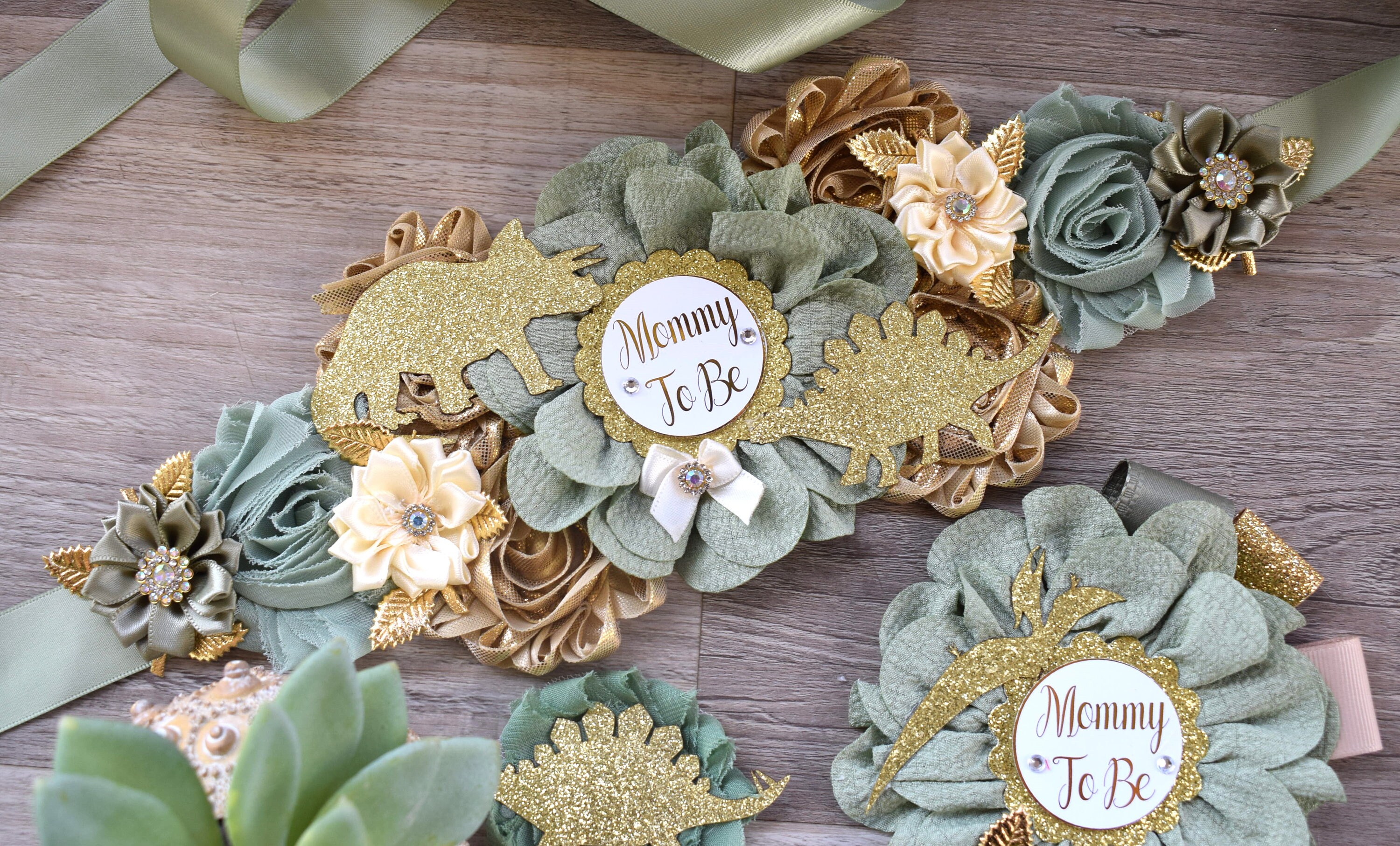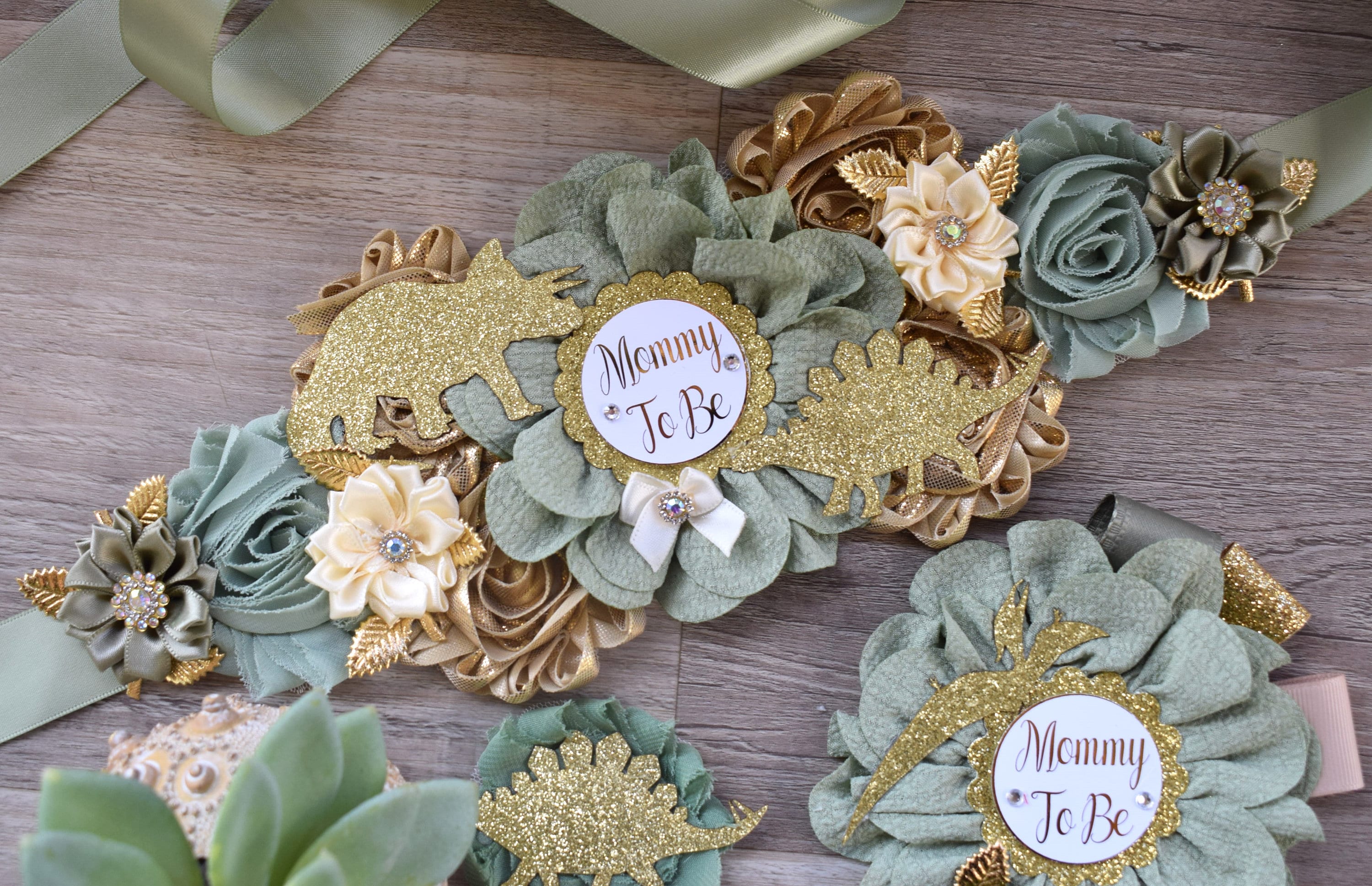 Dinosaur Baby Shower, Green Gold Flower Sash, Gold Dinosaur Animals, Greenery Gold Maternity Sash, Green Gold Dinosaur Baby Shower, Custom