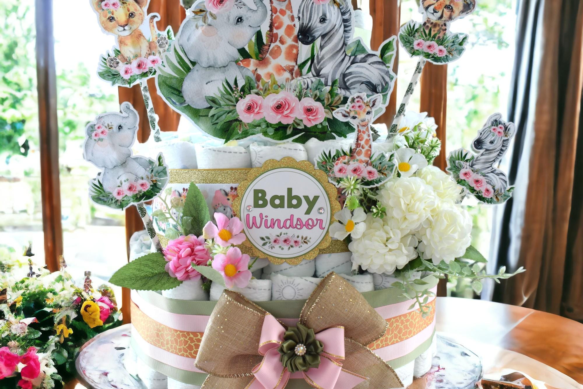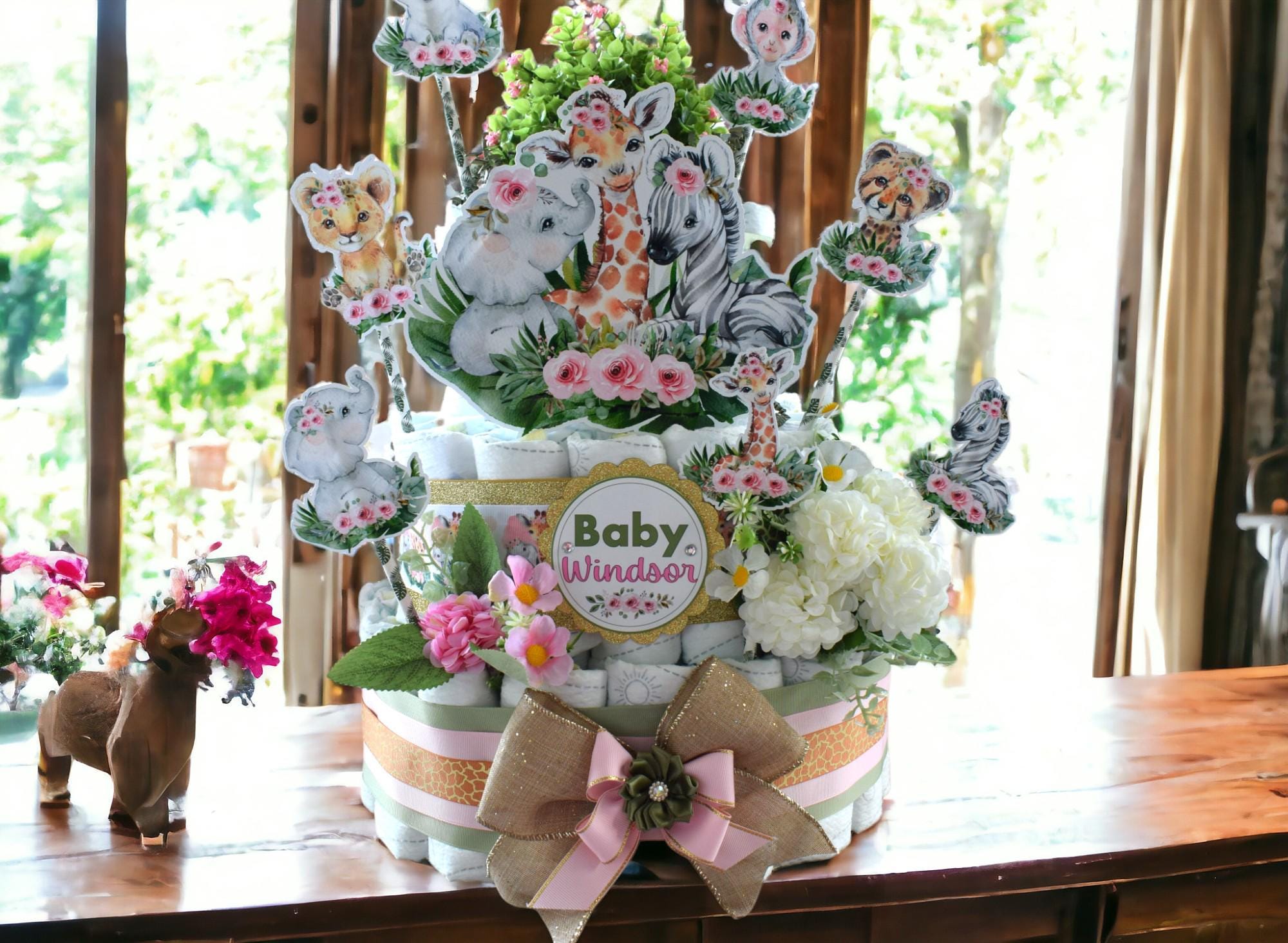 This Gorgeous Jungle Safari Diaper 3 Tiers Cake are the perfect centerpieces for your baby shower. We can match any shower theme.