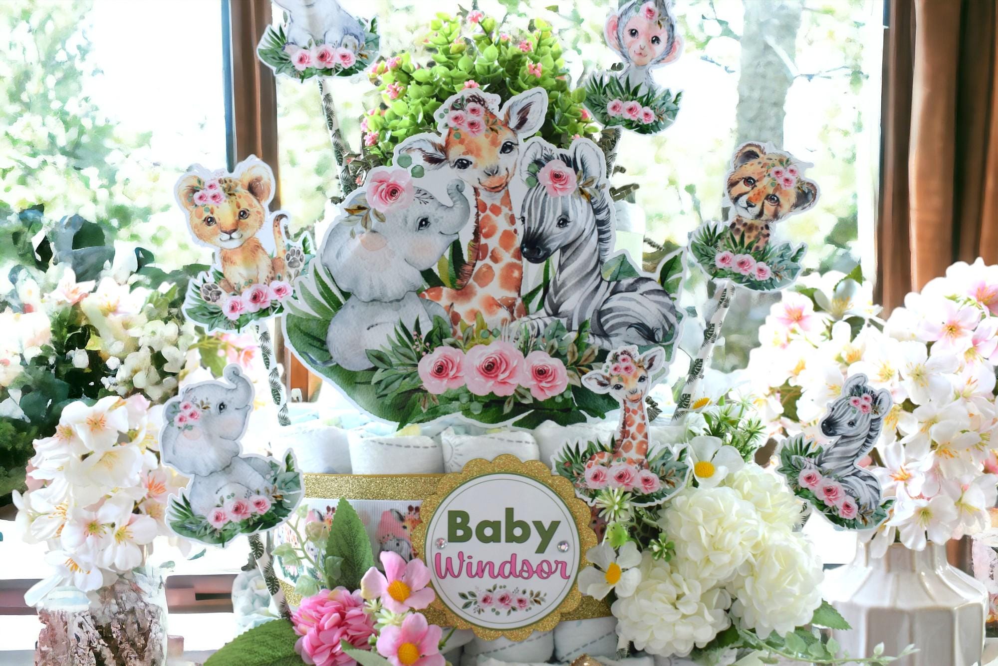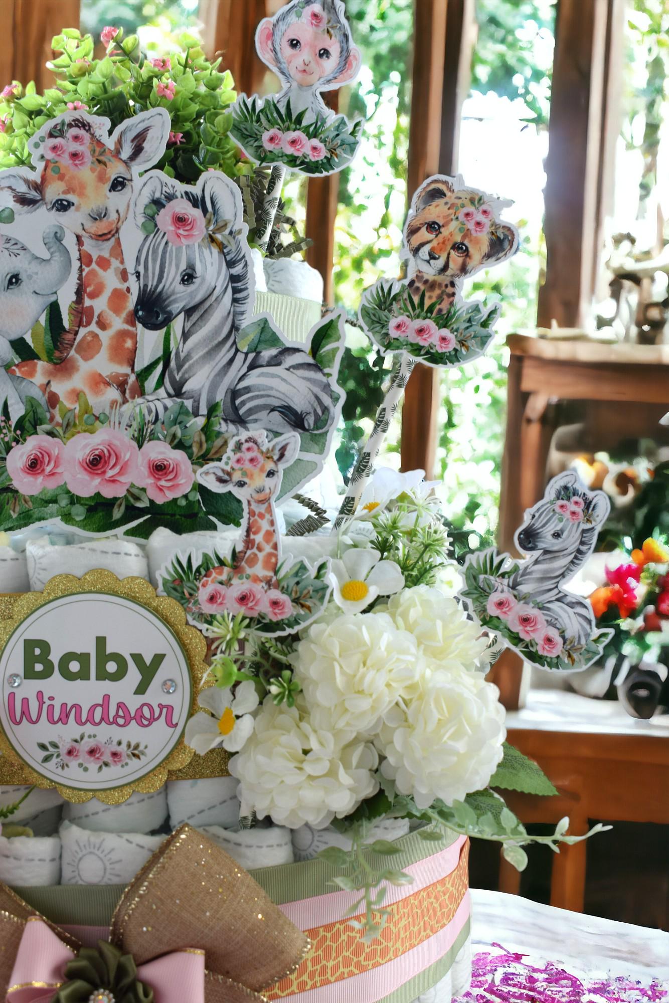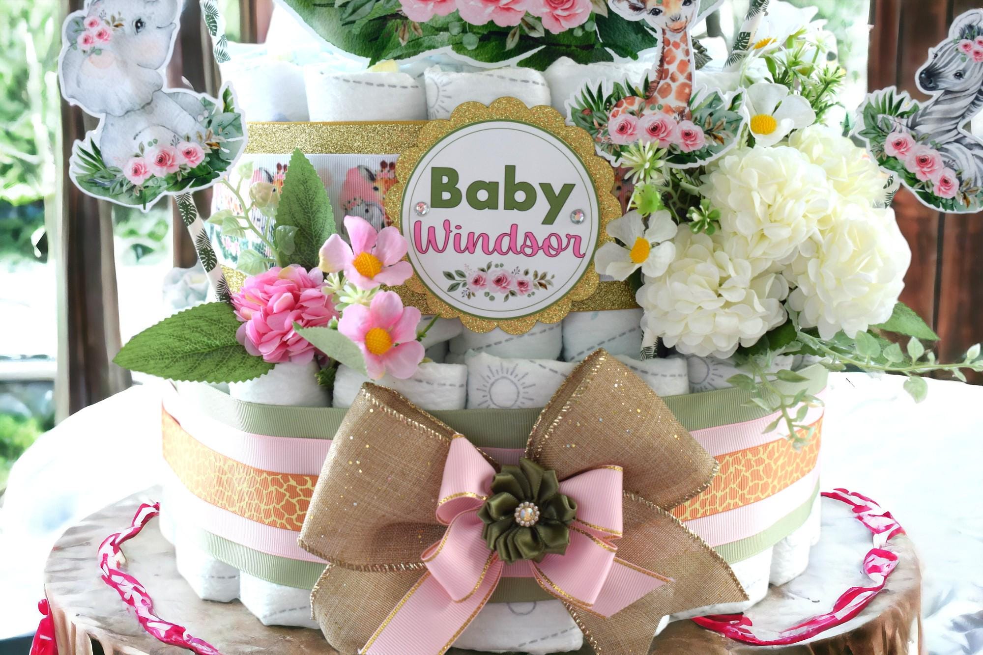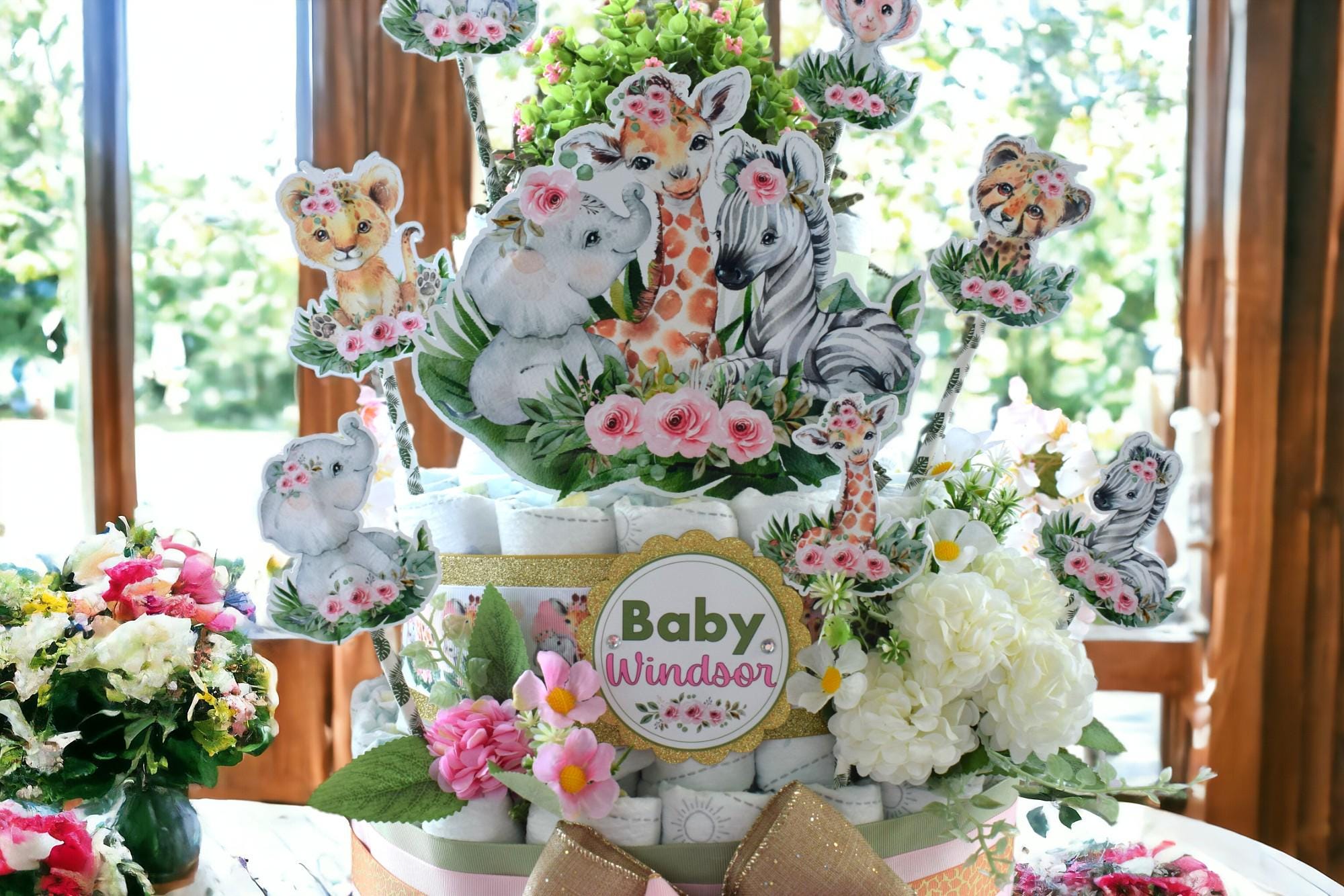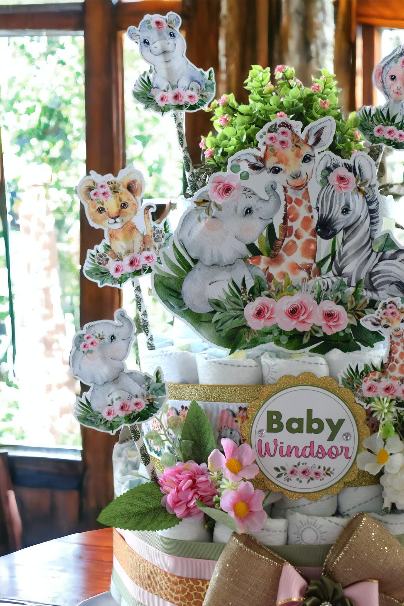 Girl Jungle Safari Mini Diaper Cake Baby Shower, Girl Baby Shower Centerpieces Decorations, Girls Room Nursery Decor, New Mom Gifts - S0002