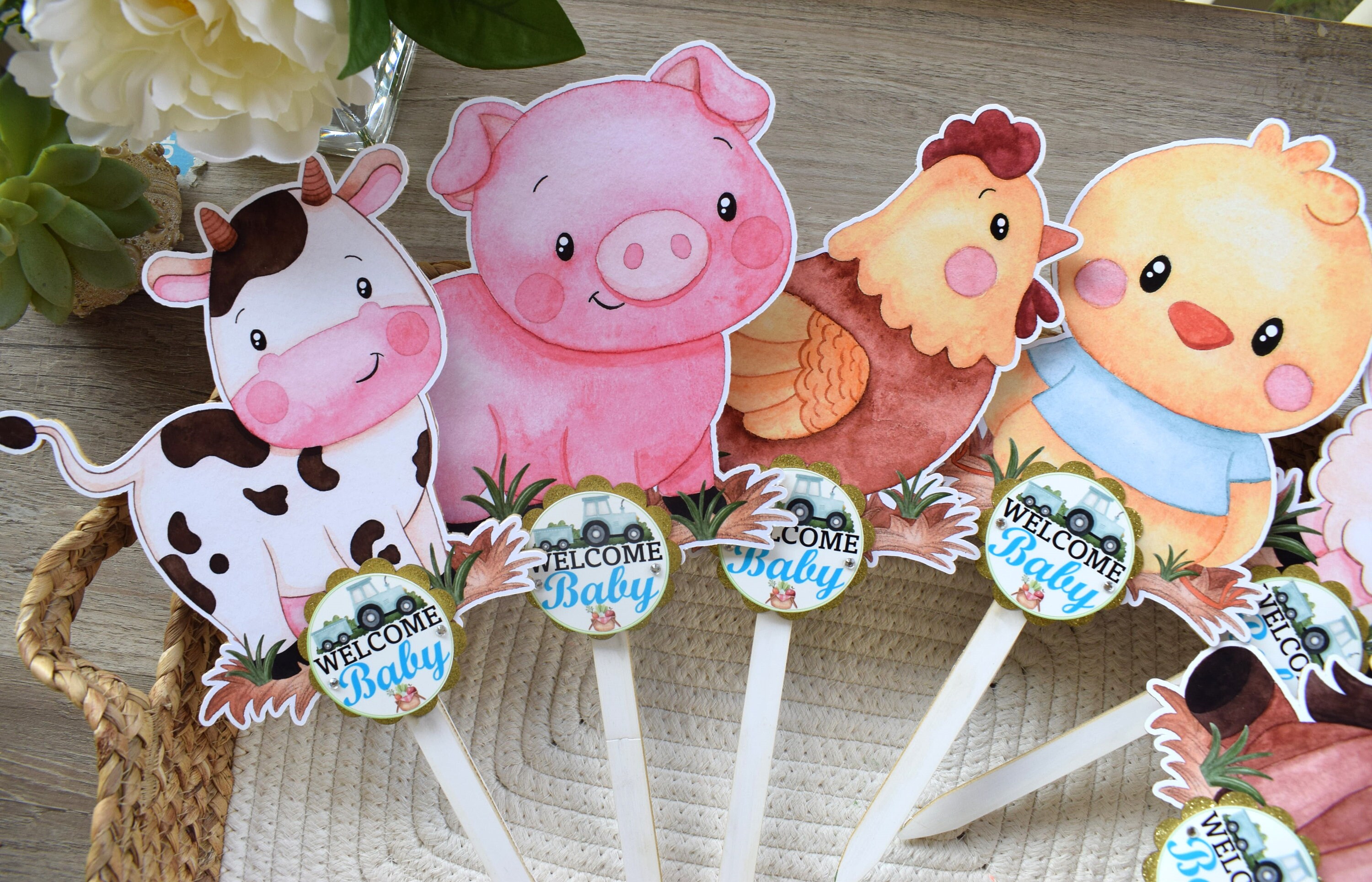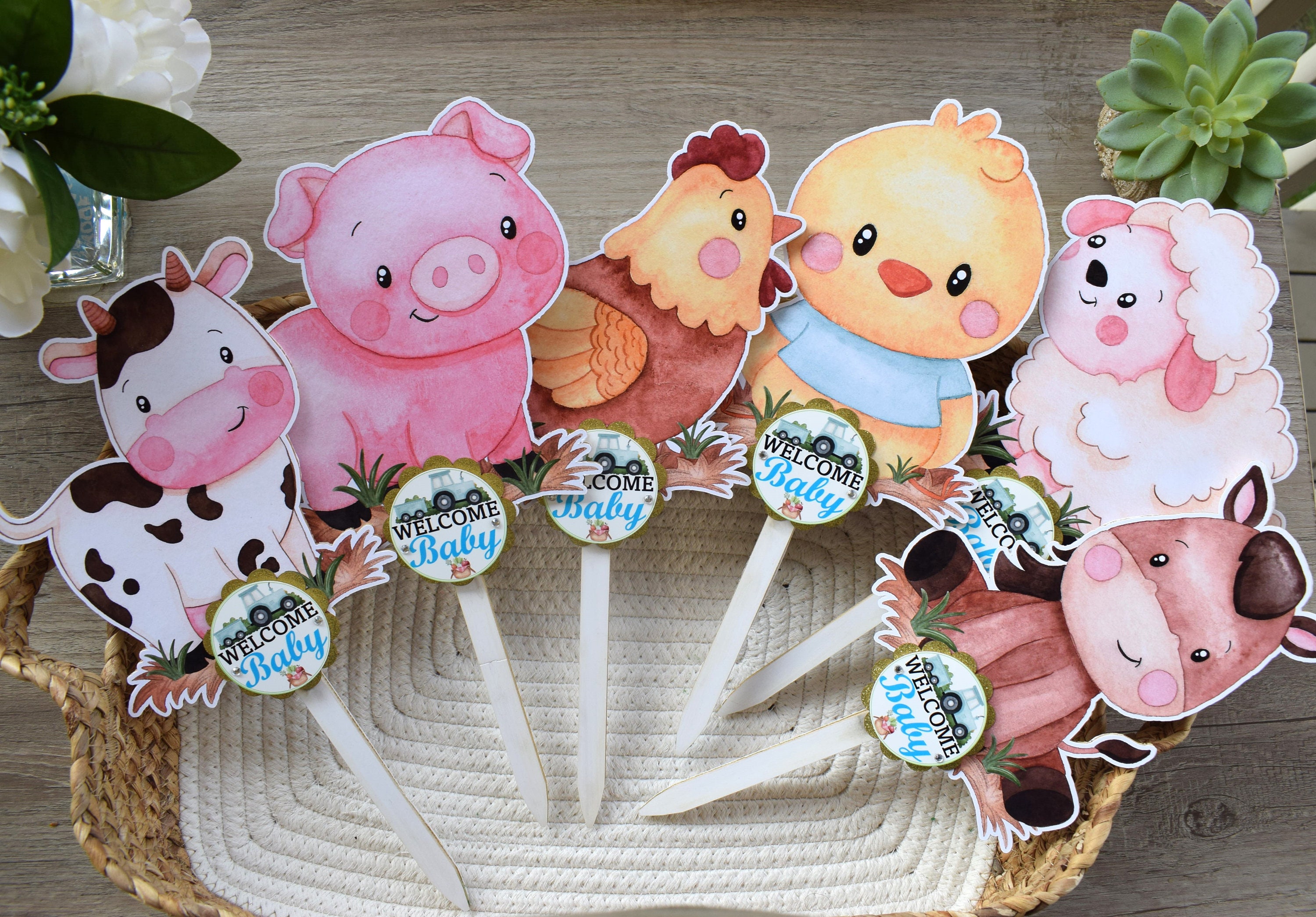 Boy Farm Animal Cake Toppers, Baby Shower Party, Blue Baby Shower Centerpieces Decorations, Room Nursery Decor, New Mom Gifts - S0007