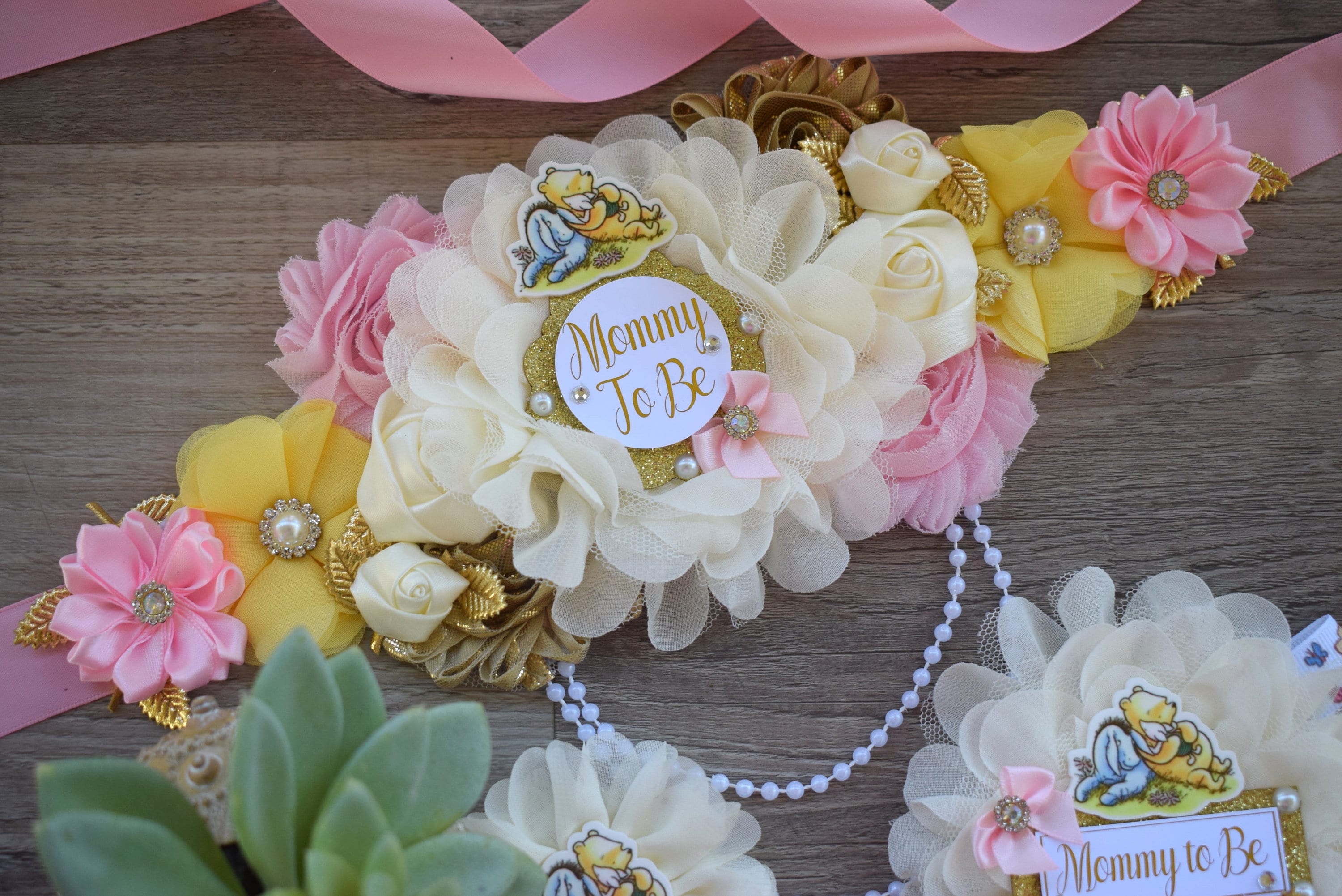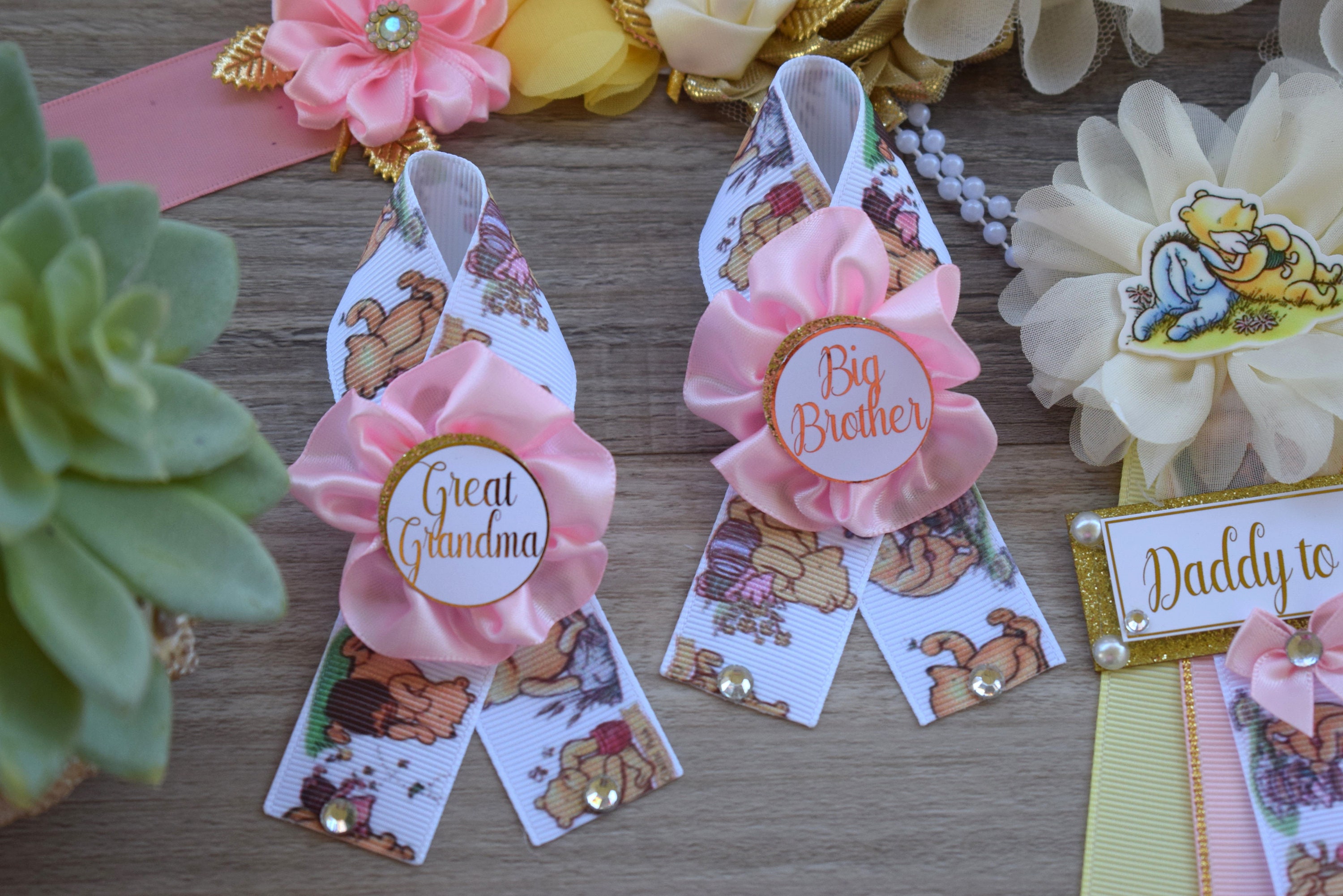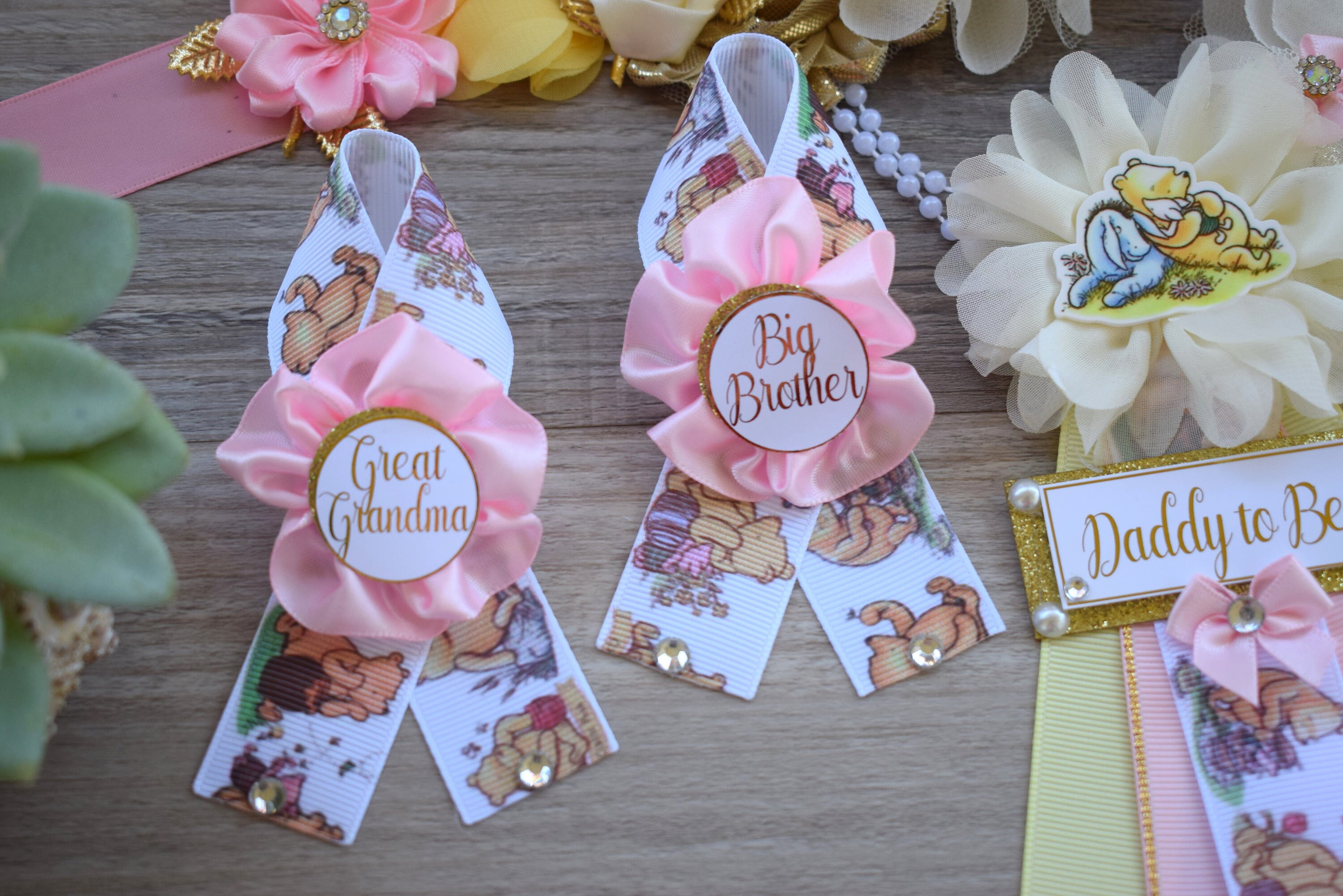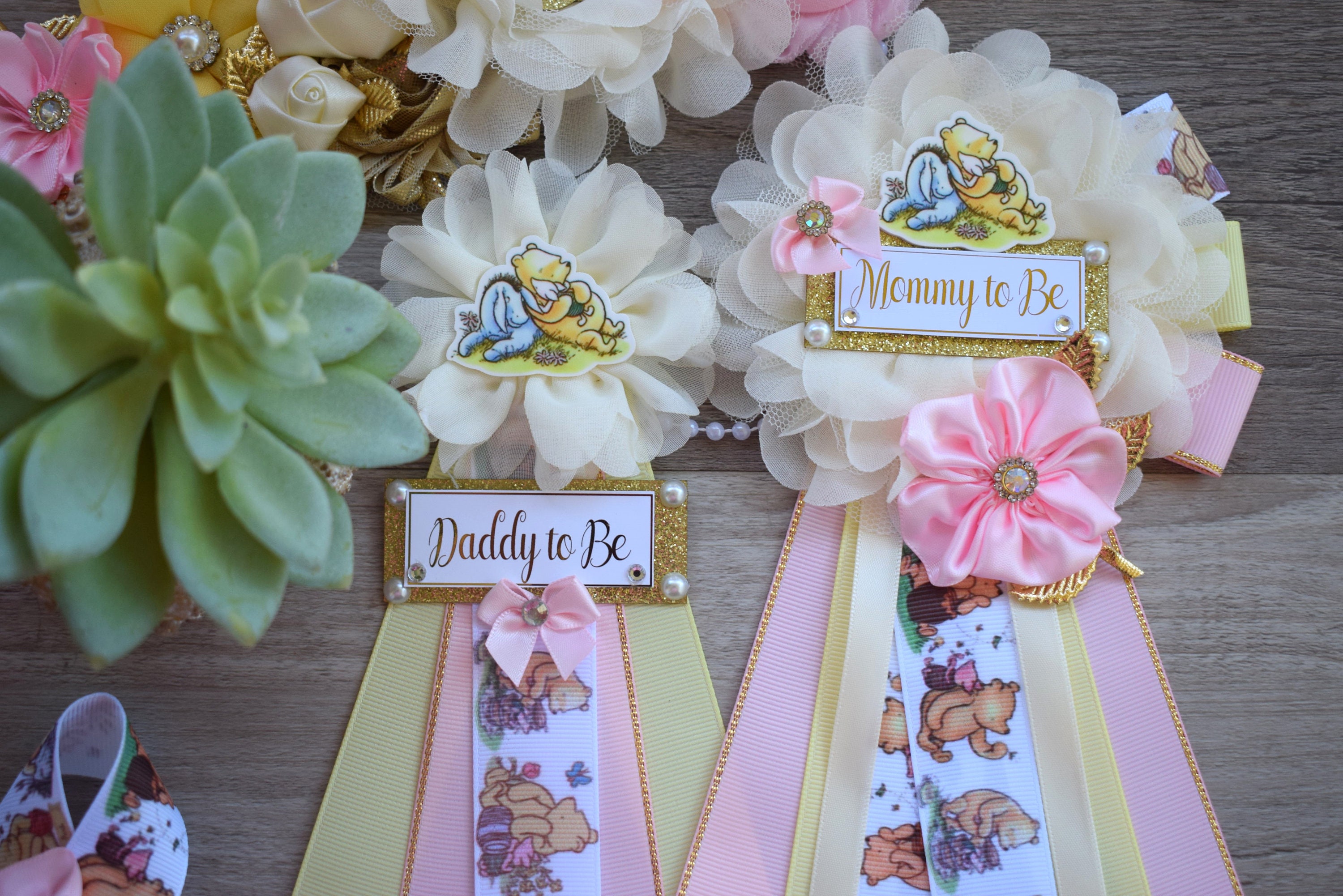 Girl Winnie the Pooh Classic Baby Shower, Pink Yellow Winnie Mommy To Be Pin, Classic Winnie Mommy and Daddy Pin, Custom