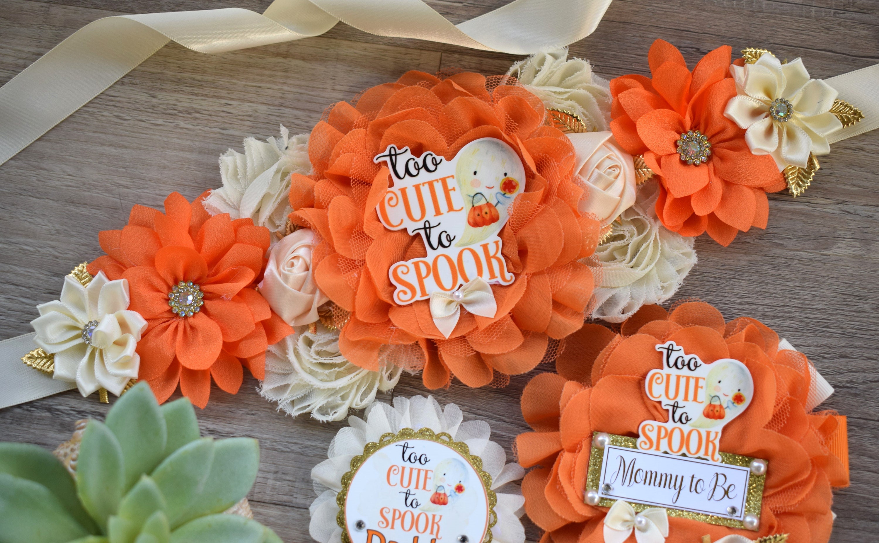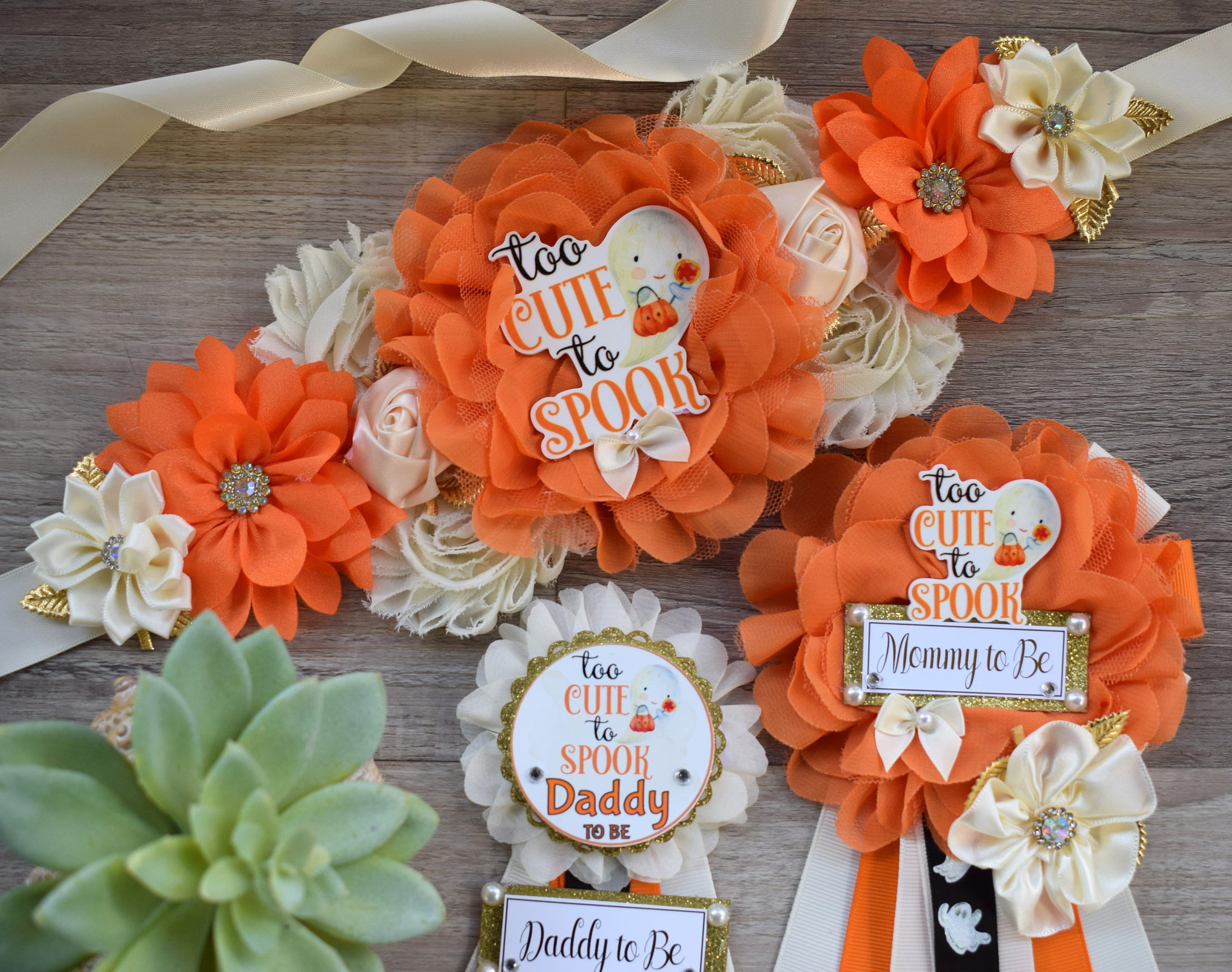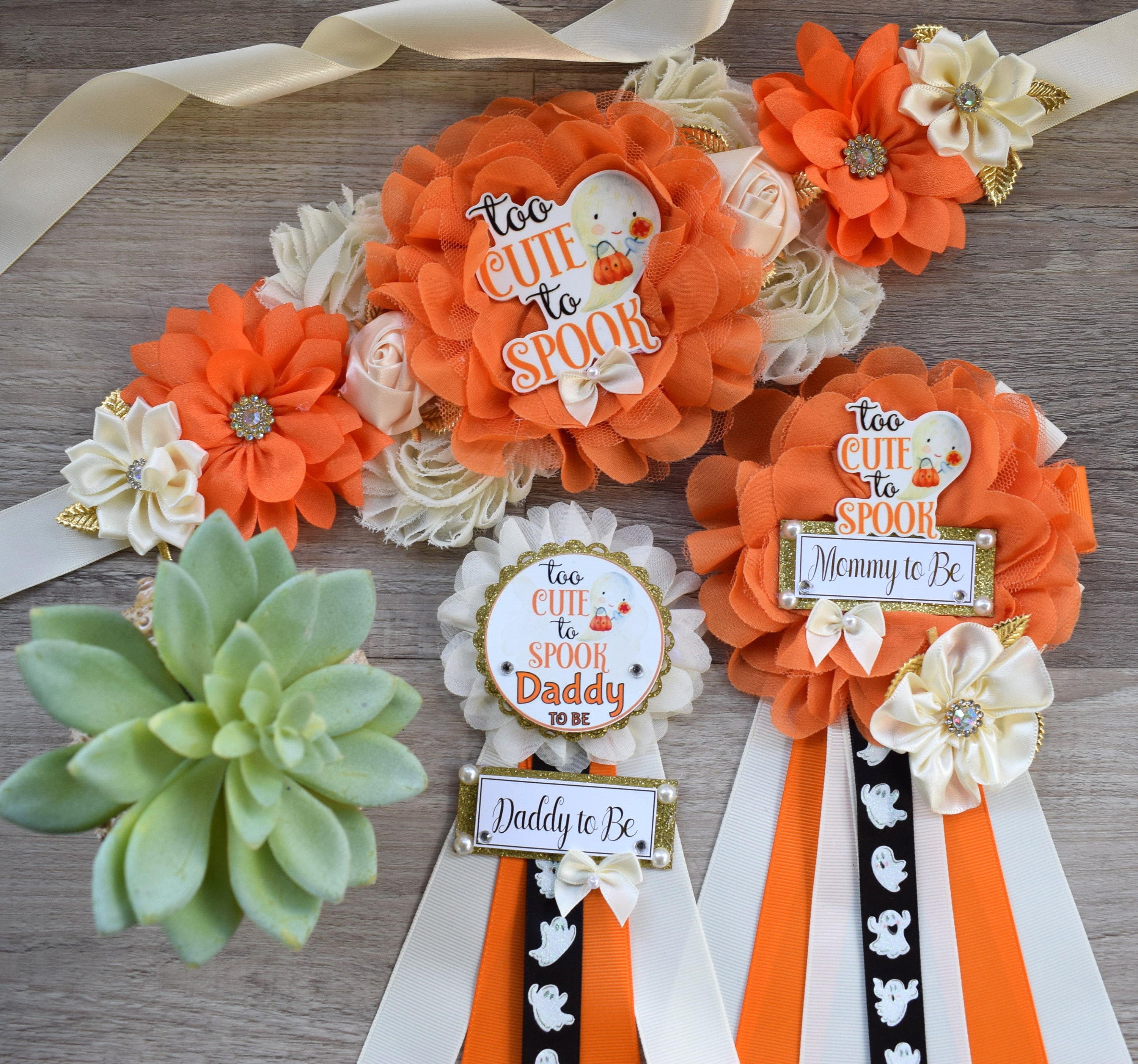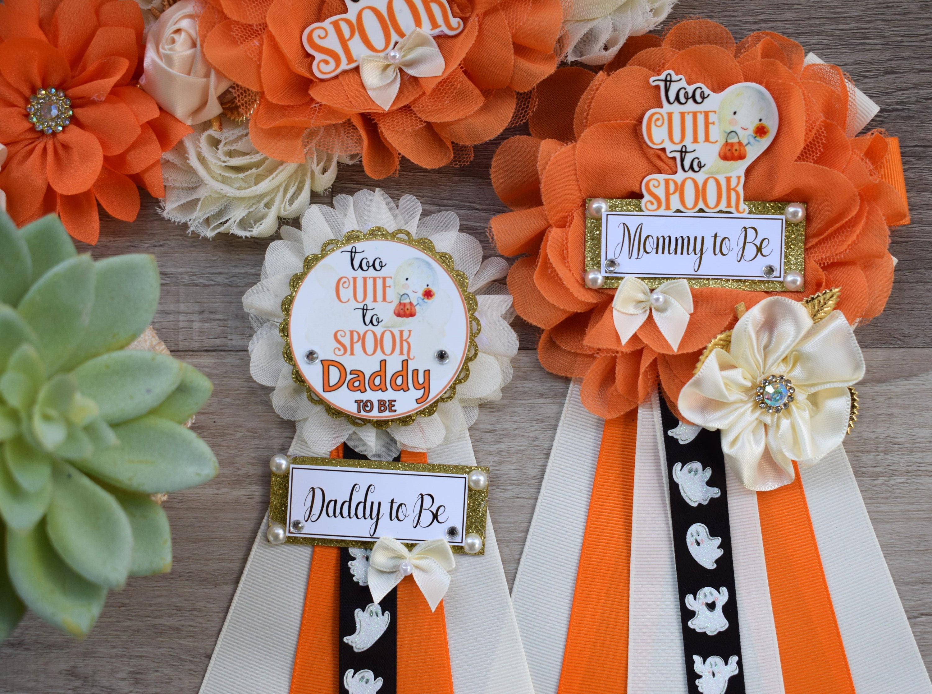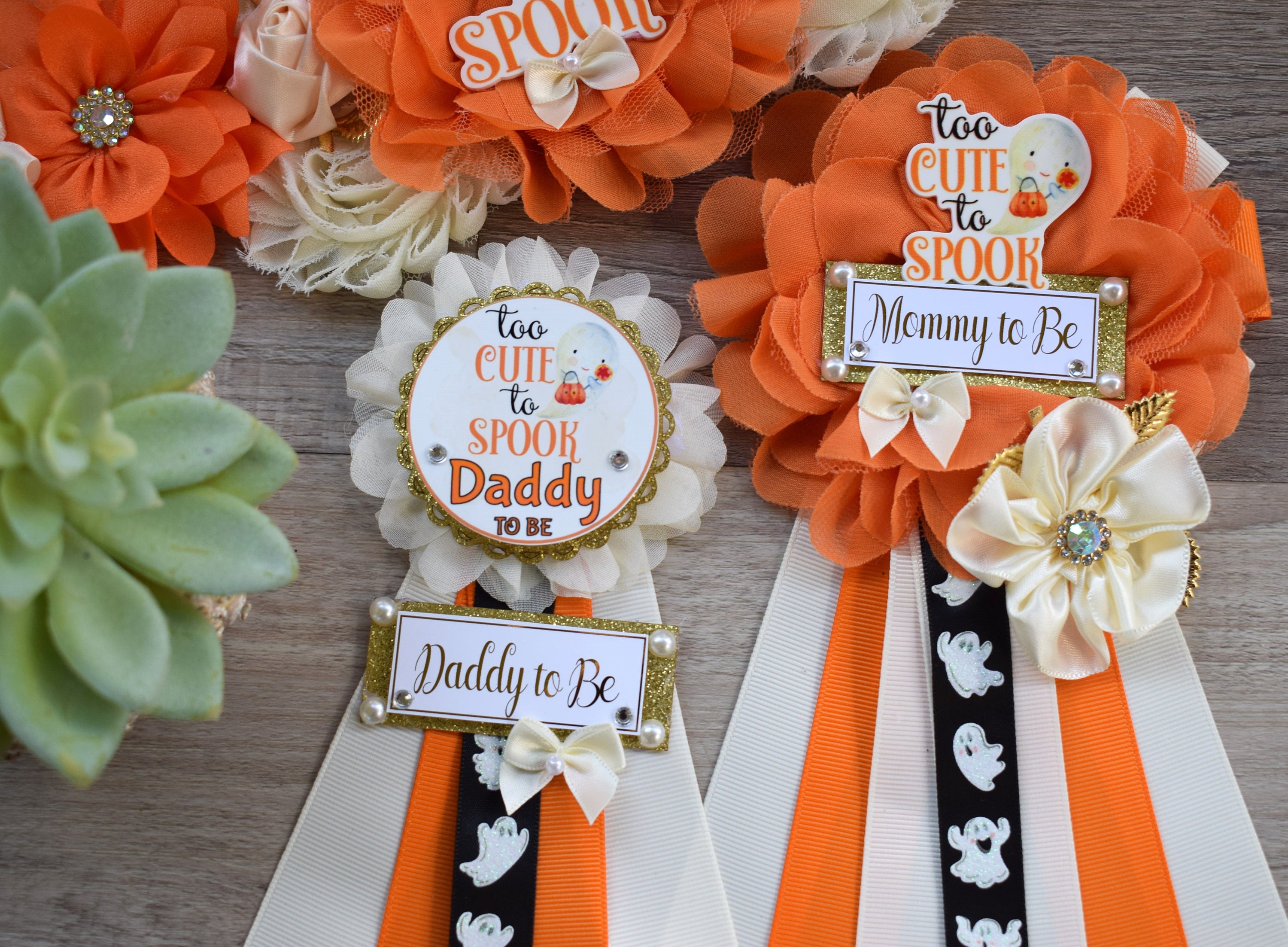 Too Cute to Spook Baby Shower, Ghost Maternity Sash, Neutral Ghost Mommy To Be Ribbon, Daddy To Be Pin, Halloween Baby Shower Gift, Custom