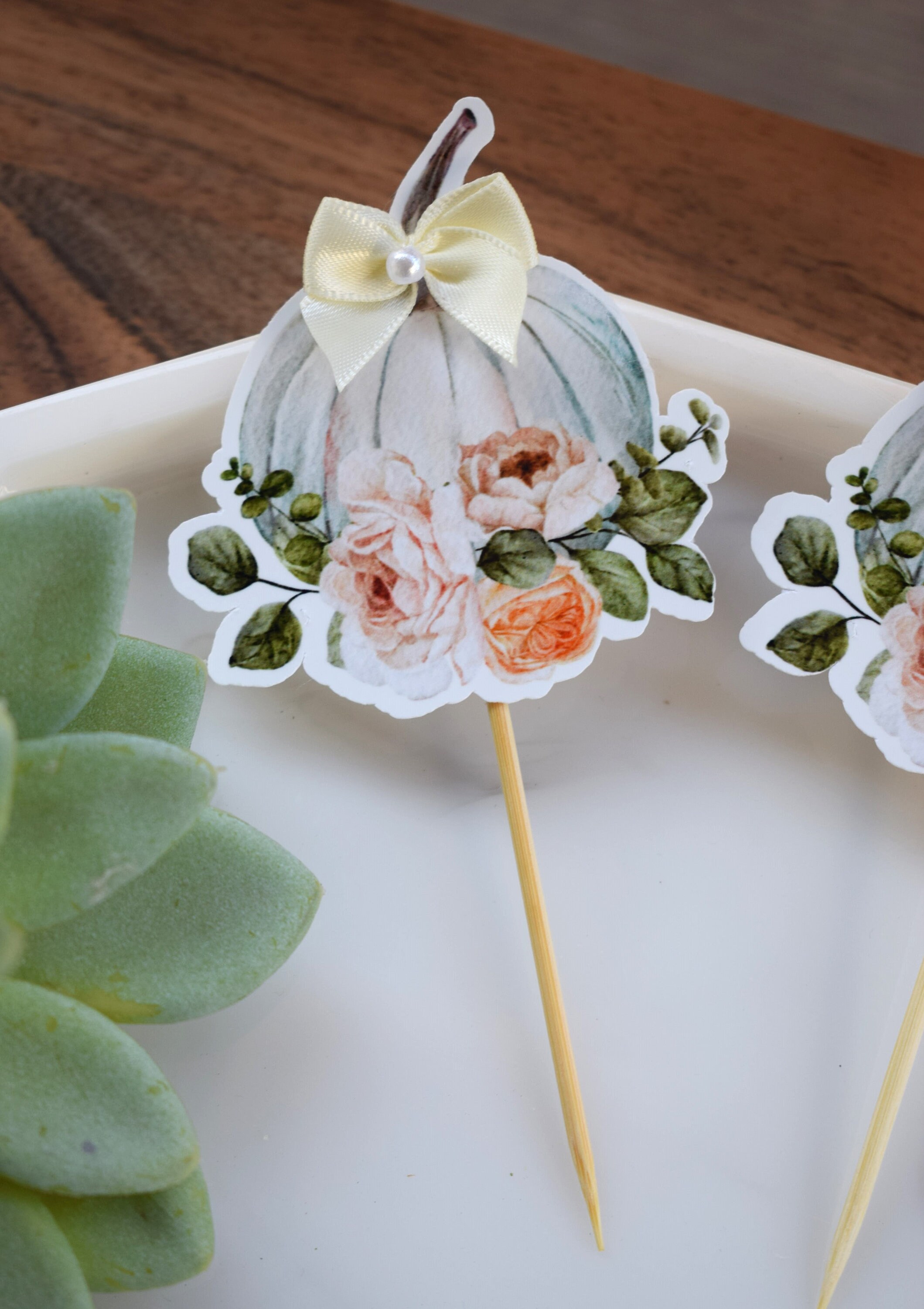 12 Cream & Sage Pumpkin Cupcake Topper, Pumpkin Baby Shower, Ivory White Pumpkin Party, Set of 12