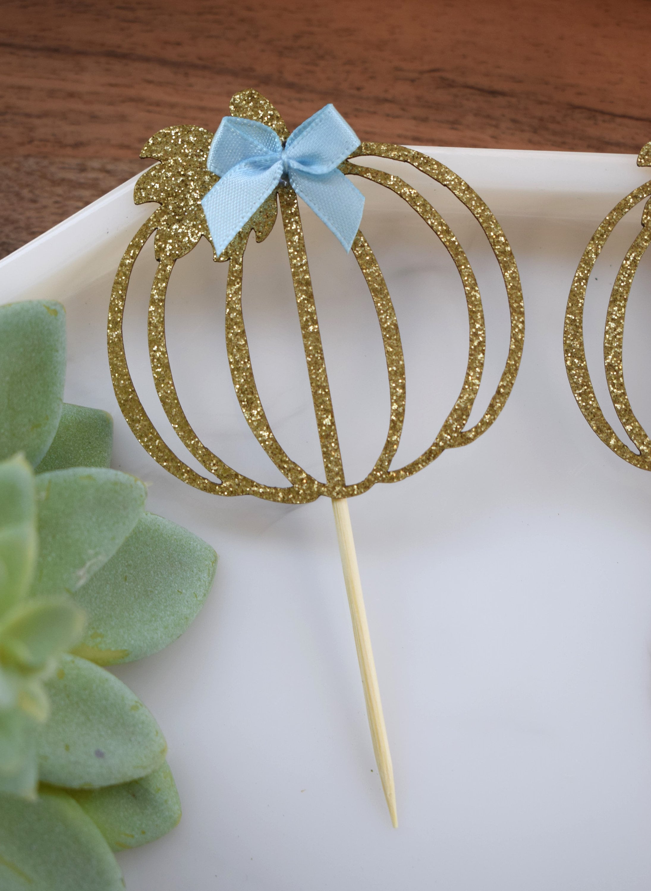 12 Blue Gold Pumpkin Cupcake Topper, Pumpkin Baby Shower, Blue Pumpkin Party, Set of 12