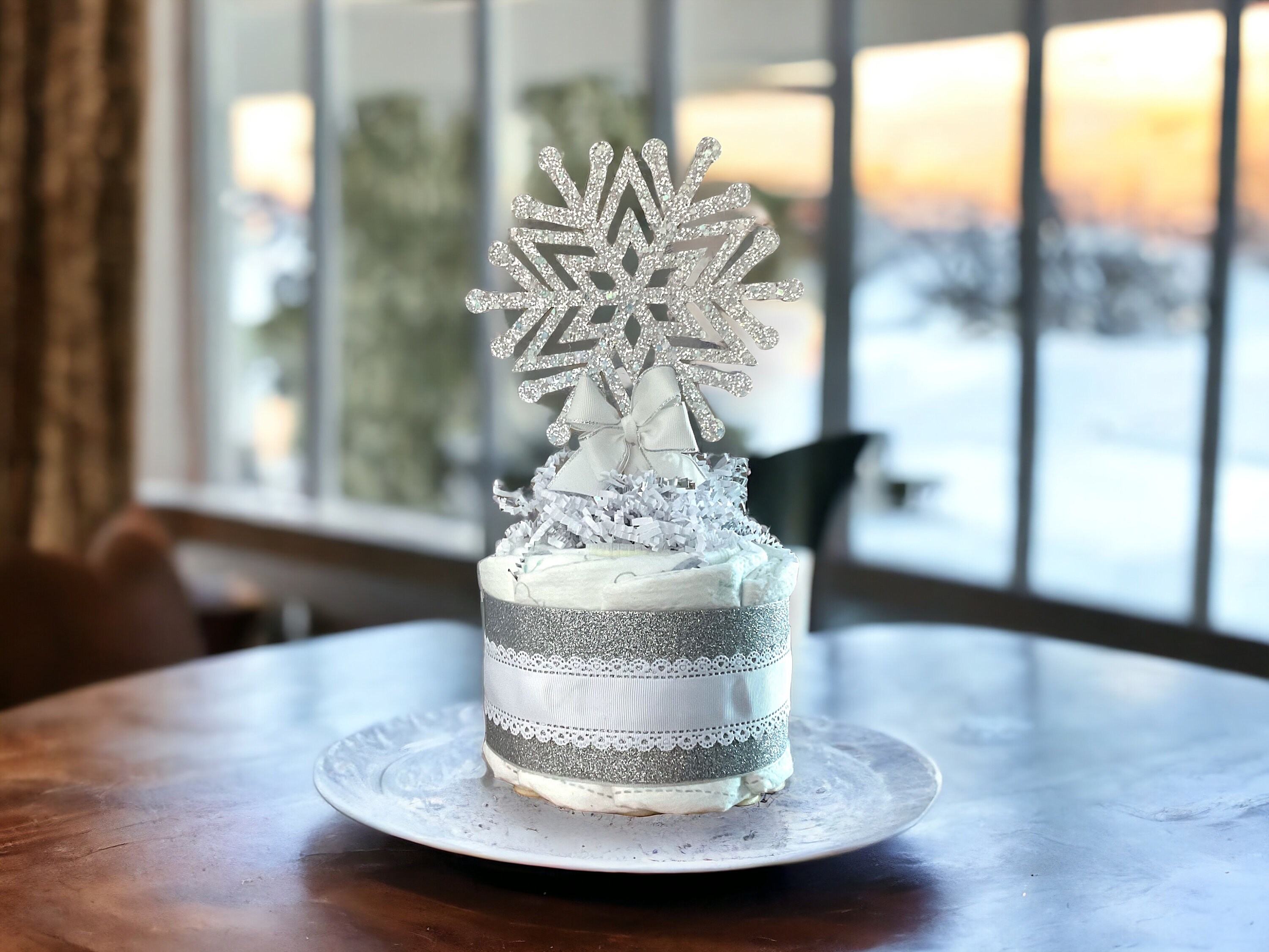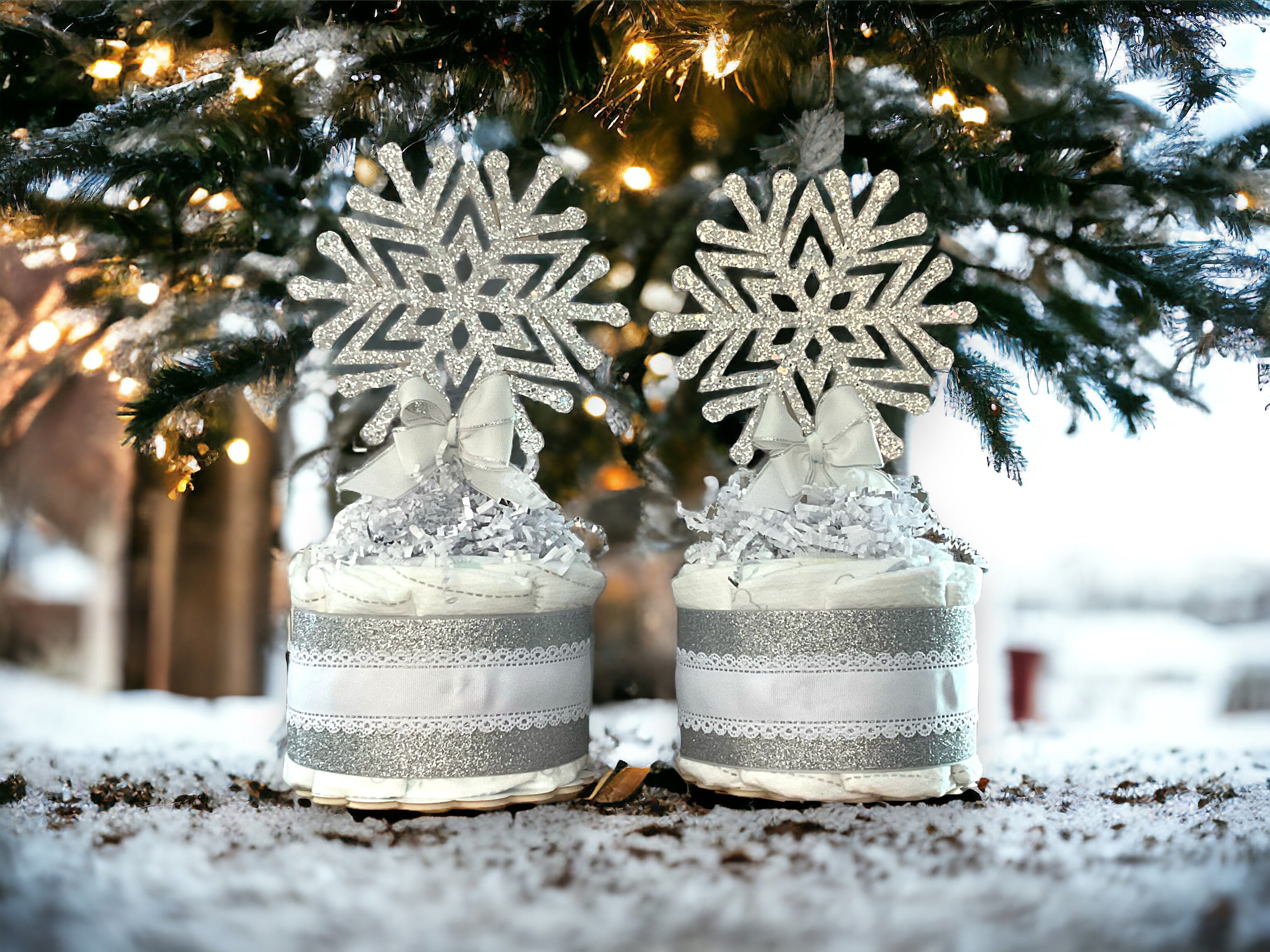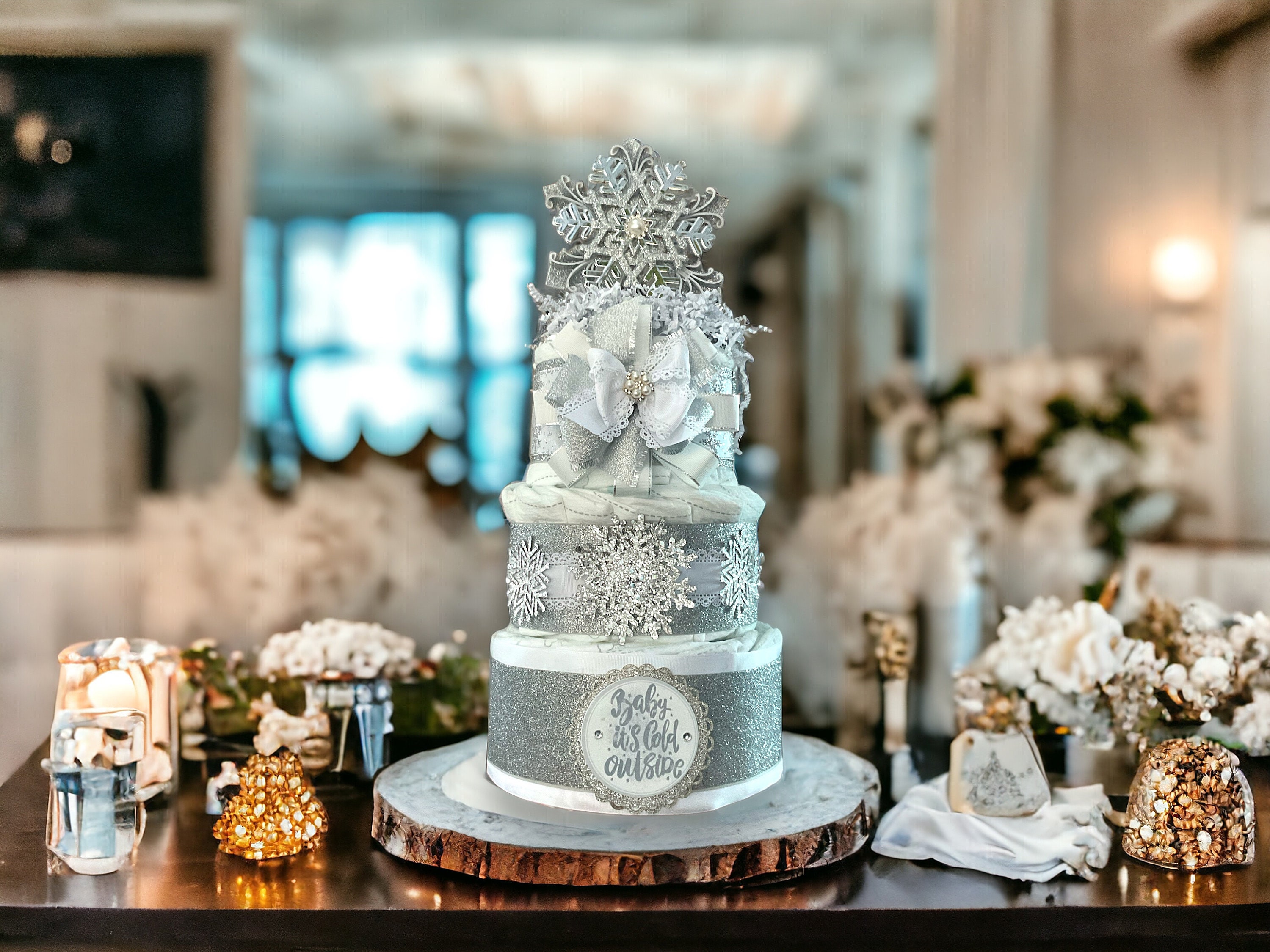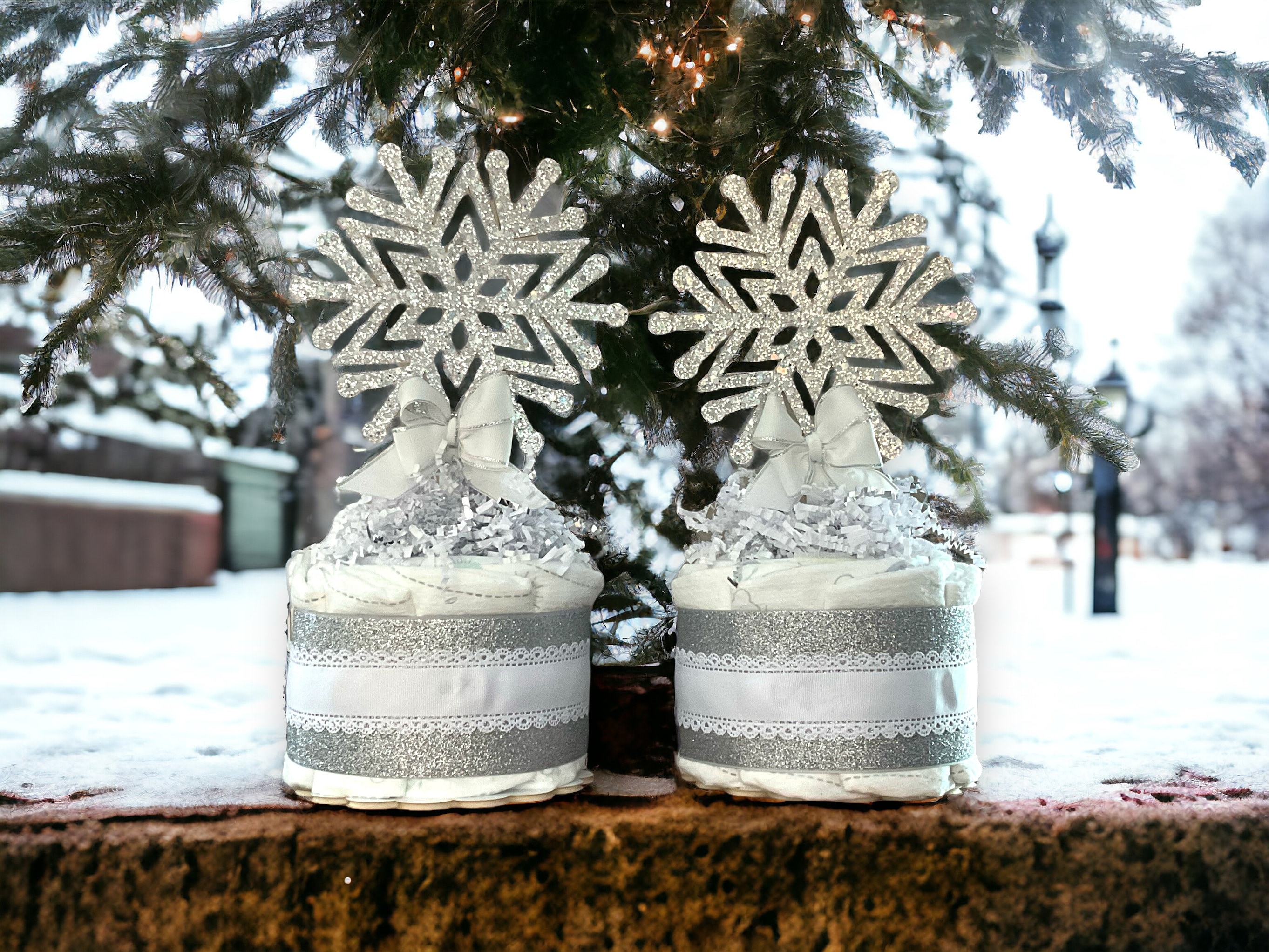 -. This DIAPER CAKE is decorated with snowflakes in silver and white colors.
