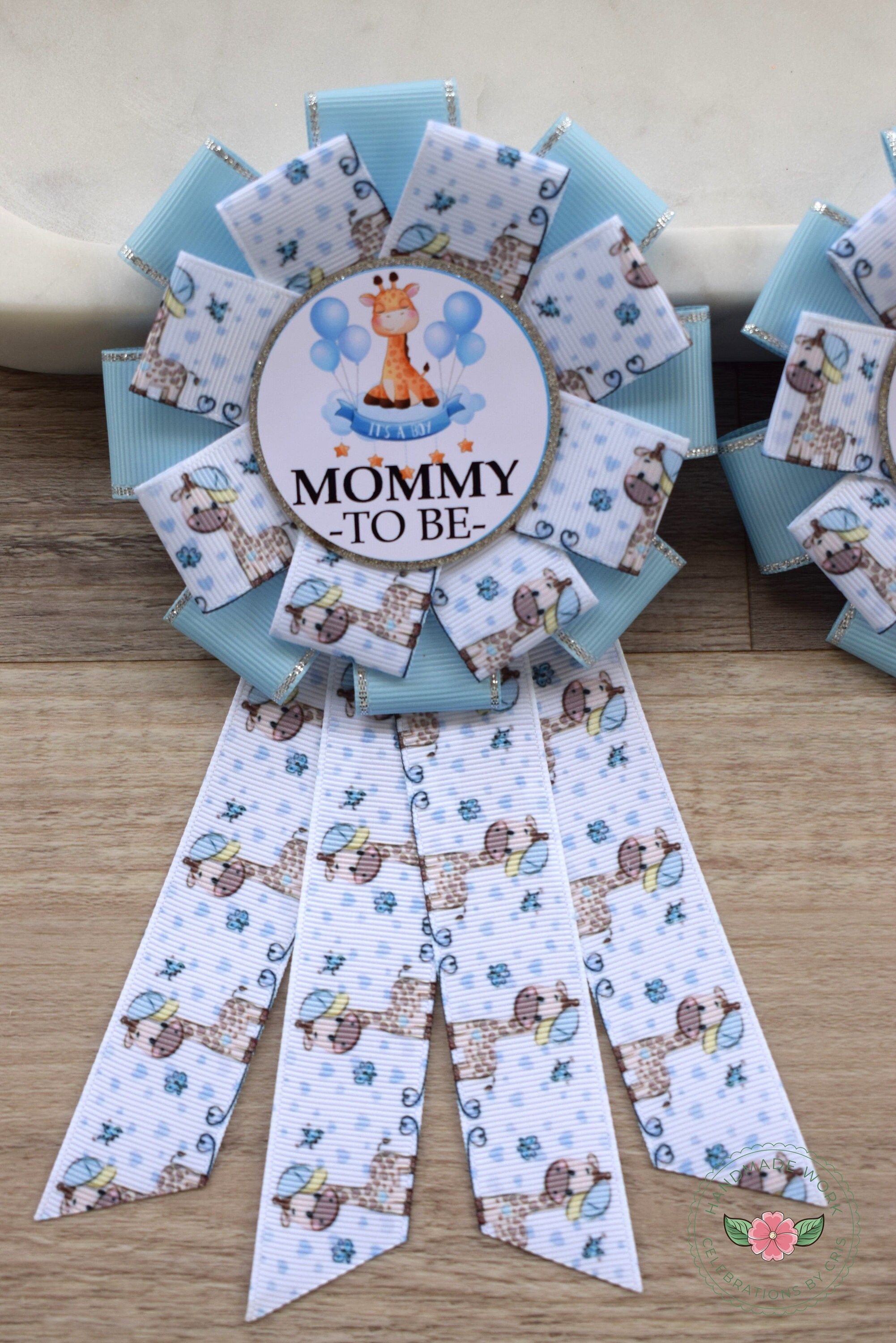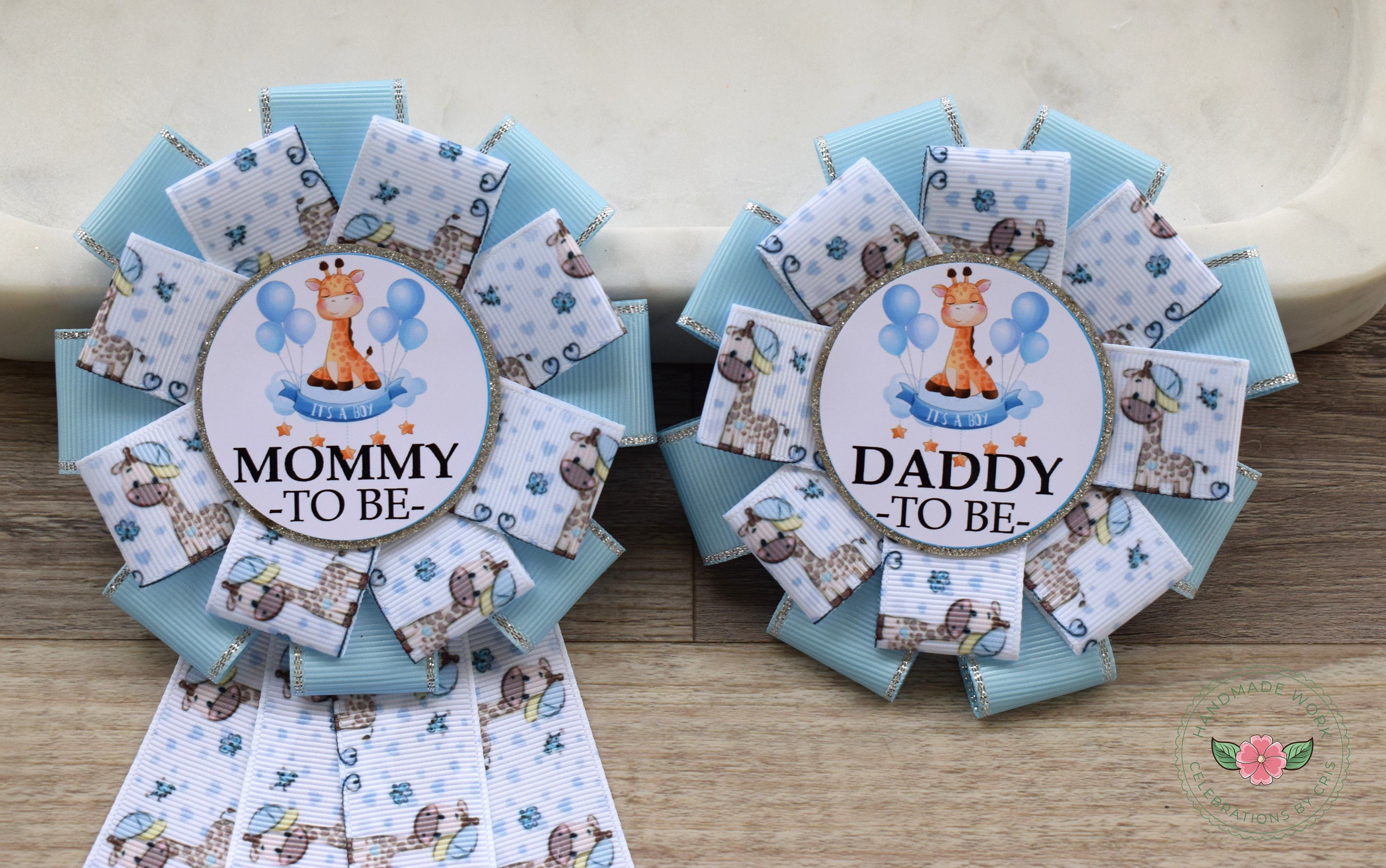 Giraffe Baby Shower, Blue Giraffe Mommy To Be Ribbon Pin, Giraffe Daddy To Be Pin