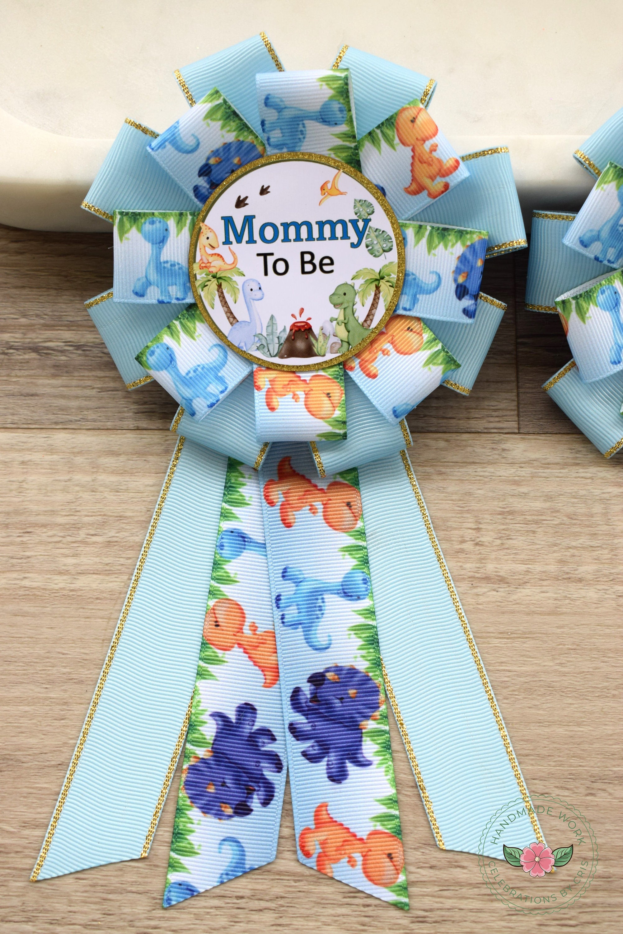 Boy Dinosaur Baby Shower, Blue Dinosaur Corsage Pin, Dinosaur Mommy to Be Ribbon Pin, Dinosaur Daddy to Be Pin