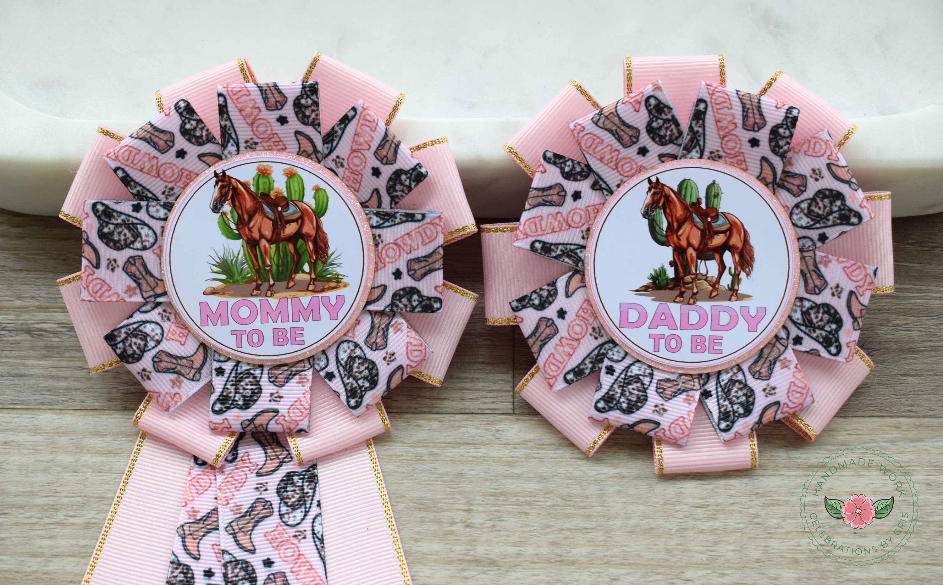 Pink Cowgirl Baby Shower, Girl Cowboy Mommy To Be Ribbon Pin, Daddy To Be Pin, Pink Brown Horse Corsage Pin