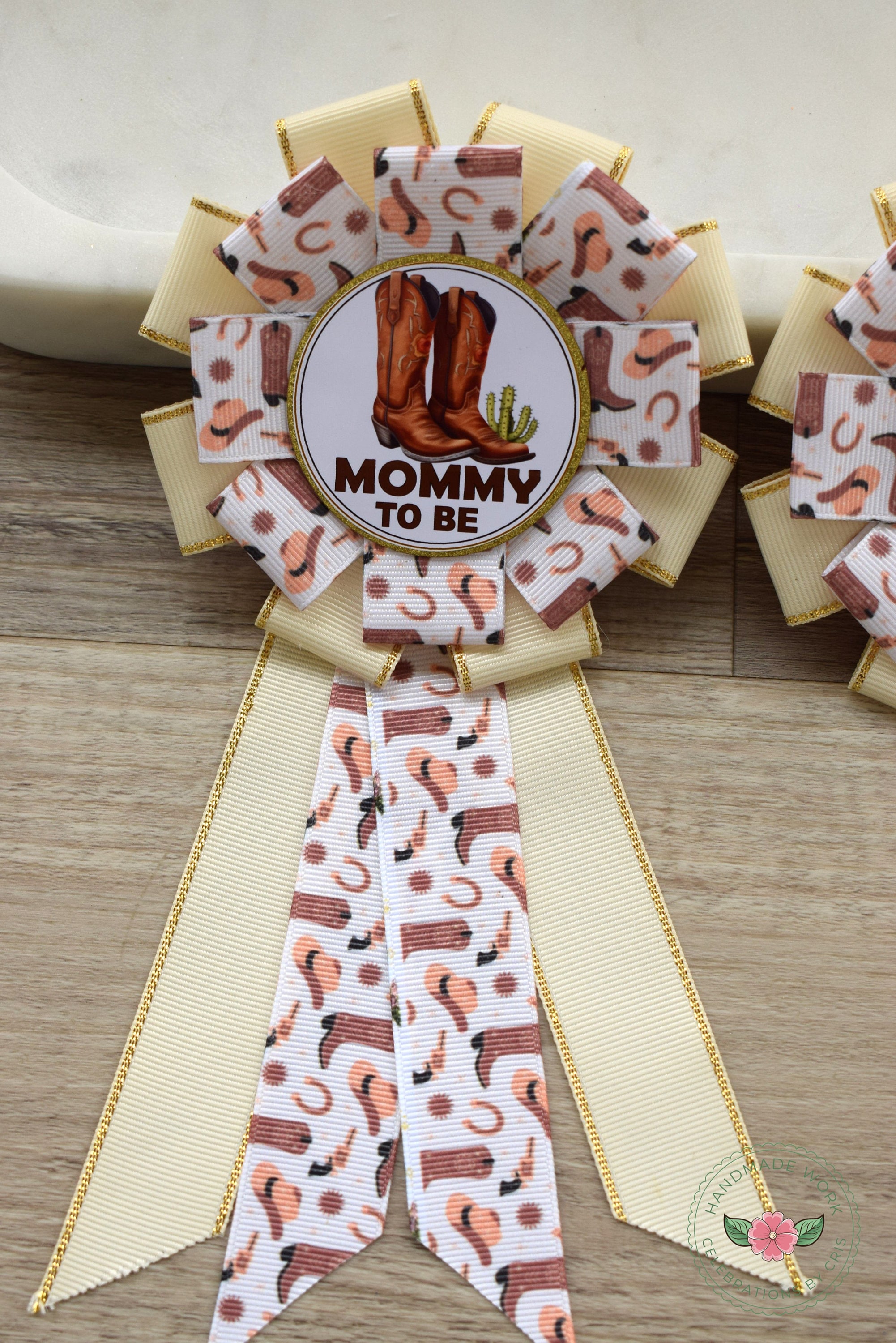 Neutral Cowboy Baby Shower, Cowboy Mommy To Be Ribbon Pin, Daddy To Be Pin, Brown Horse and Boots Corsage Pin