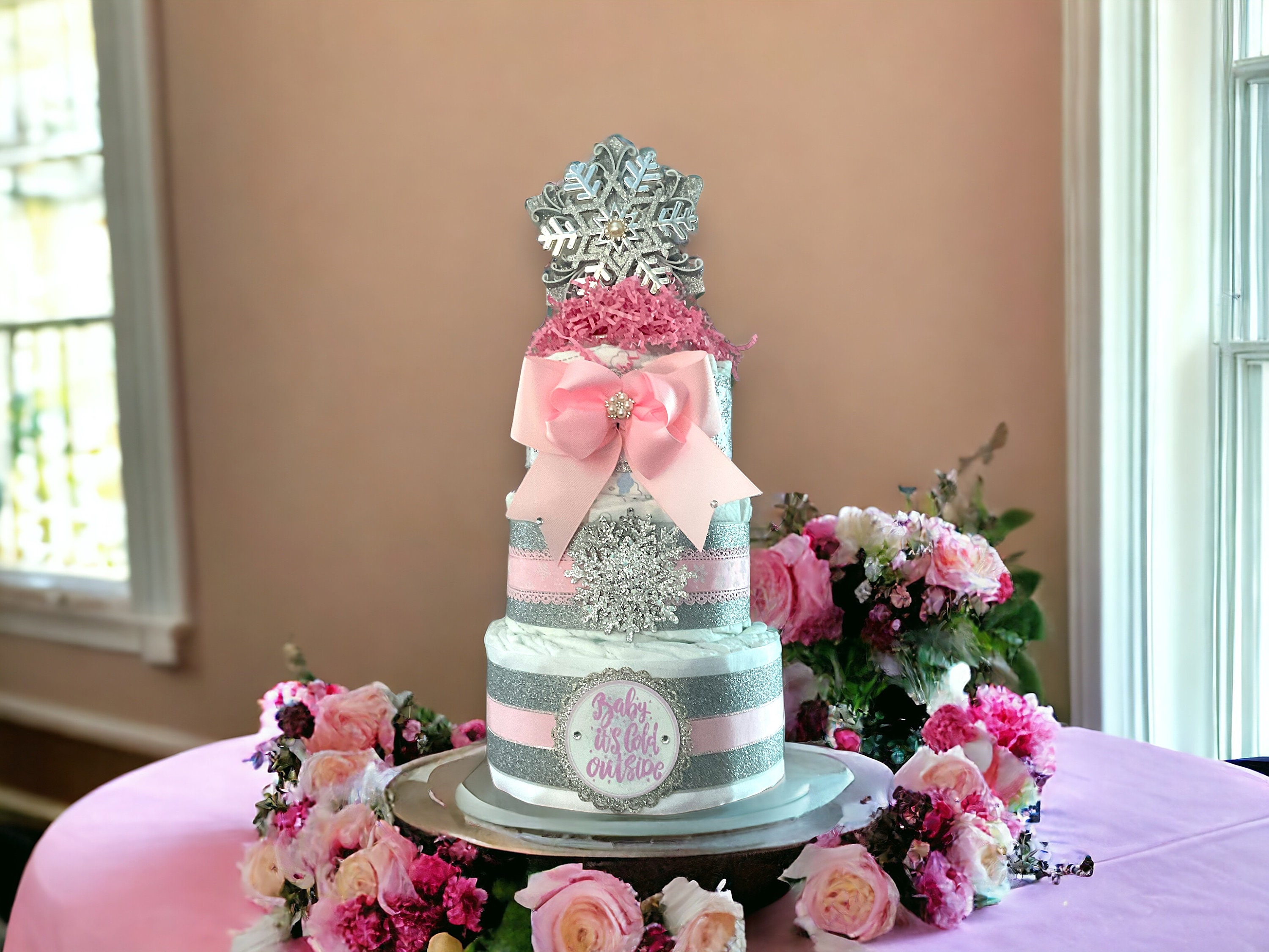 Girl Snowflake Baby Shower, White Pink Silver Diaper Cake, Baby Shower Centerpieces Decorations, Room Nursery Decor, New Mom Gifts - S00011