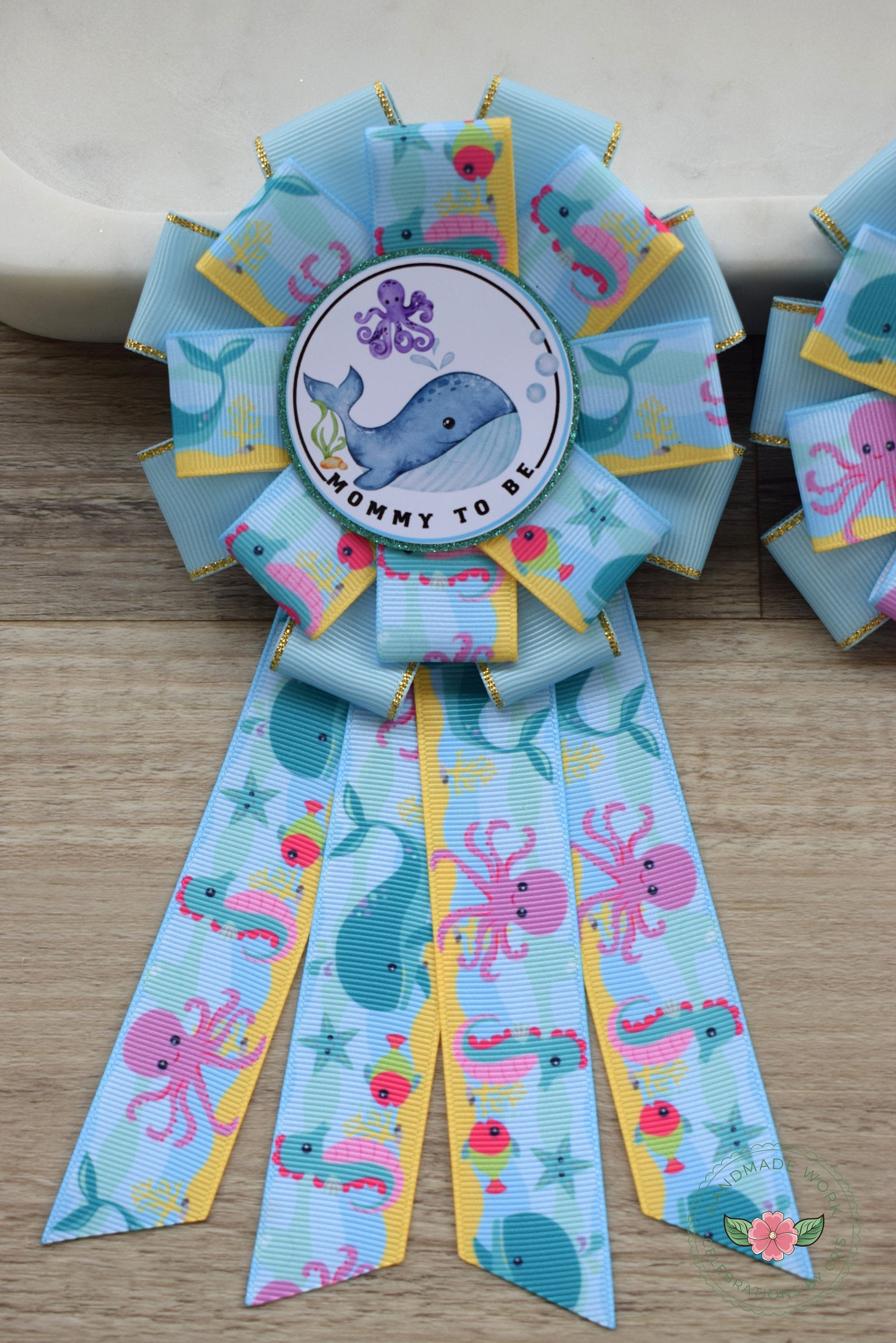Under The Sea Baby Shower, Turtle Octopus Starfish Aqua Blue Mommy To Be Ribbon Pin, Under The Sea Daddy To Be Badge