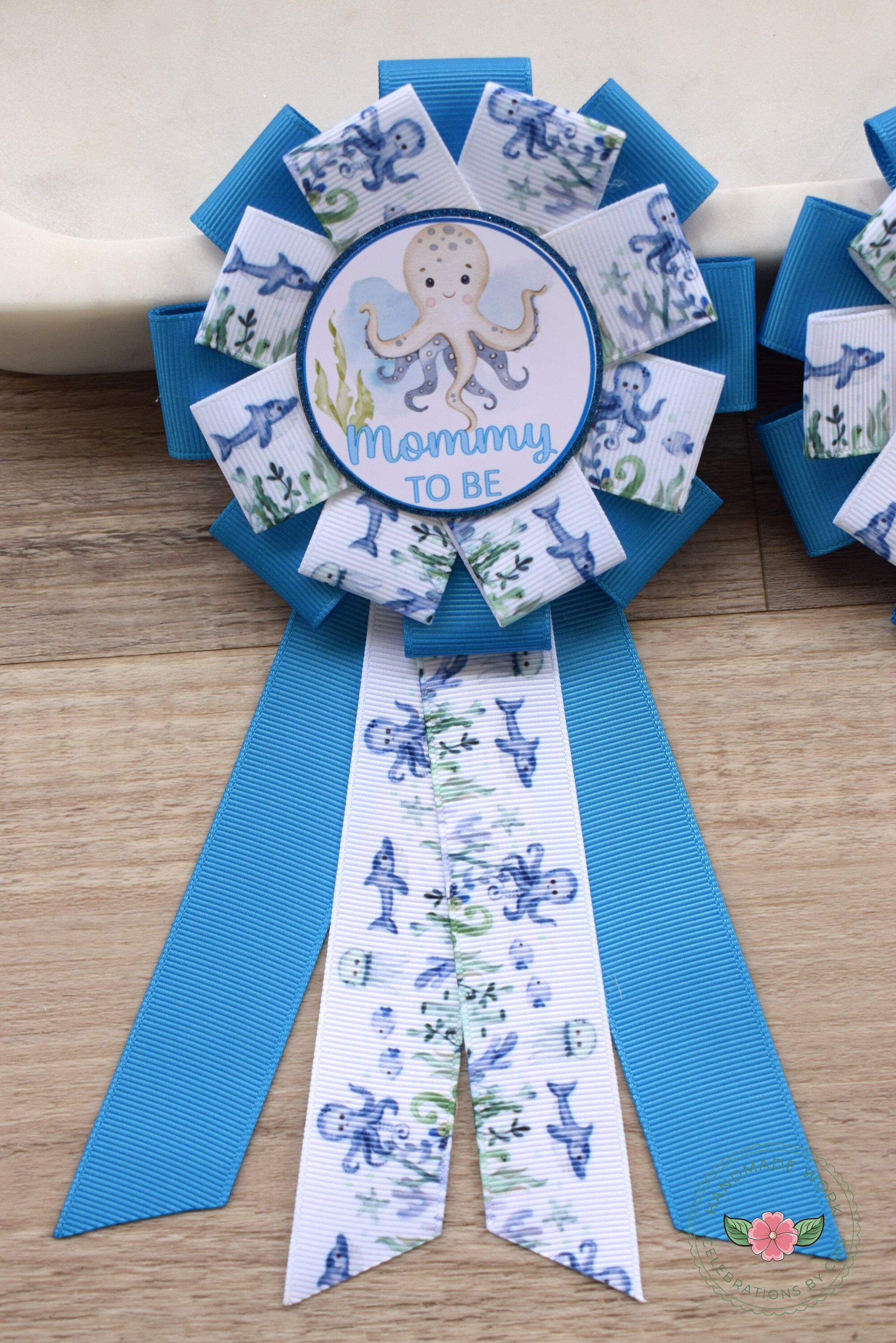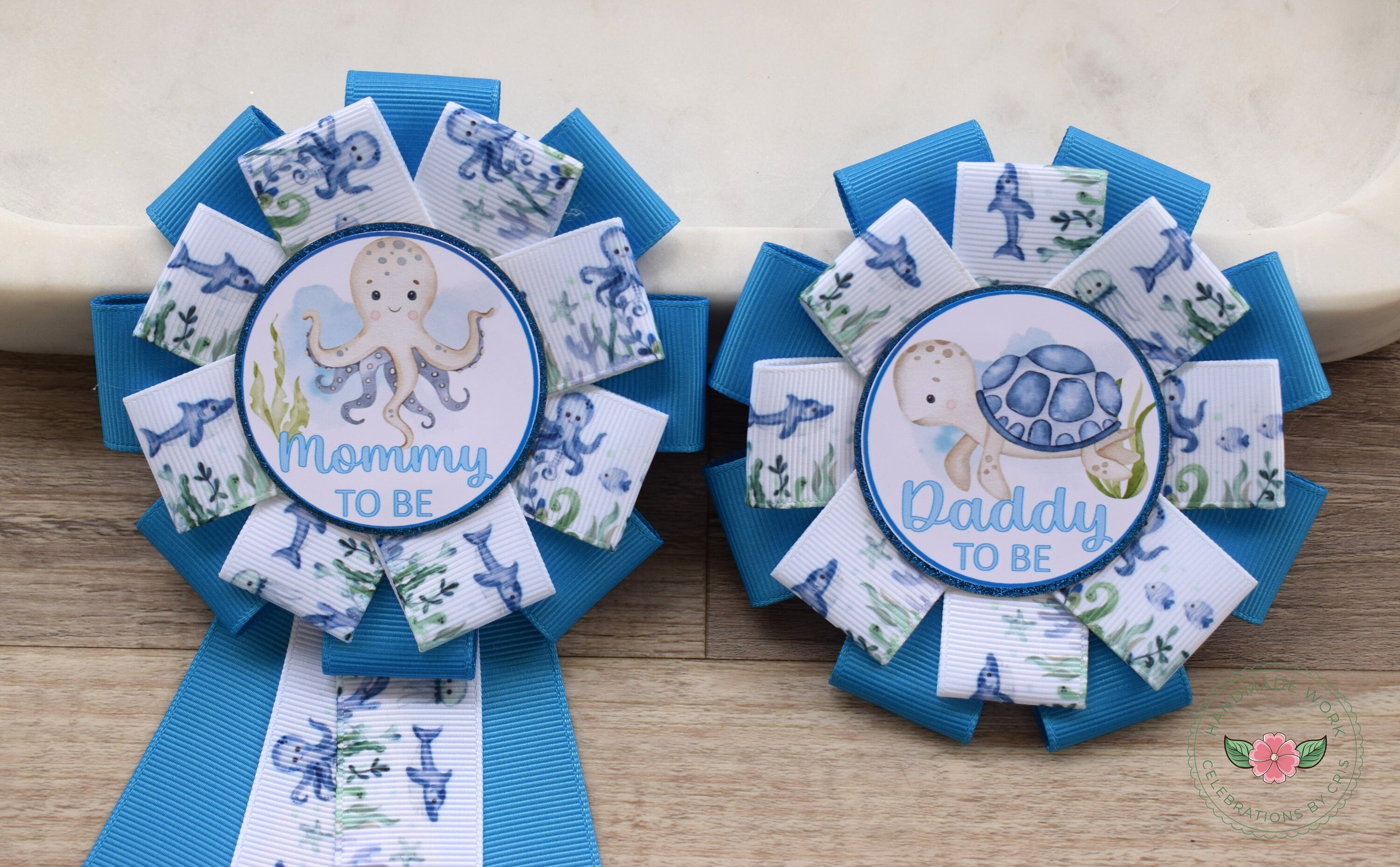 Turtle Octopus Baby Shower, Under The Sea Turtle Octopus Starfish Aqua Blue Mommy To Be Ribbon Pin, Under The Sea Daddy To Be Badge