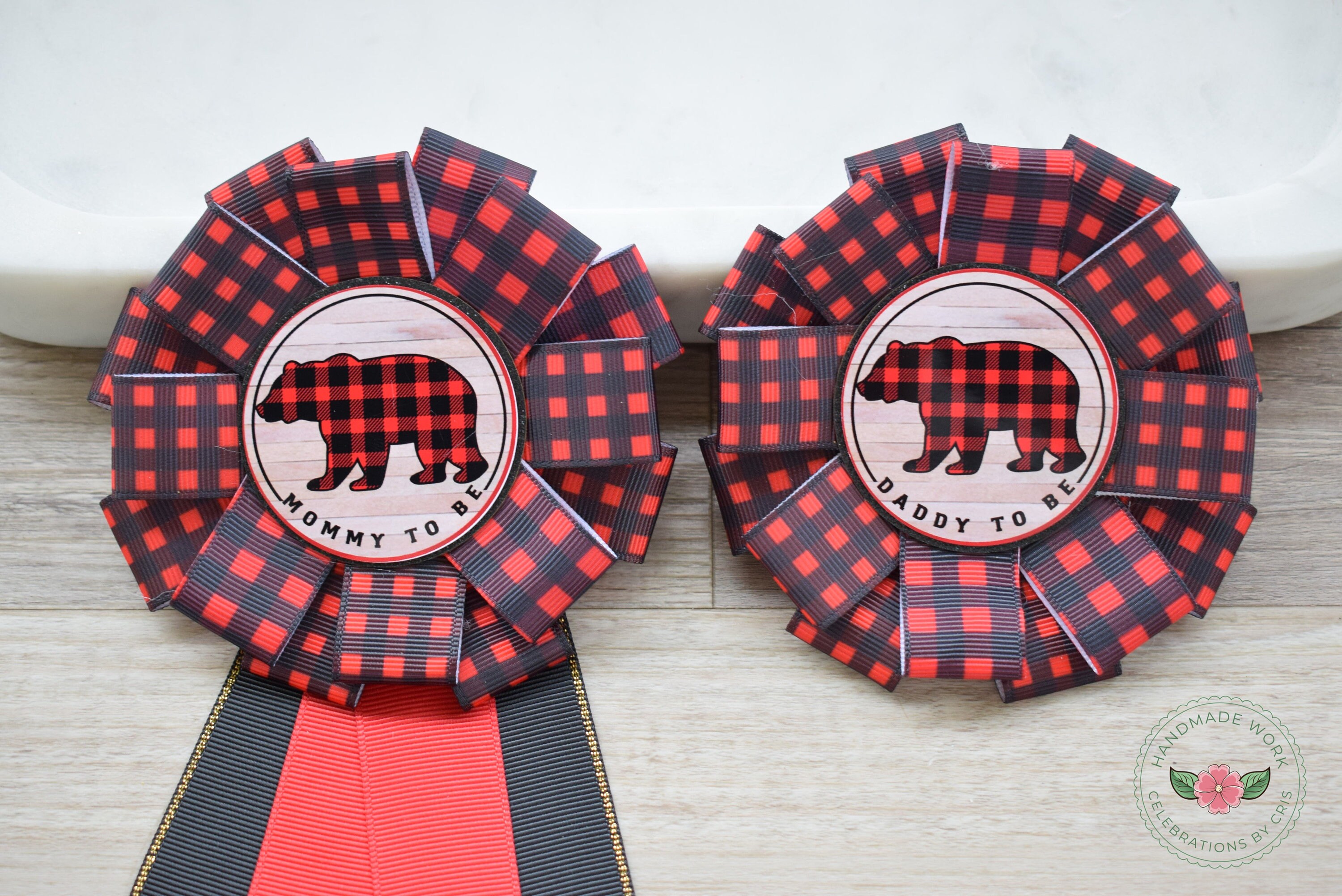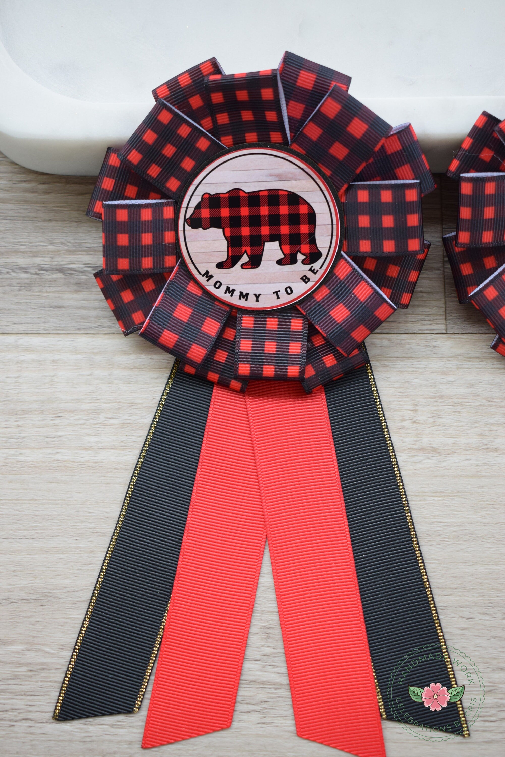 Mama Bear Corsage Pin, Buffalo Plaid Mommy Bear Baby Shower, Papa Bear Pin, Lumberjack Mommy Daddy To Be Corsage, Red Black Buffalo Plaid