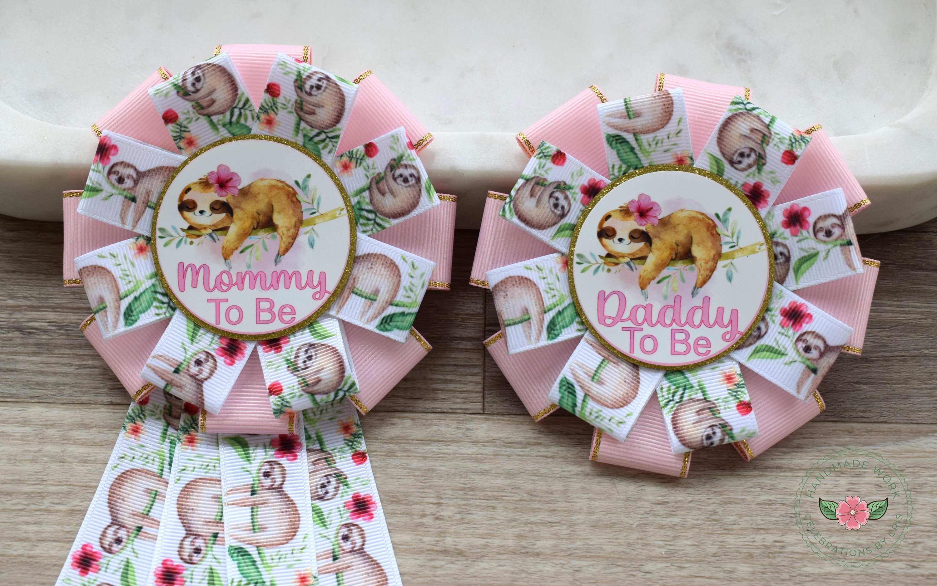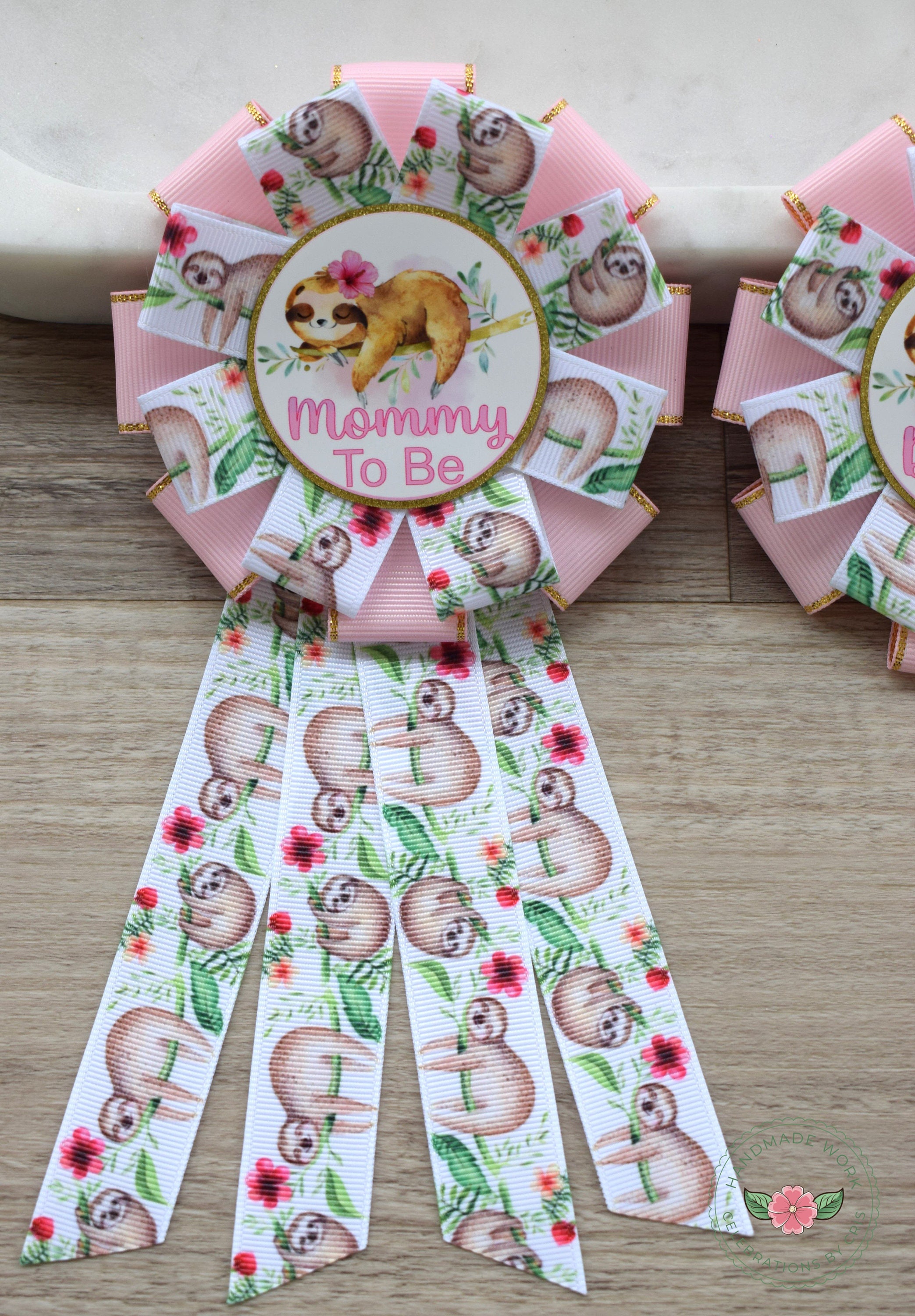 Girl Sloth Baby Shower, Sloth Mommy to Be Ribbon Pin, Sloth Baby Shower Pin, Sloth Greenery Daddy To Be Pin