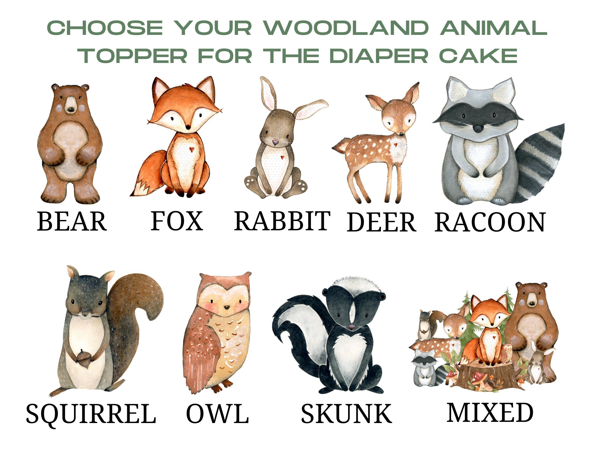 -. This DIAPER CAKE is decorated with woodland colors in sage green, cream & browns.