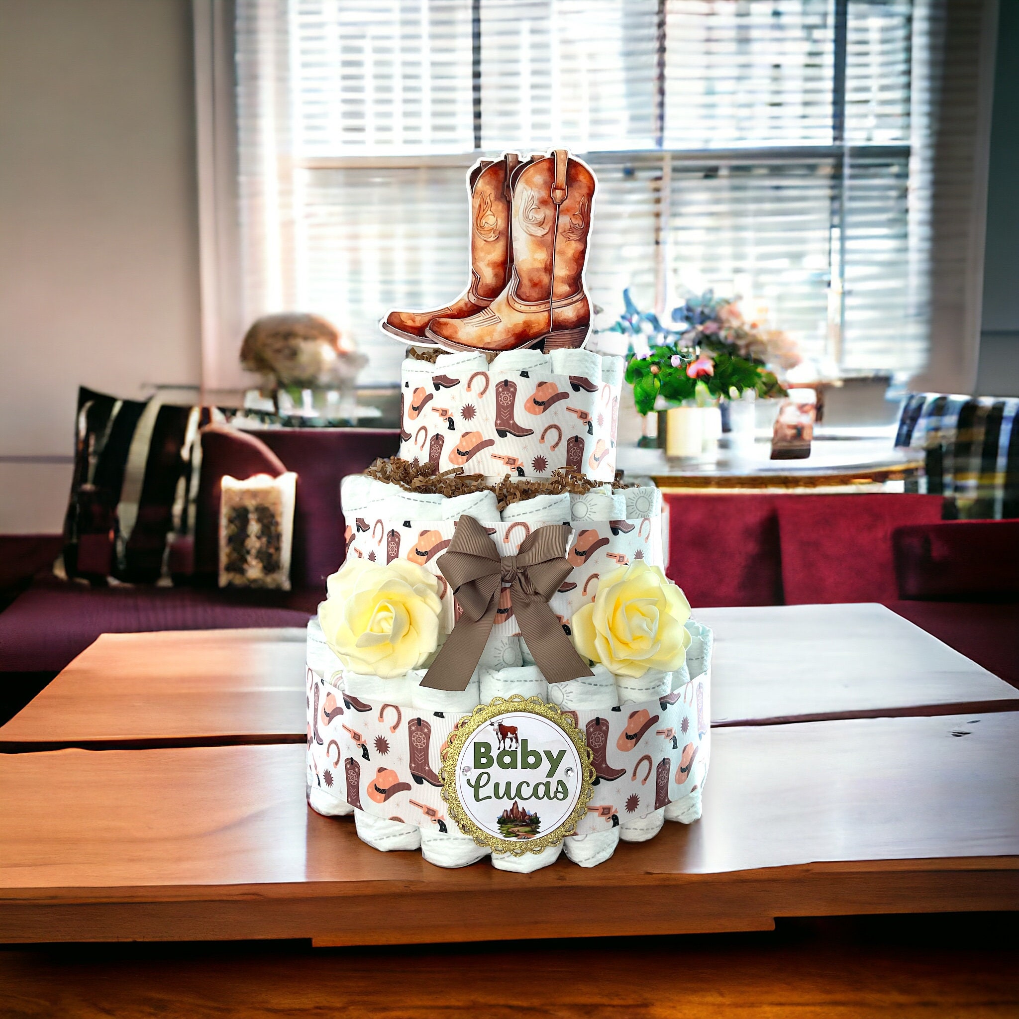This Gorgeous Cowboy Diaper 3 Tiers Cake are the perfect centerpieces for your baby shower. We can match any shower theme.